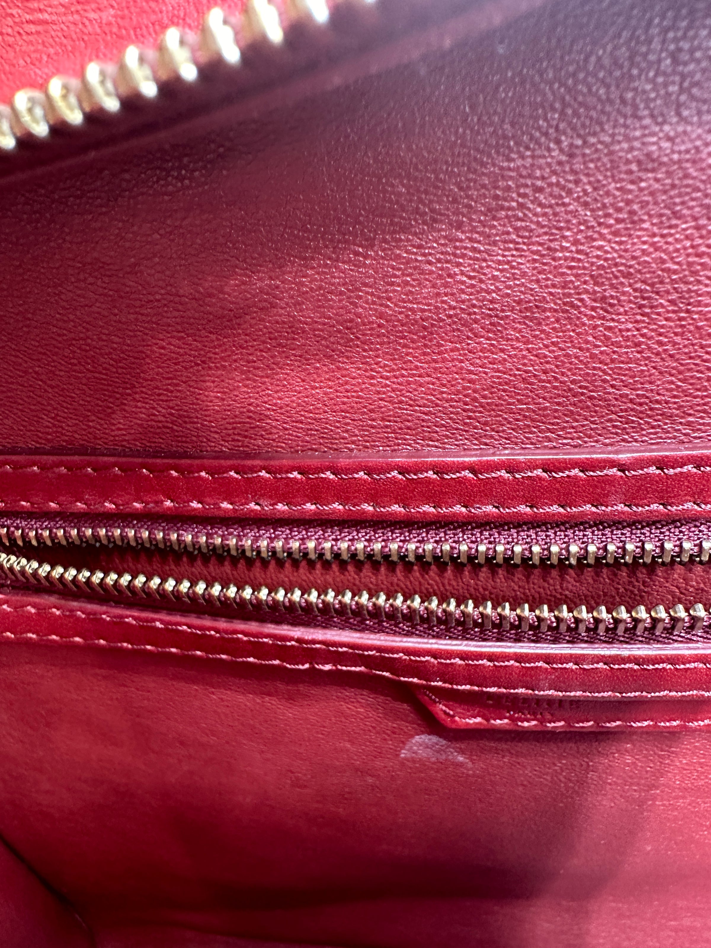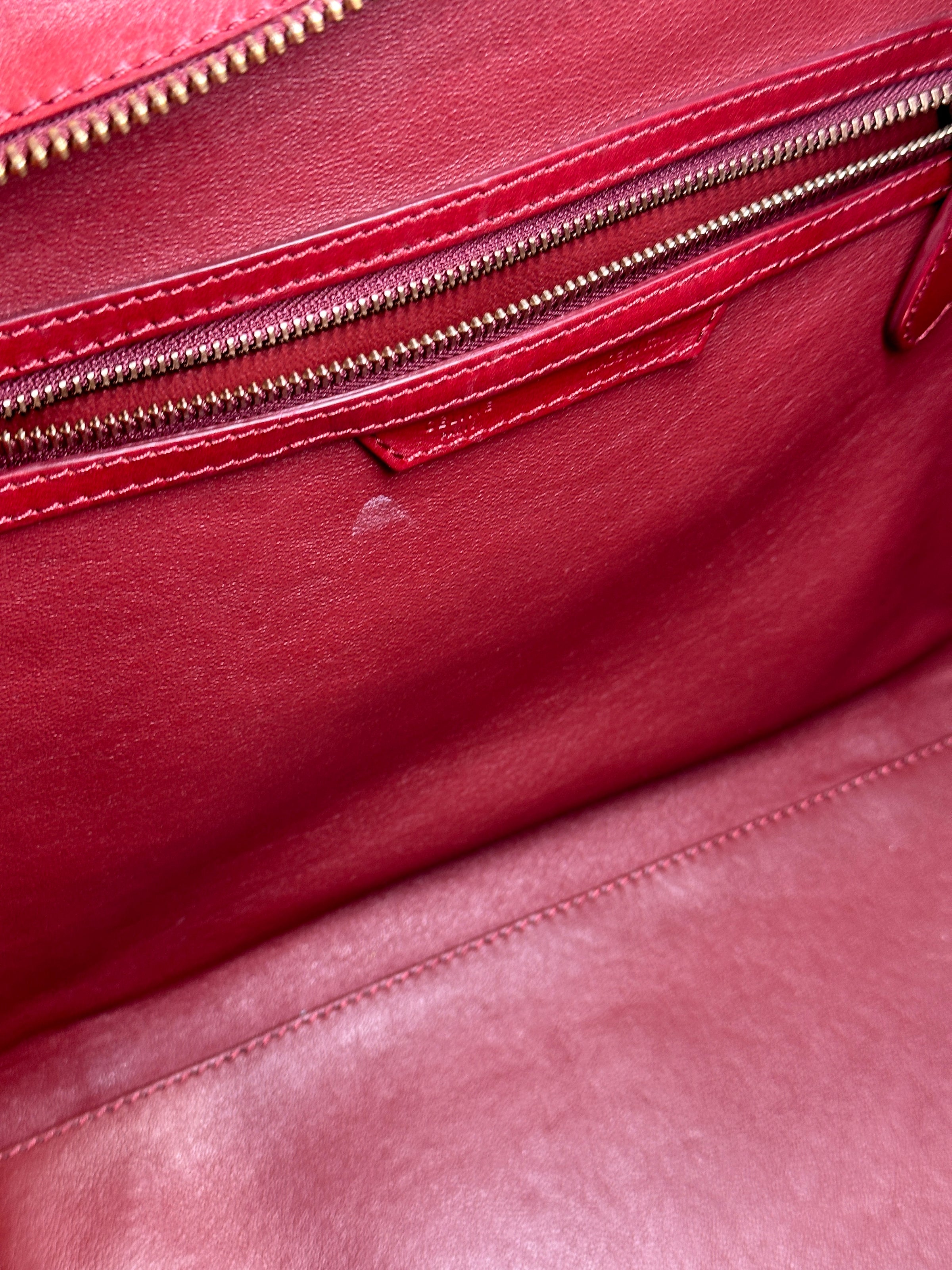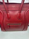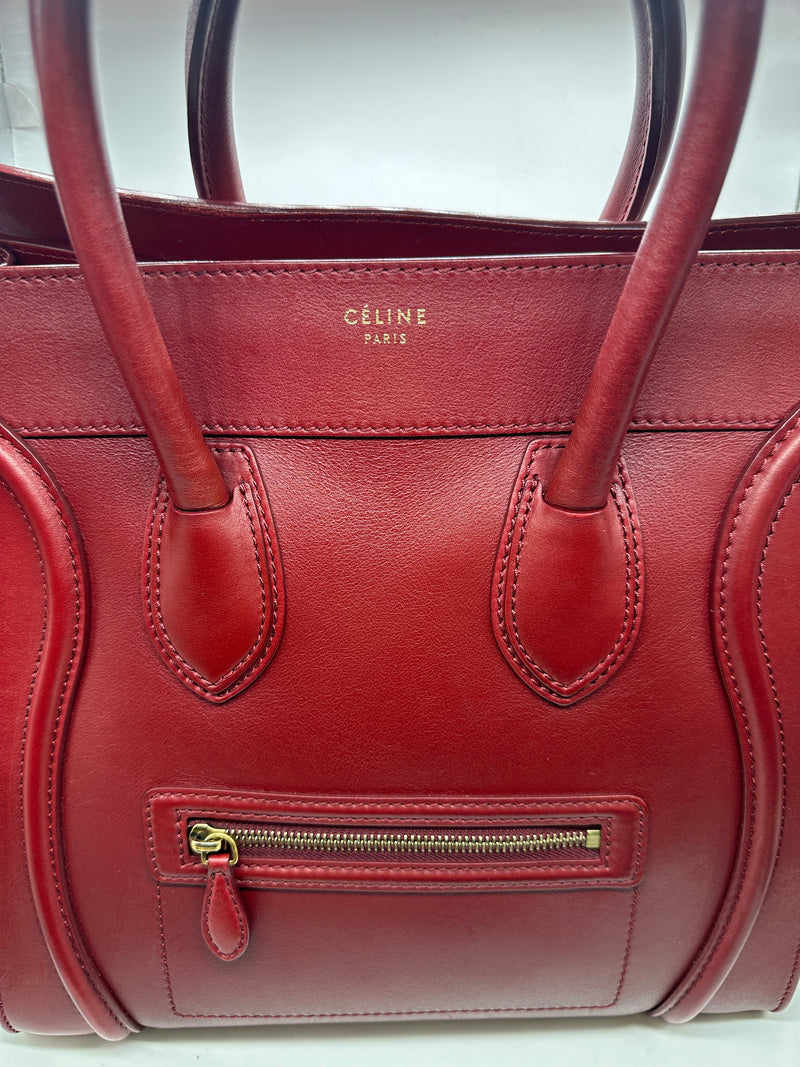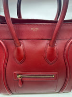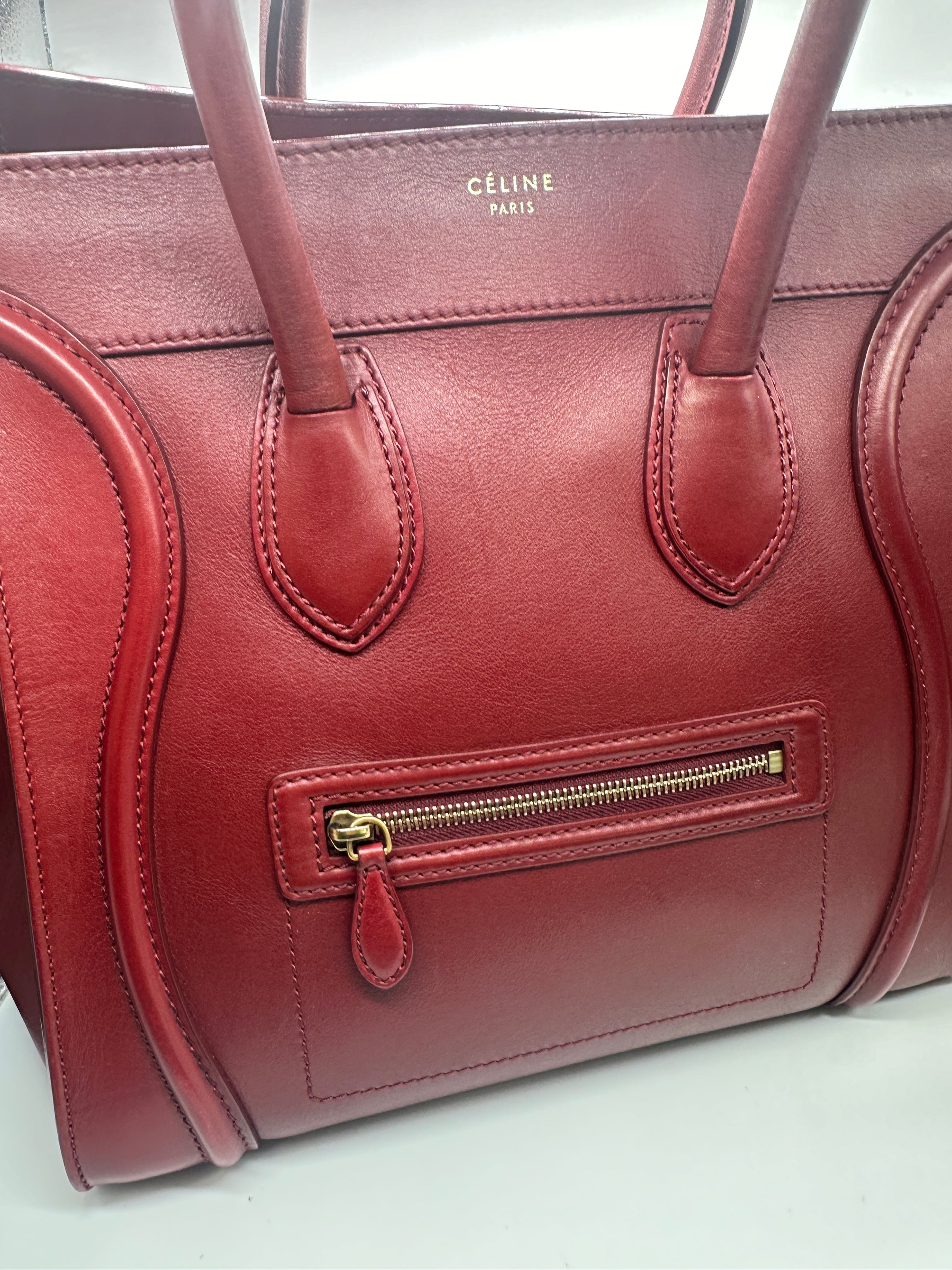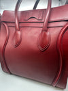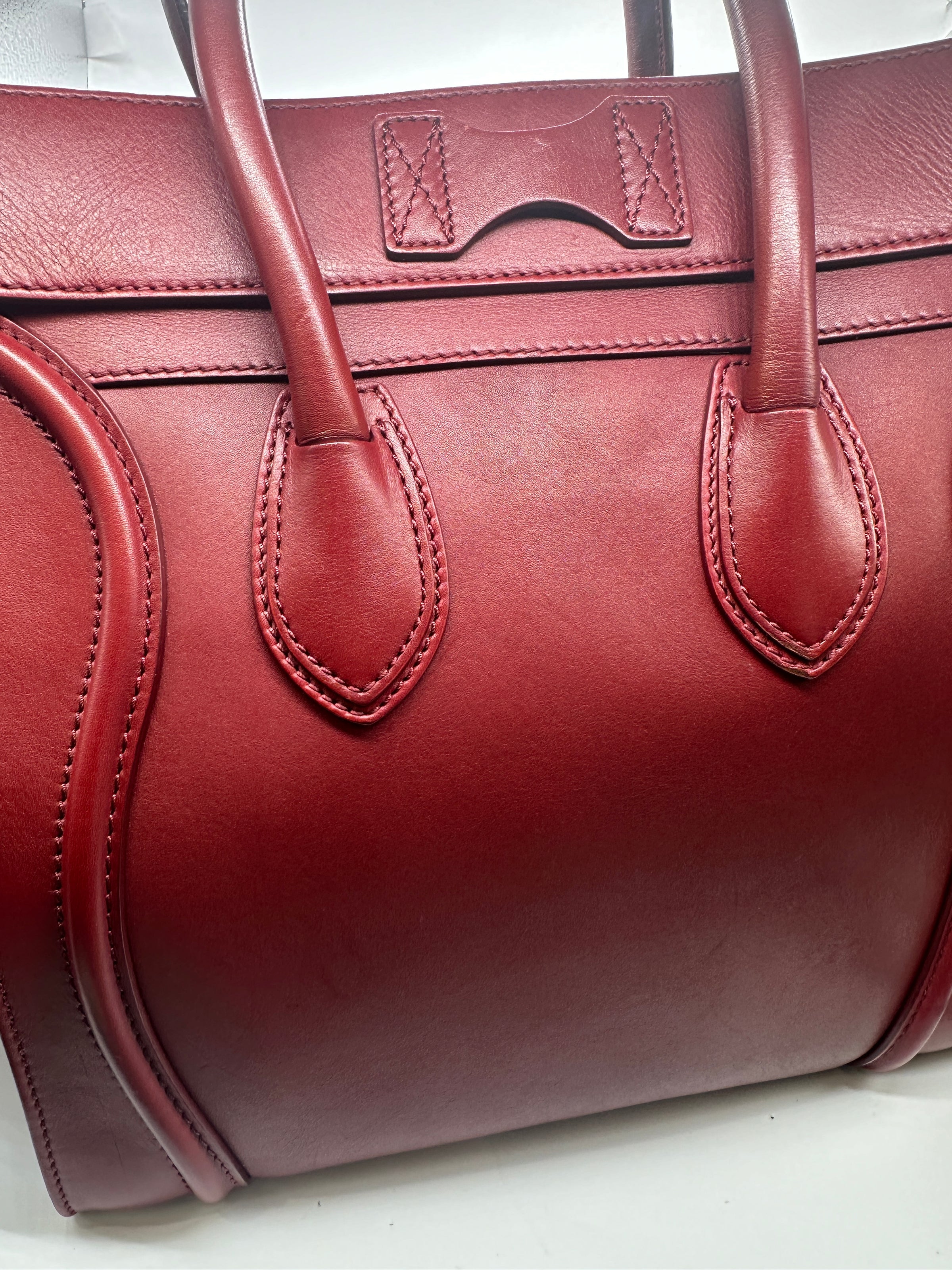 The Celine Luggage Tote in wine red is a testament to the brand's commitment to luxury and innovative design. Crafted from high-quality leather, this handbag features a distinctive front face with curved stitching and a subtle smile-like appearance. The rich wine red hue adds a touch of sophistication, making it a versatile accessory for various occasions.