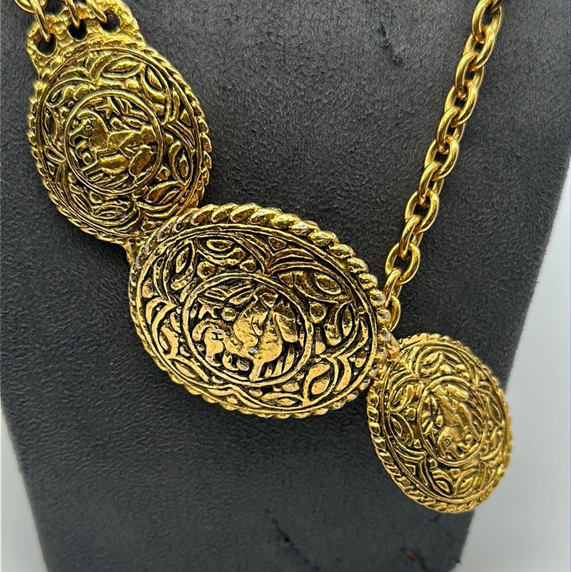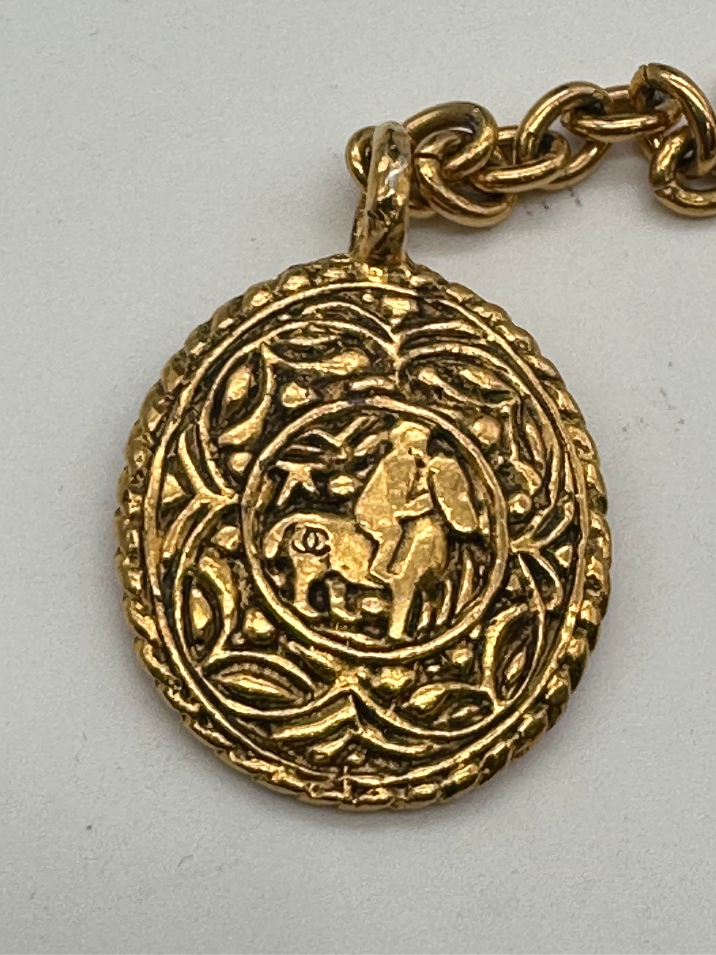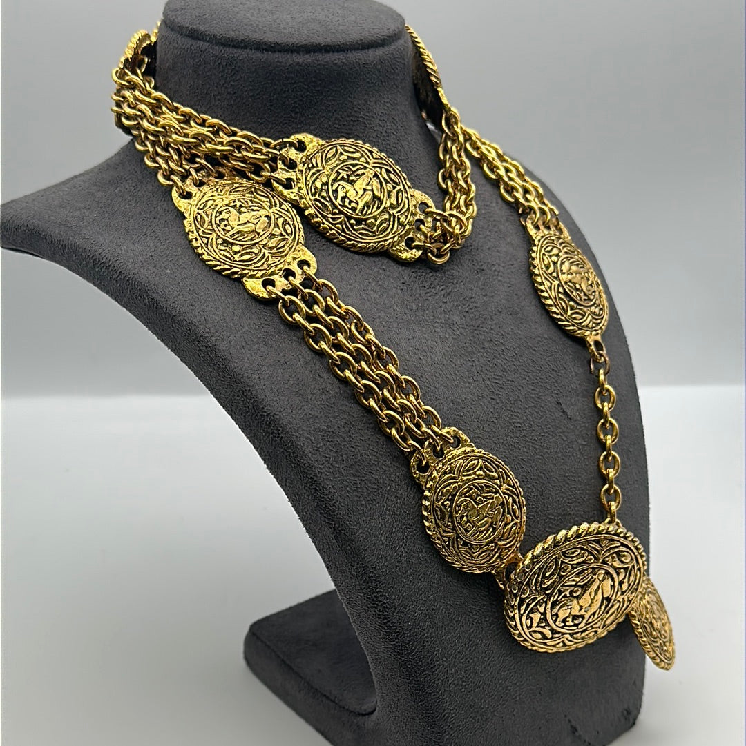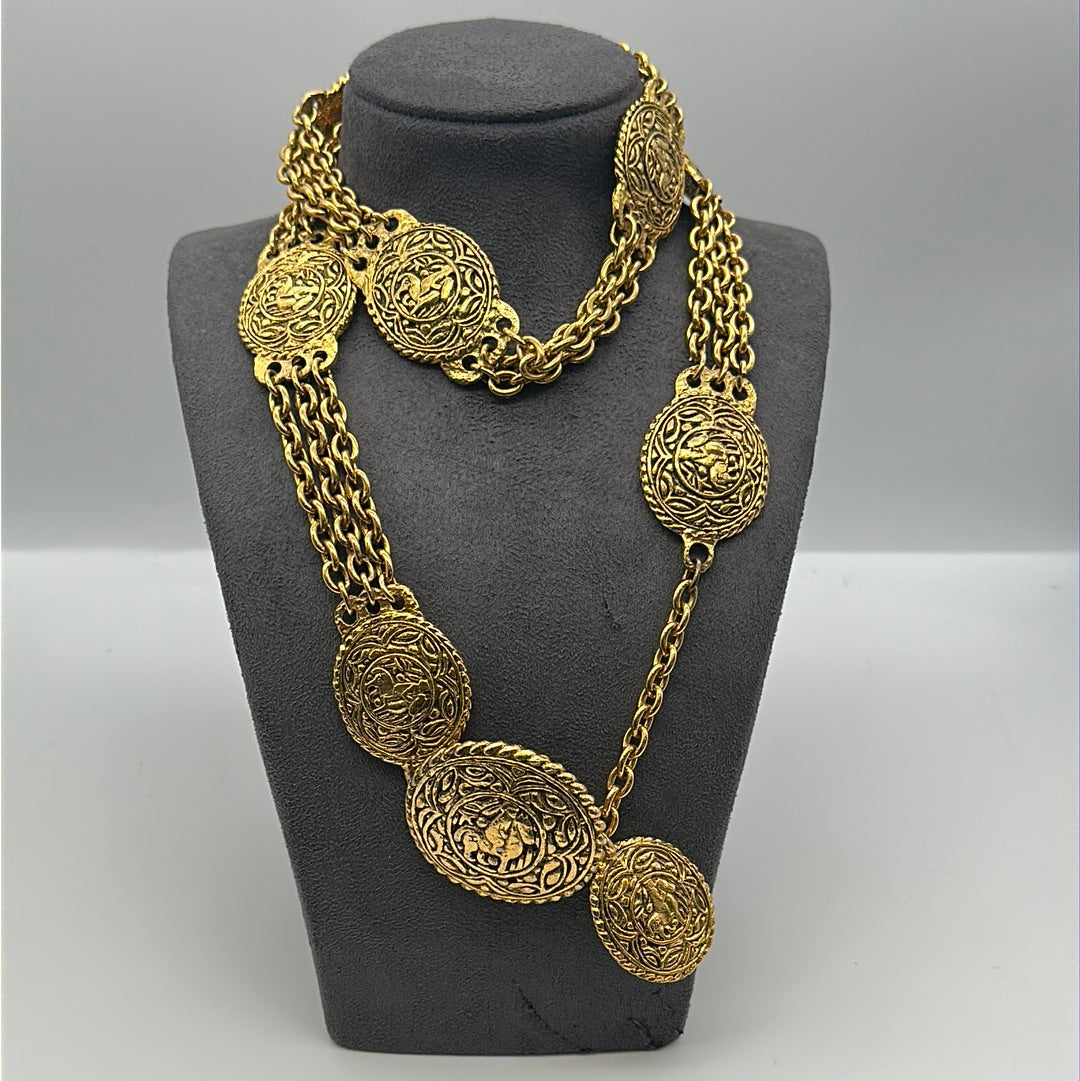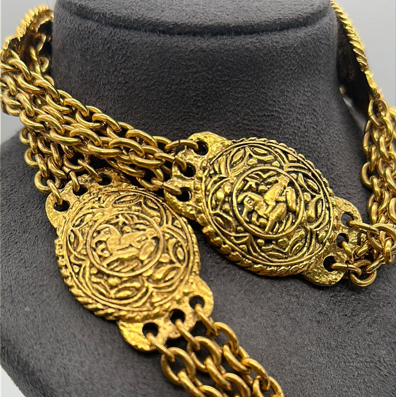 Gold plated 40 year old vintage Chanel belt with 3 rows of small belcher links with ten large gold engraved discs with a horse and rider, the CC logo can be found on the back of the horse, this can also be worn as a necklace.