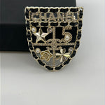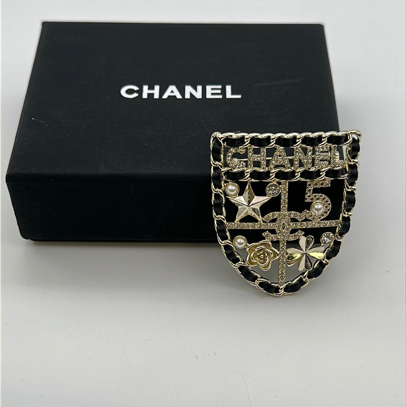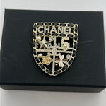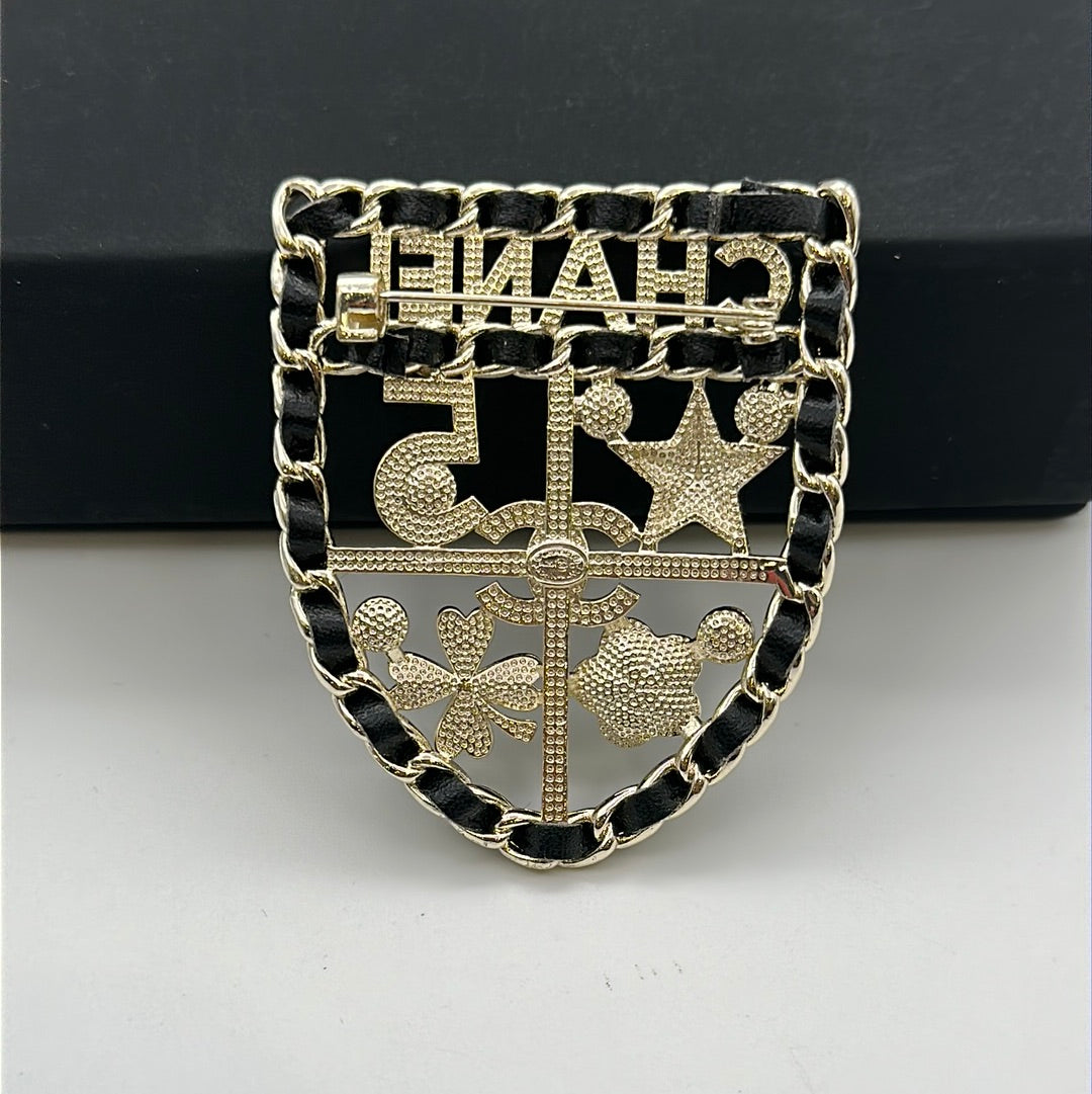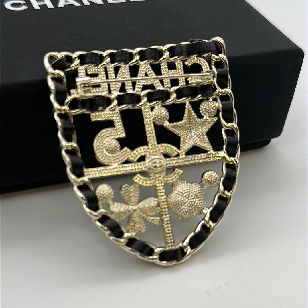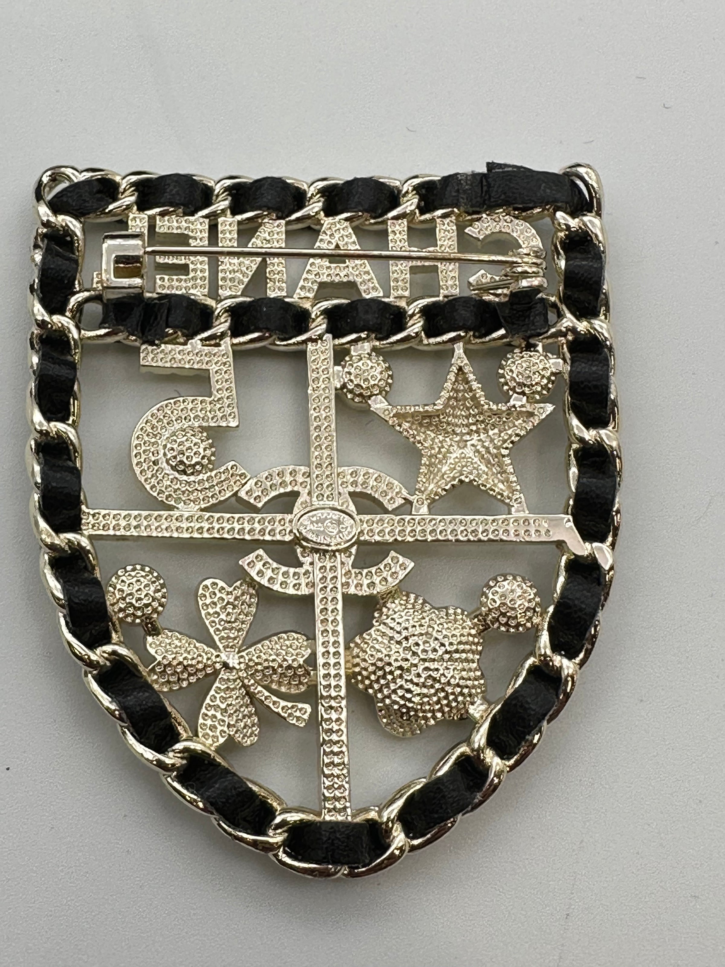 Chanel Shield Brooch Reworked, Gold Plate, Leather, Crystals And Pearls
