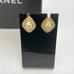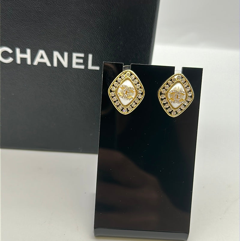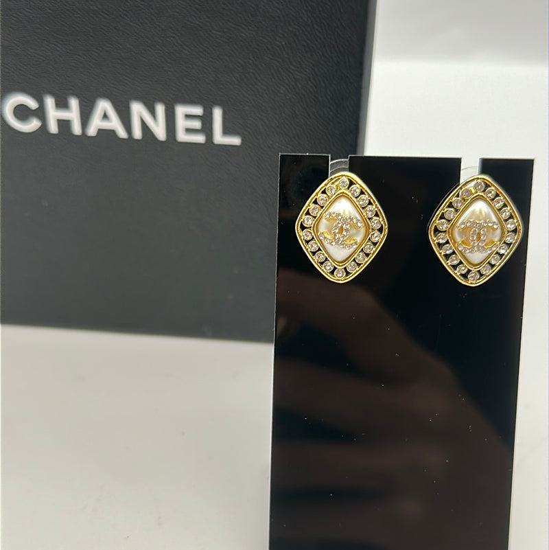 These stunning Pearl Stud Earrings Are Surrounded By Crystal in Yellow Gold Plate With The Iconic CC Logo