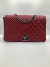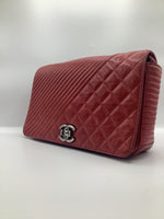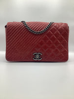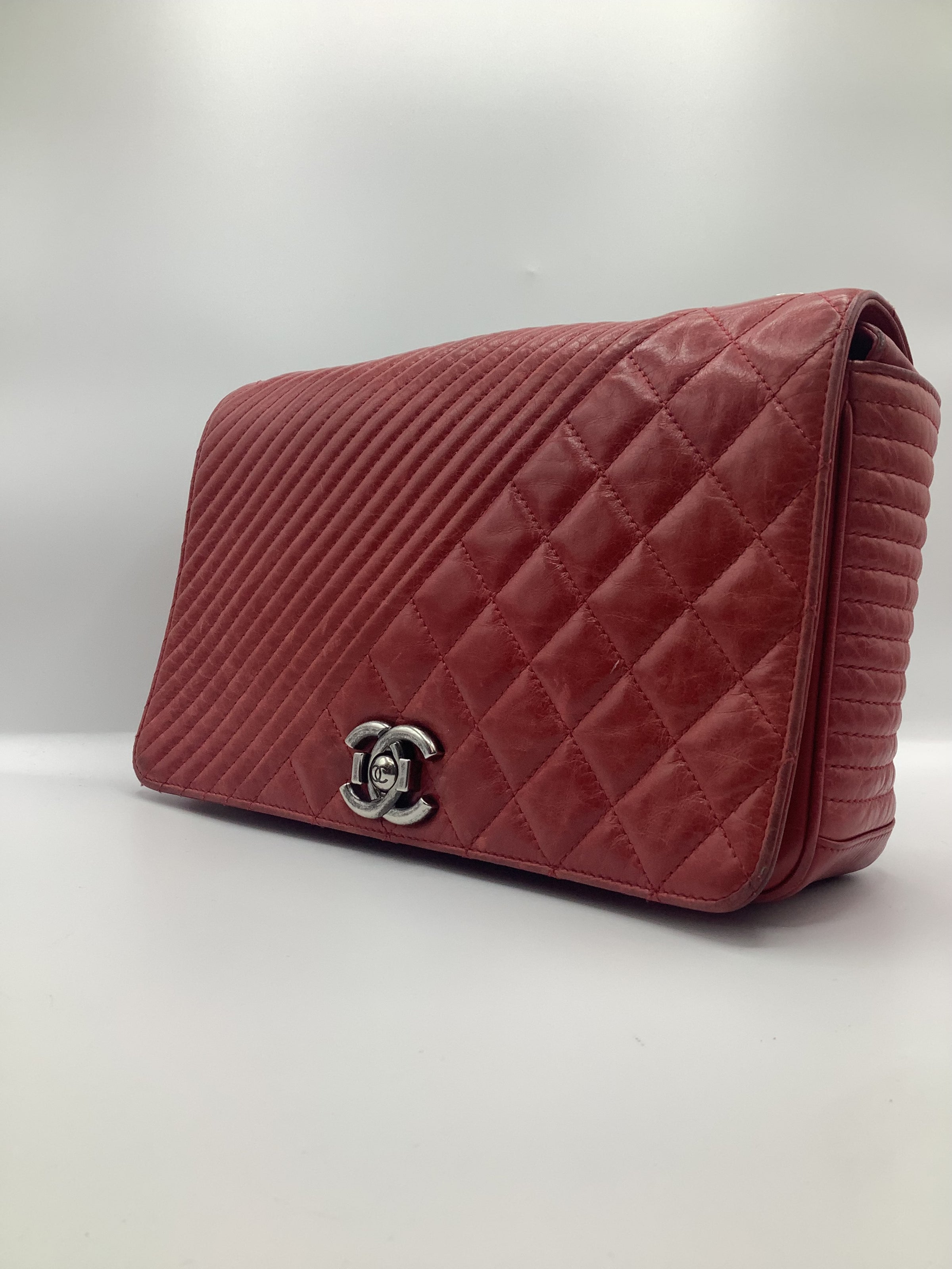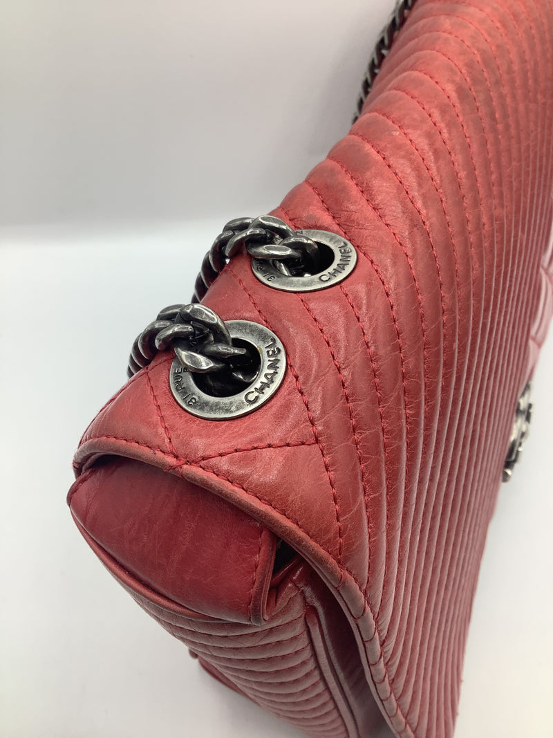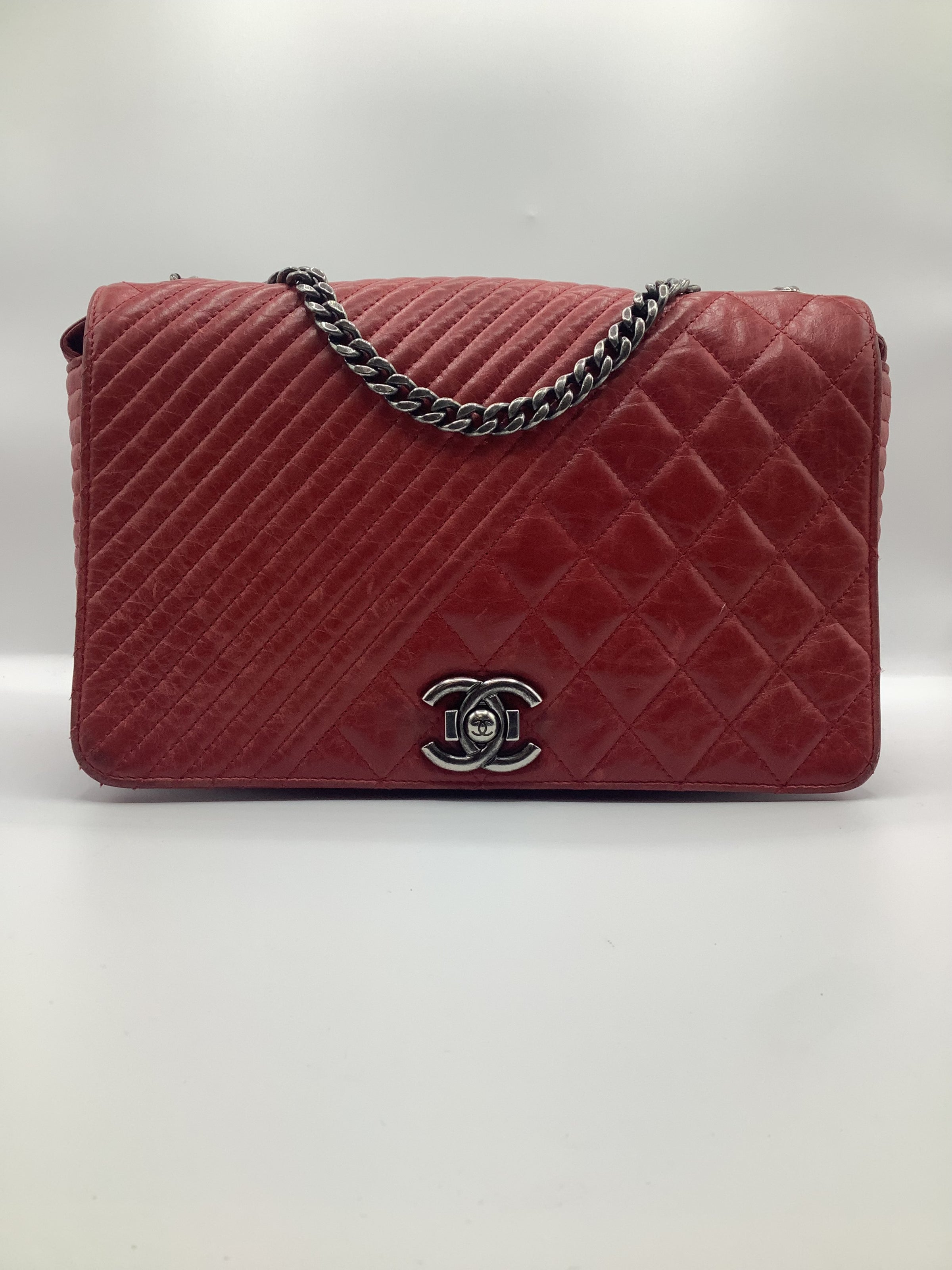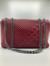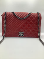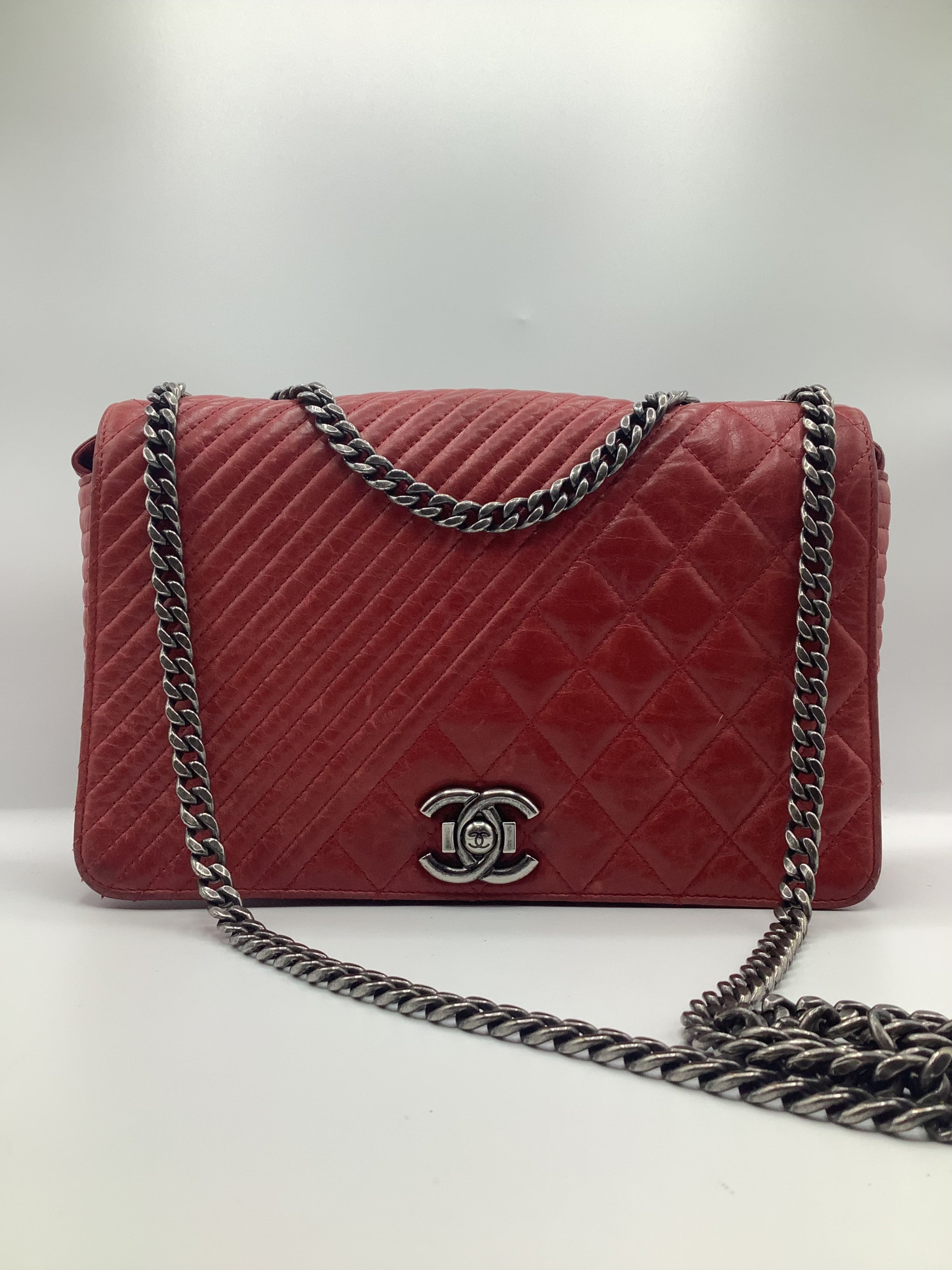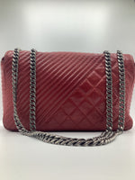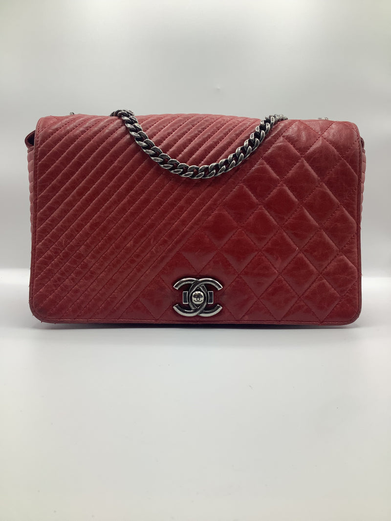 This Beautiful Chanel Coco Boy Flap Bag Quilted Aged Calfskin Medium, crafted from red quilted aged calfskin leather, features chain strap, CC Boy clasp at the front and aged silver-tone hardware. Its Boy push-lock closure opens to a burgundy fabric interior with a zip pocket.