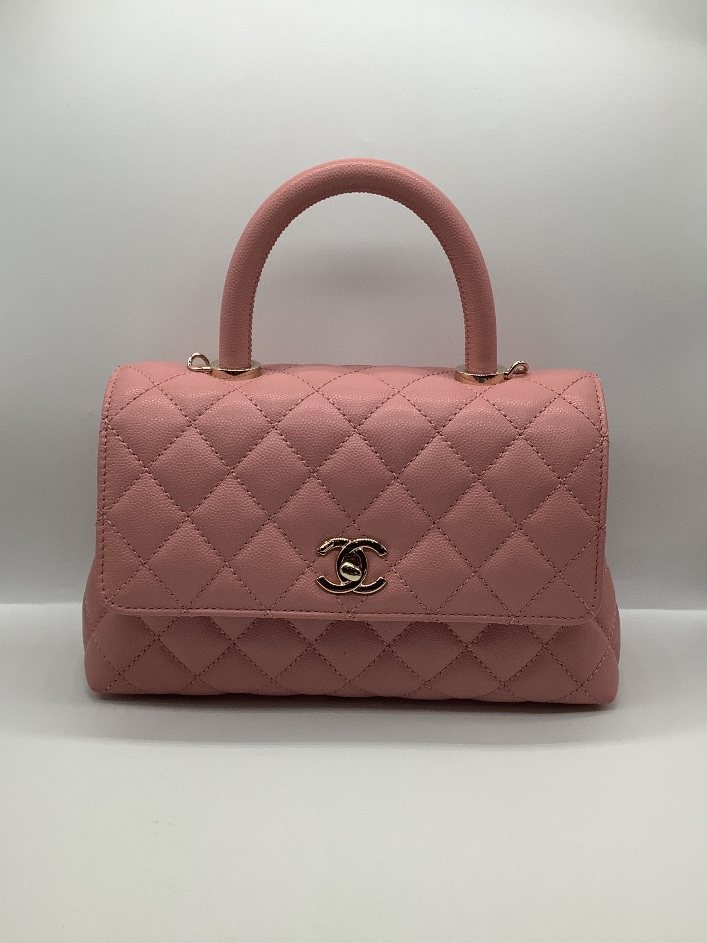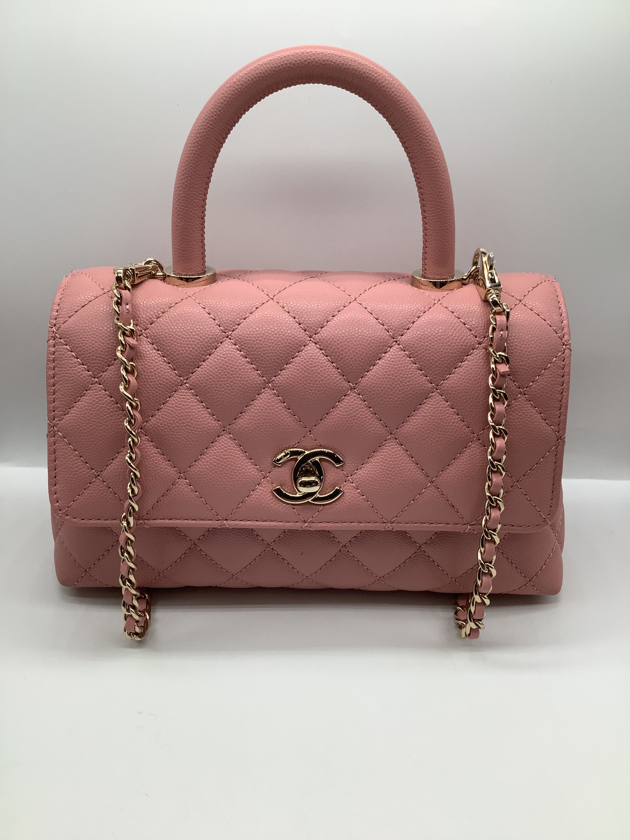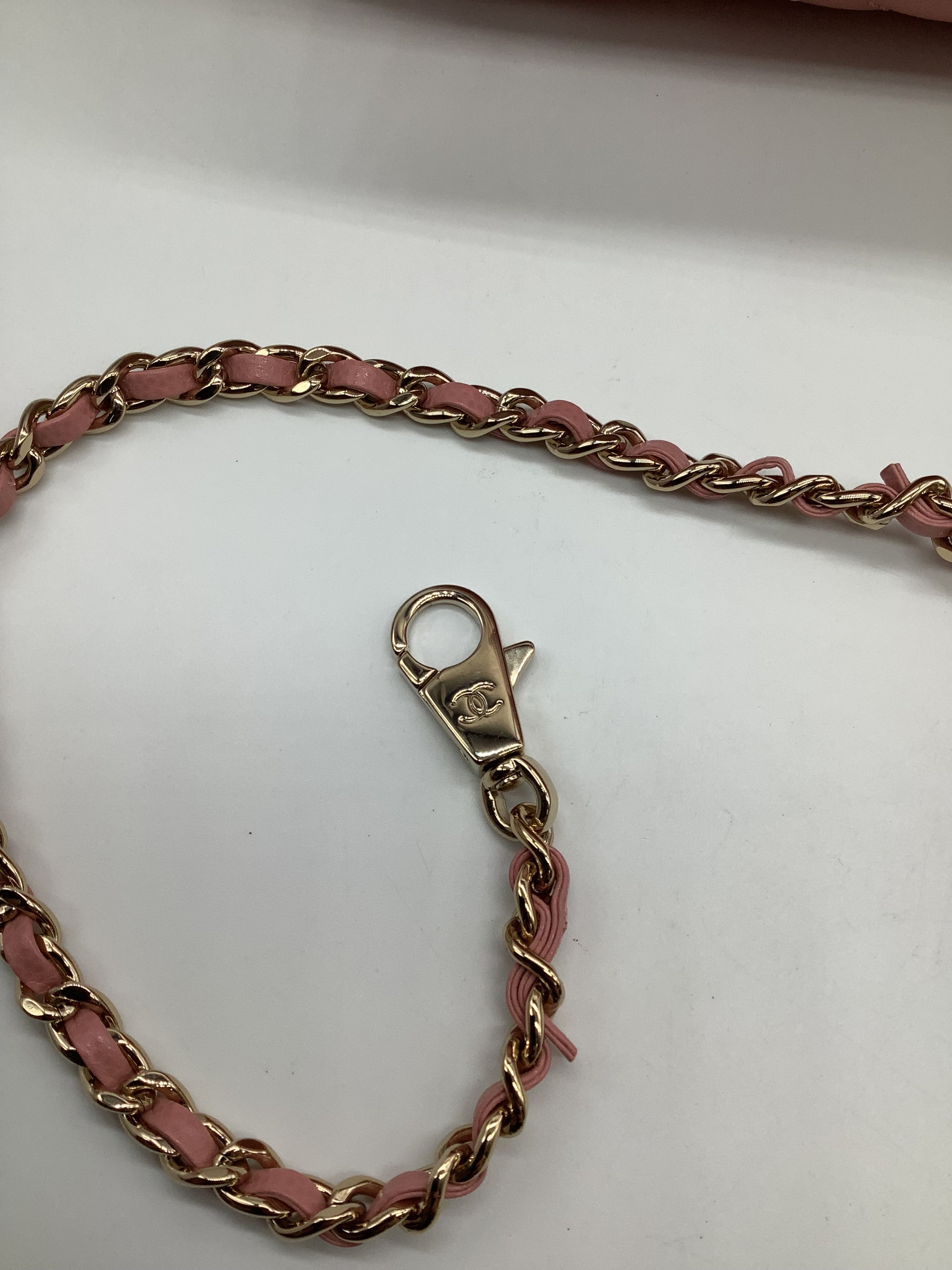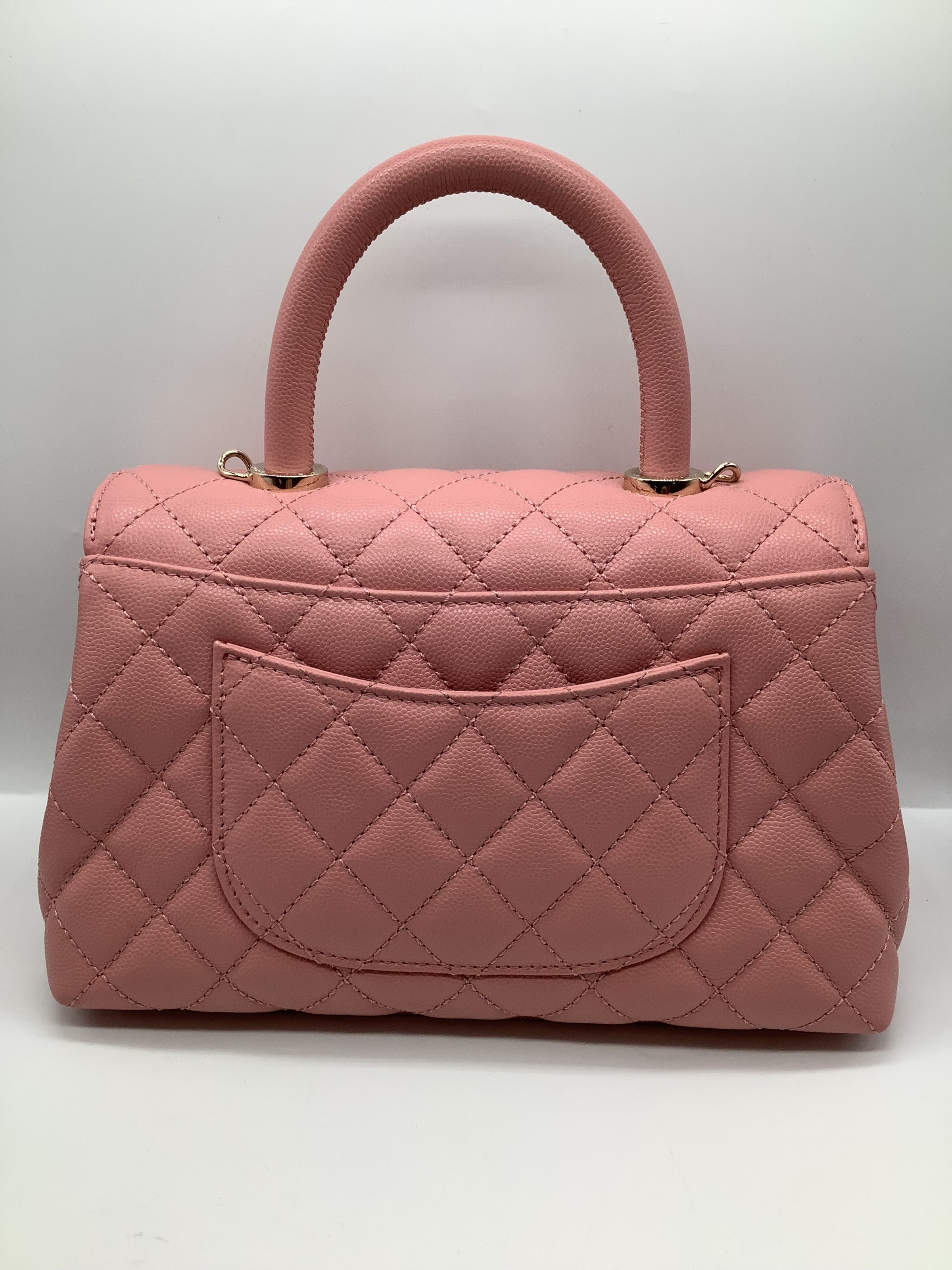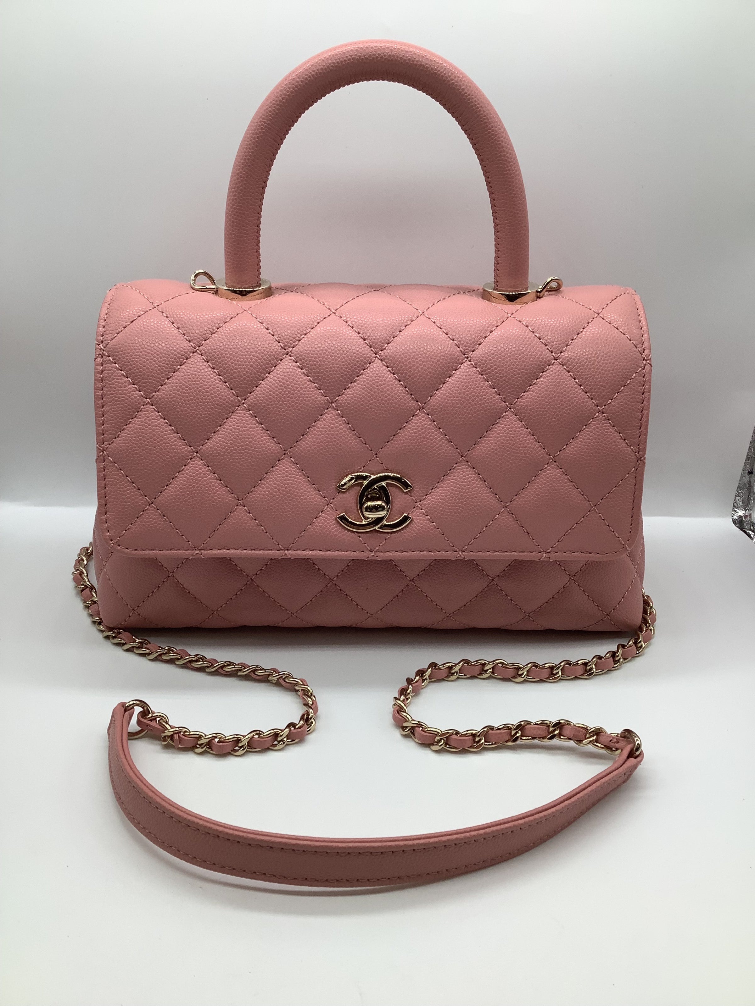 This mini Chanel rectangular Flap Bag with Top Handle is in Pink Chanel Caviar Lambskin with light gold tone hardware has a front flap with signature Interlocking CC turnlock closure, rear half moon pocket, top handle and Detatchable Matching interwoven Pink leather and light gold tone chain link shoulder/crossbody strap.