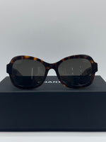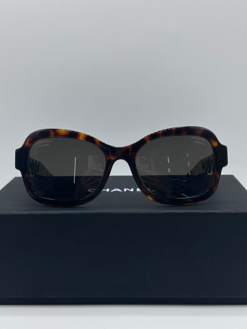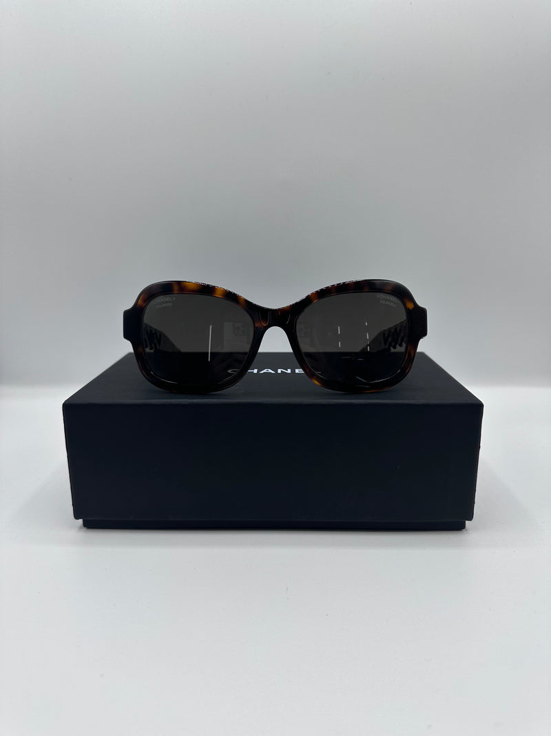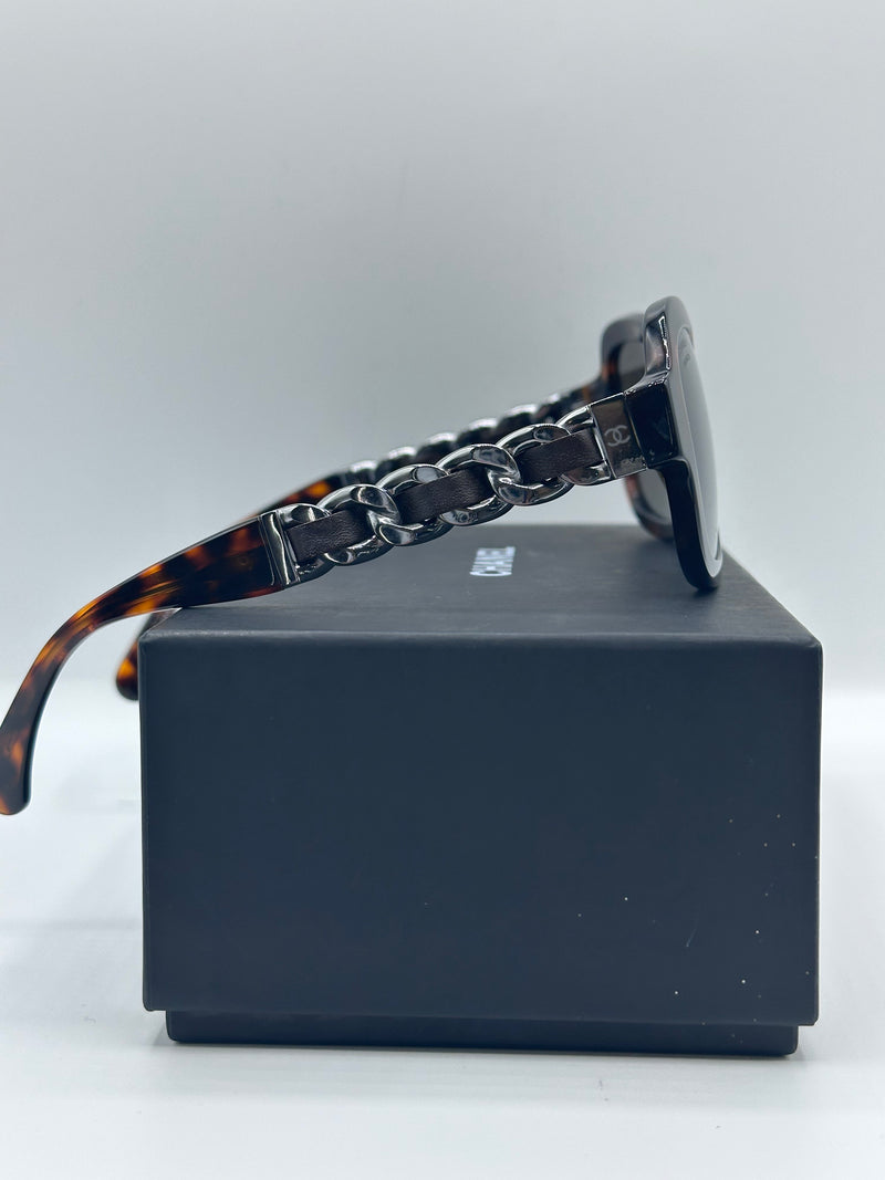 Add a touch of luxury to your look with these classic Chanel sunglasses. Crafted with a brown and black pattern, these timeless glasses have Cuban link and leather trims for a modern-yet-elegant aesthetic. This pair is brand new with an original box and holder.