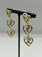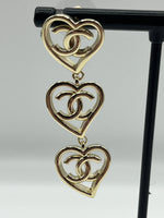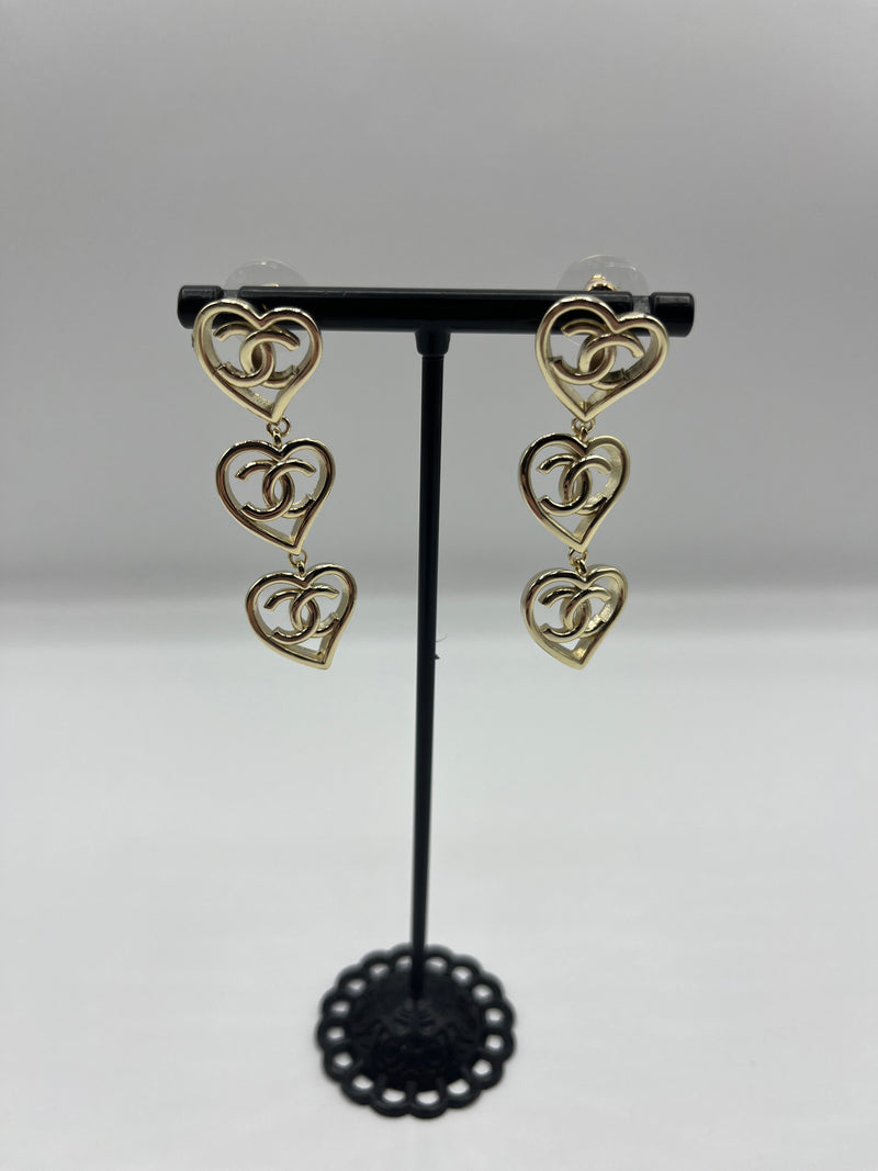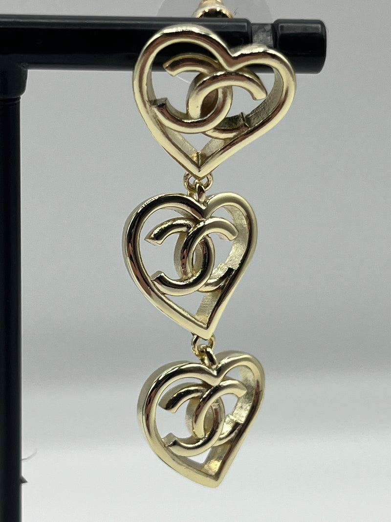 Materials & Design: These exquisite gold-plated Chanel drop earrings showcase a distinctive three-heart motif, each elegantly adorned with the iconic interlocking 'CC' logo. The design reflects Chanel's commitment to comfort, geometry, and clean lines, embodying the brand's timeless aesthetic.