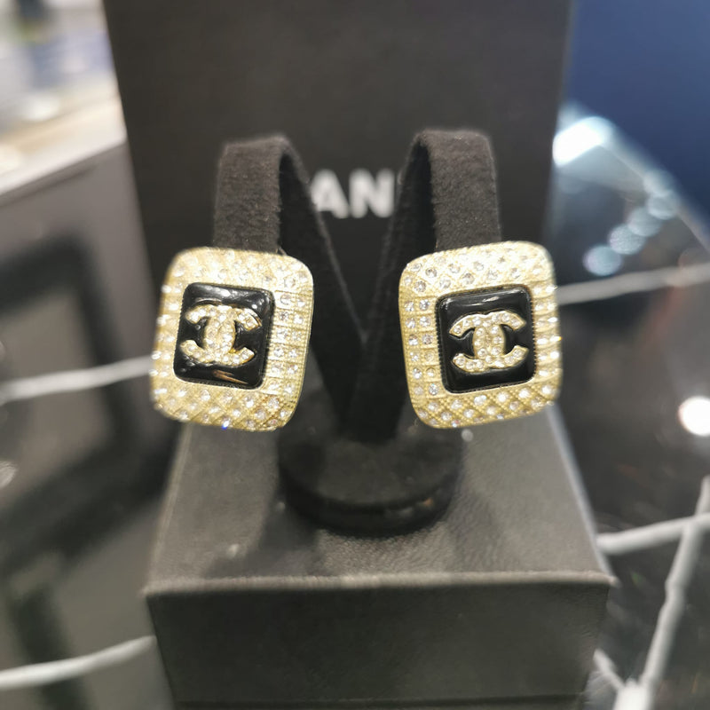 Materials & Design: These exquisite reworked Chanel earrings feature the iconic interlocking 'CC' logo, meticulously crafted in gold-plated metal. The design is enhanced with black enamel detailing, providing a striking contrast that embodies timeless elegance. Adorned with clear crystals, these earrings exude sophistication and add a touch of glamour to any ensemble.