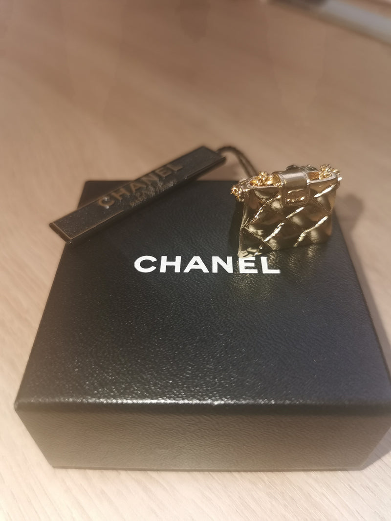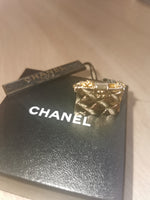This vintage Chanel brooch is beautifully gold-plated and features a miniature handbag charm—an homage to the Maison’s iconic quilted flap bag. The handbag is detailed with Chanel’s signature quilting and is suspended from fine gold-plated chains, giving the piece movement and a touch of playful elegance. Measuring approximately 5cm in length, it adds a chic accent to jackets, scarves, or blouses. -