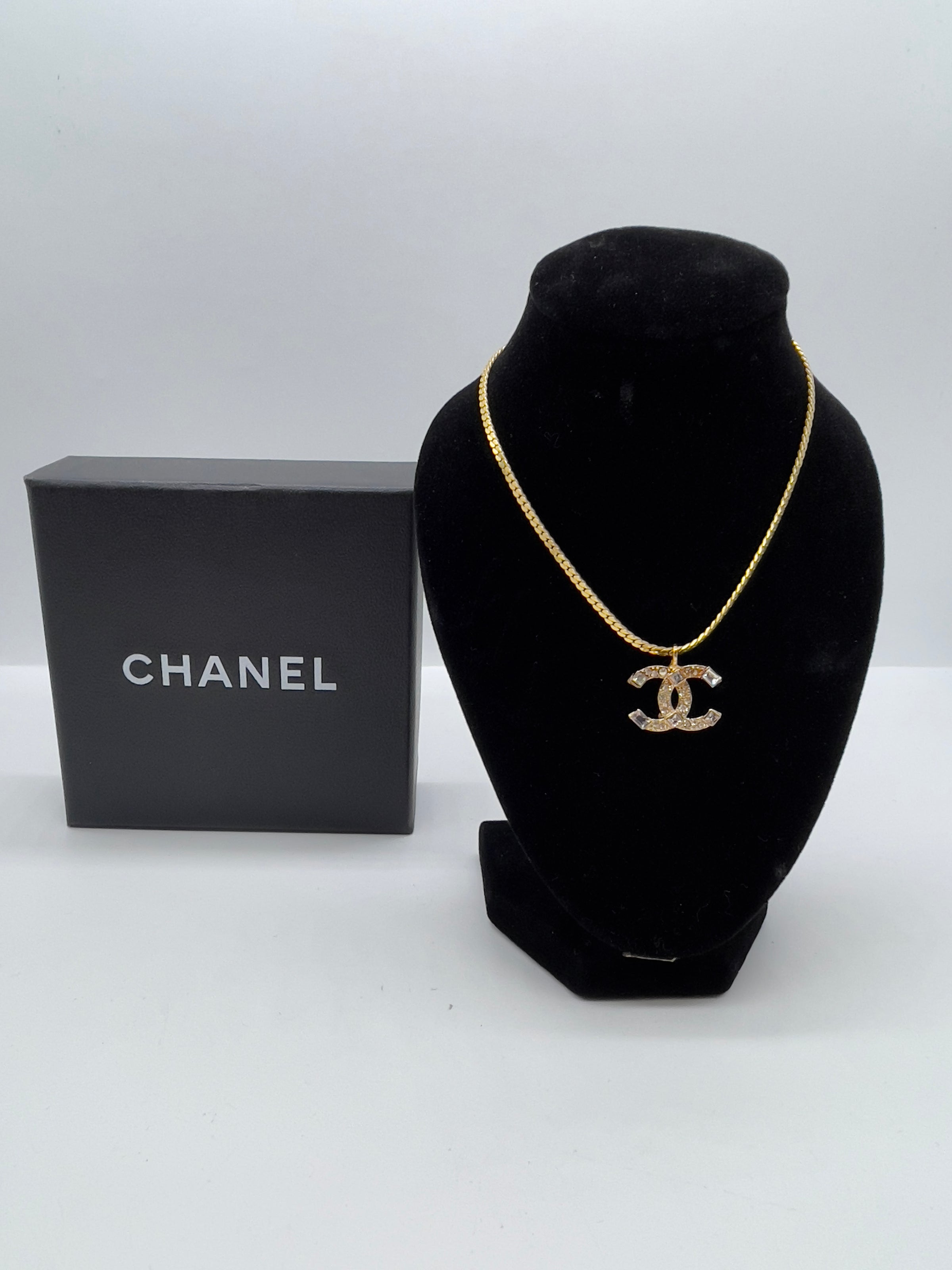 Chanel Gold Plated Iconic Interlocking C Logo Pendant, with Cubic Zirconia and Suspended on a Gold Plated Chain.
