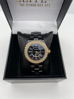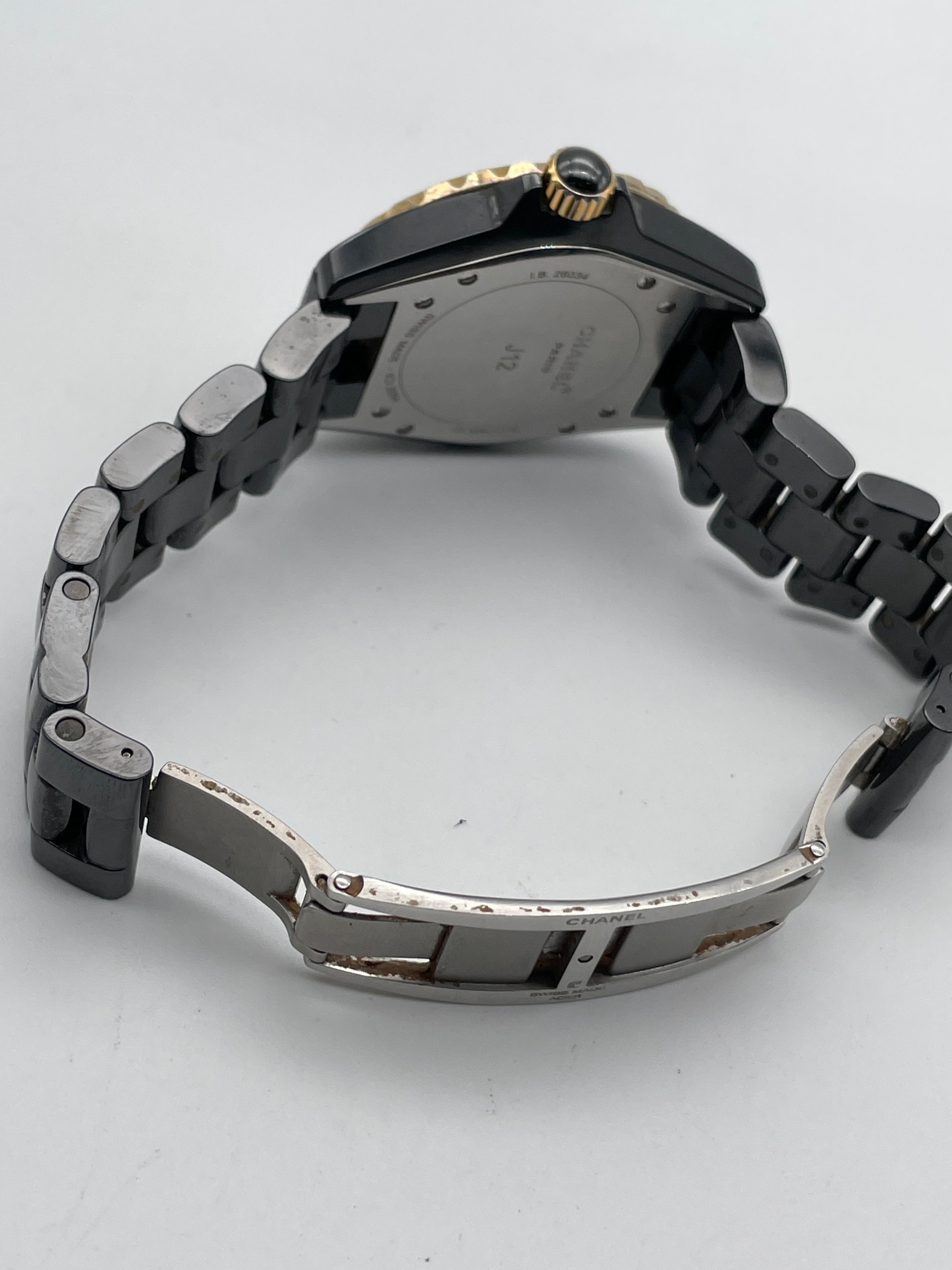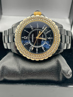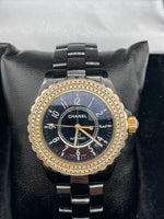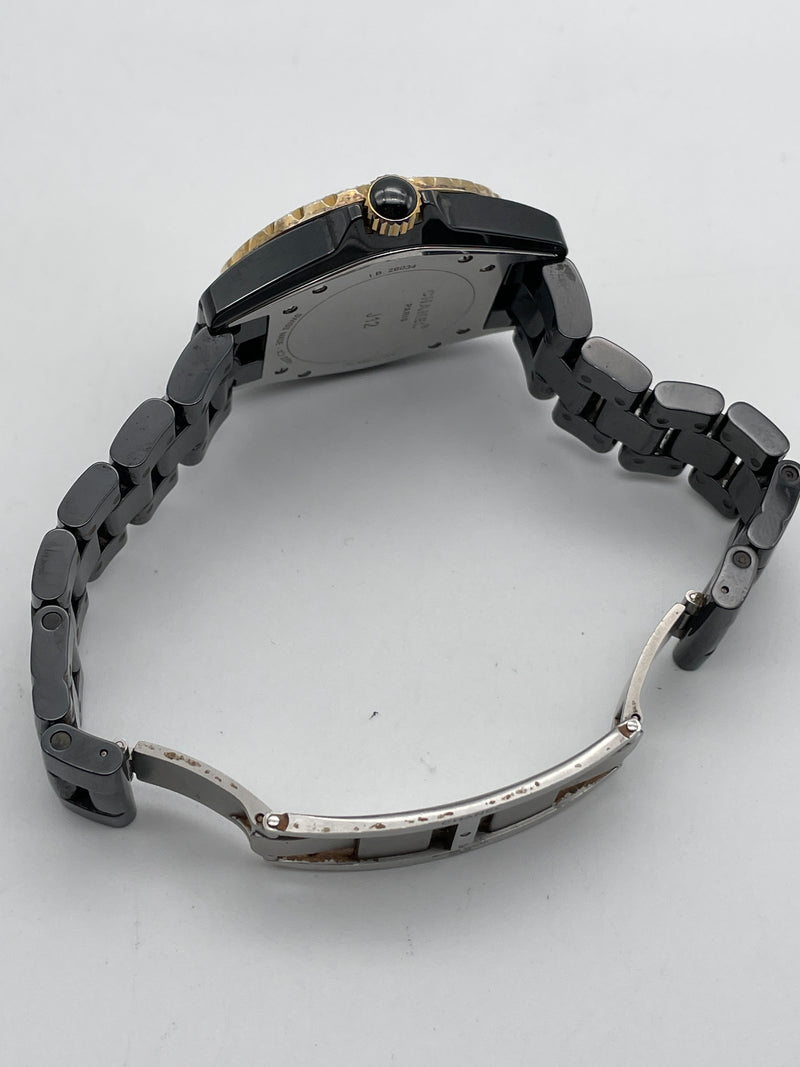 All black ceramic case. Steel rimmed & black ceramic bezel. All black ceramic bracelet. Black lacquered dial with applied white Arabic Numeral hour markers. White hands with luminescent hight-lights. Painted white minute & seconds track indexes. Luminescent Hour index markers. Date window located between the 4 & 5 o'clock position. Chanel Caliber 12.1. Uni-Directional Rotating bezel. 200 water resistant. Hidden Folding Clasp. Automatic movement.