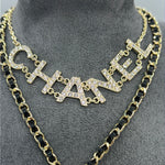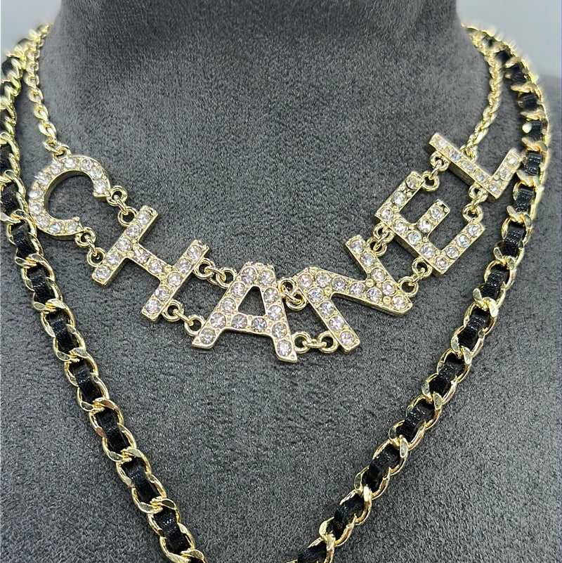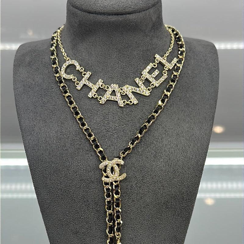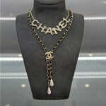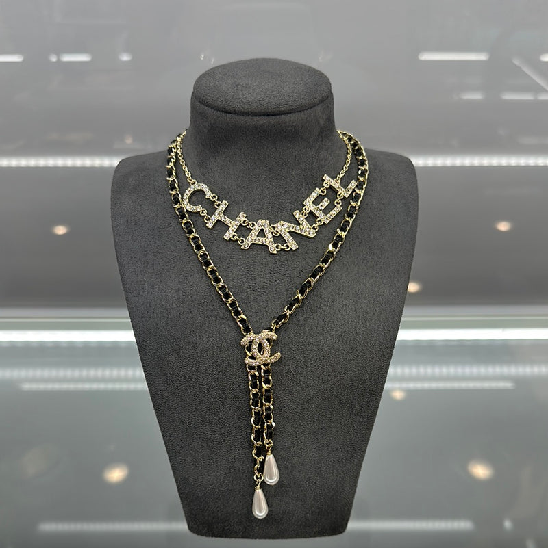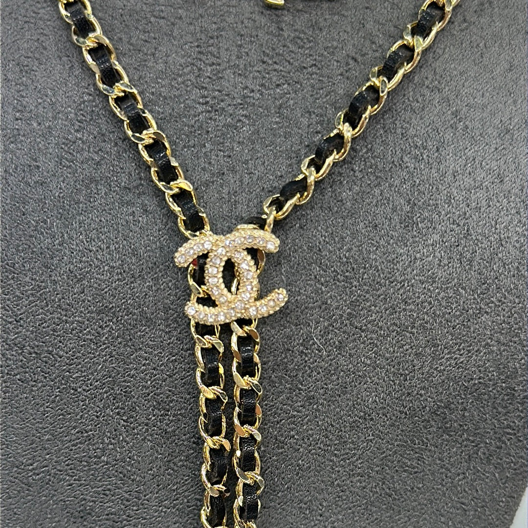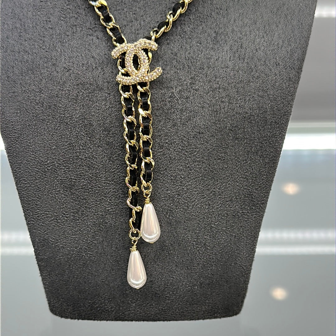 Chanel Double Row Statement Necklace, Classic CC Set In Crystals Securing 2 Drop Pearls On Leather And Gold Plate With The Logo Chanel Set In Brilliant Cut Crystals.