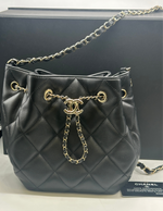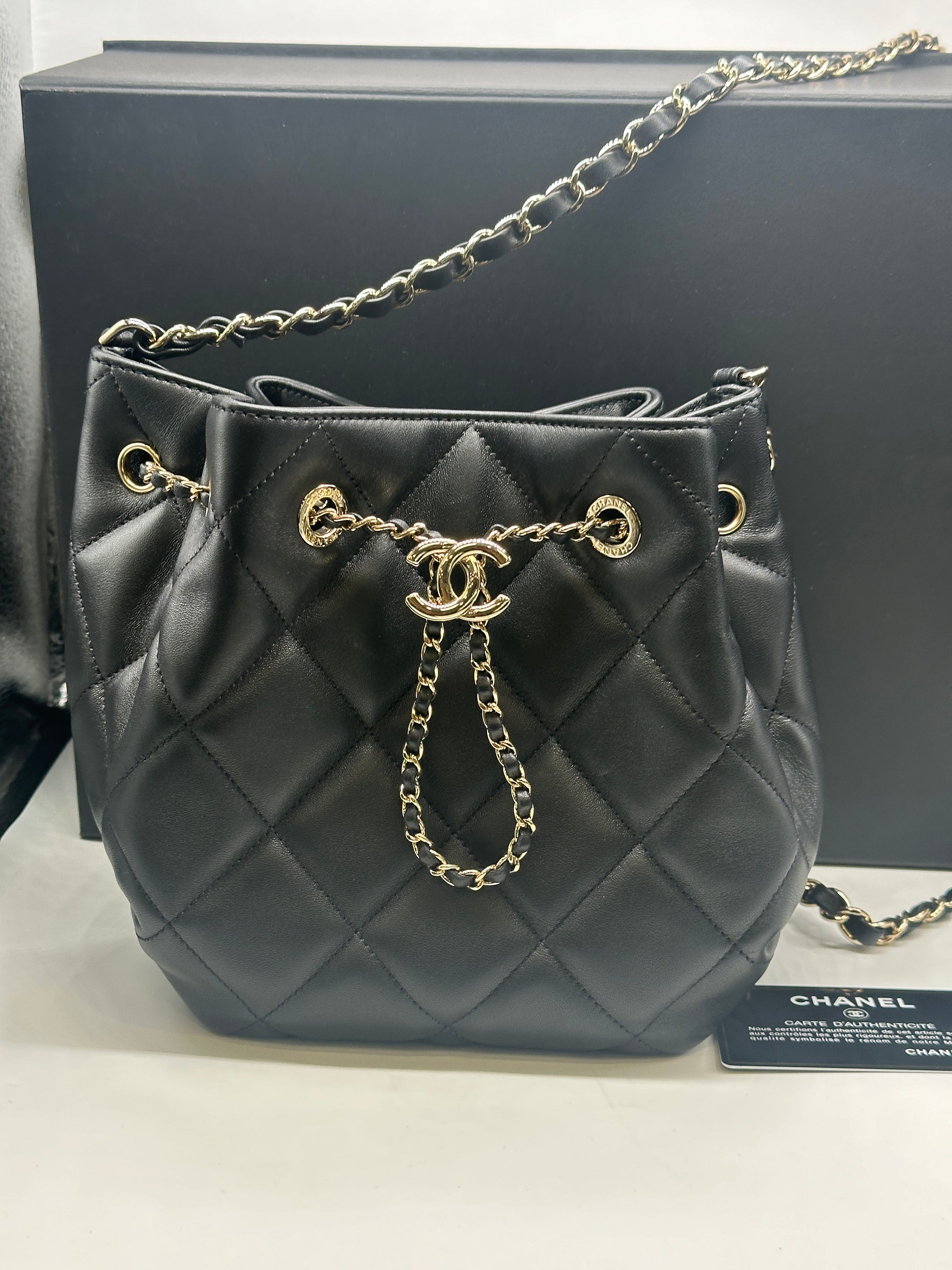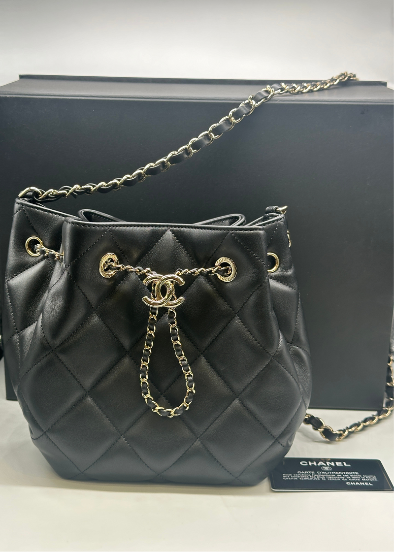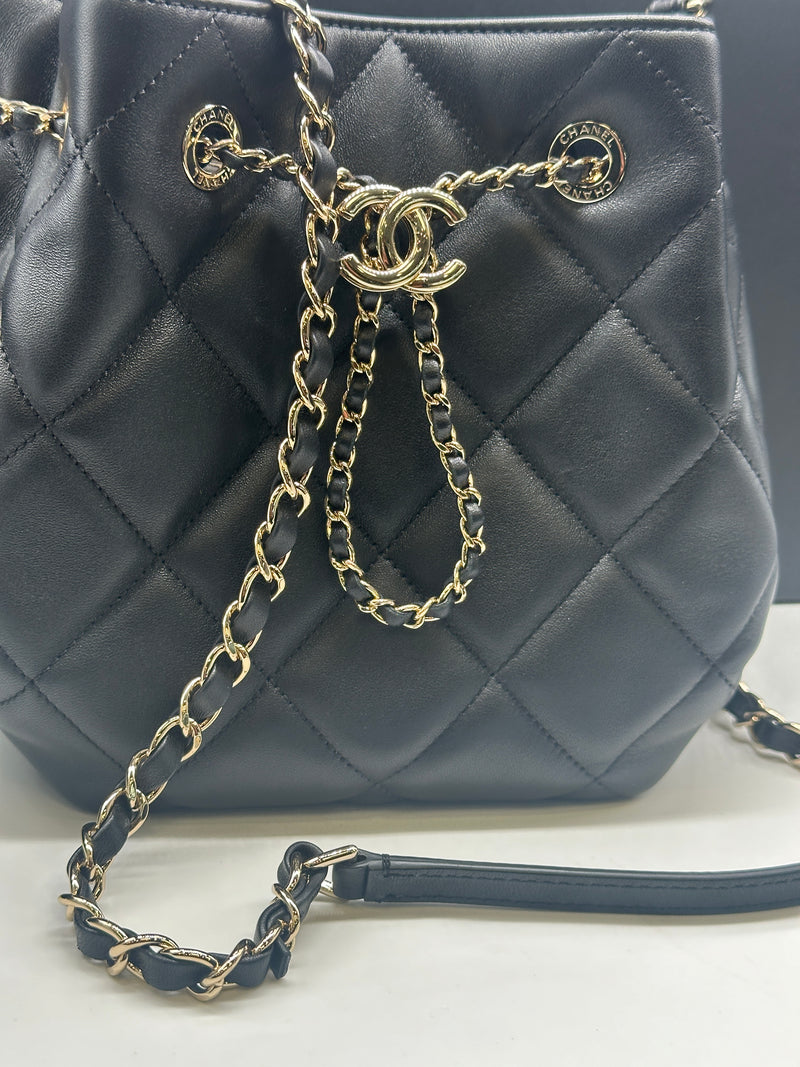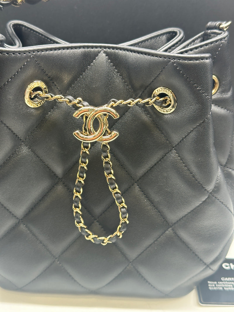 The Chanel Mini Bucket Drawstring Bag is a compact and stylish accessory that combines classic design with modern functionality. Crafted from high-quality materials such as quilted lambskin or caviar leather, this bag features the iconic CC logo and a drawstring closure for easy access. Its petite size makes it perfect for carrying essentials, while the adjustable chain strap allows for versatile wear as a shoulder or crossbody bag. Dimensions typically measure approximately 7 inches in height, 5 inches in width, and 5 inches in depth. The interior is lined with fabric or leather, depending on the model, and may include a small pocket for organization.