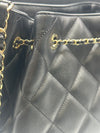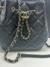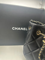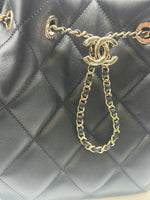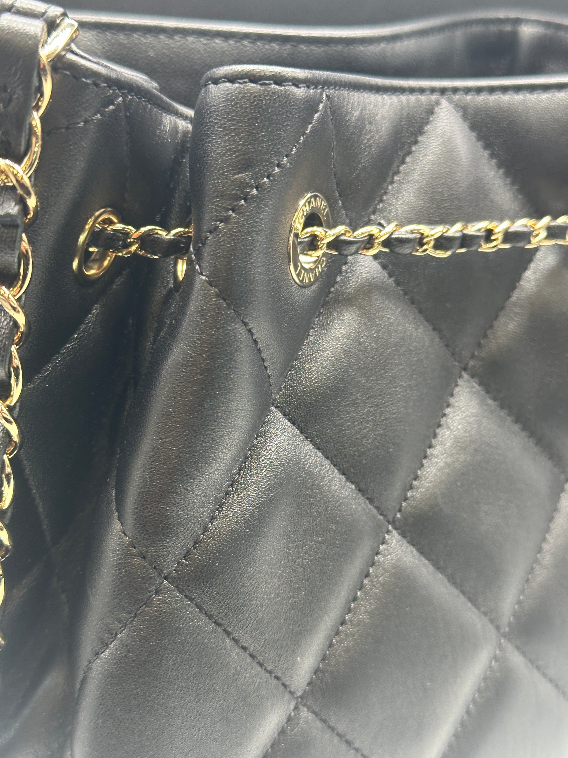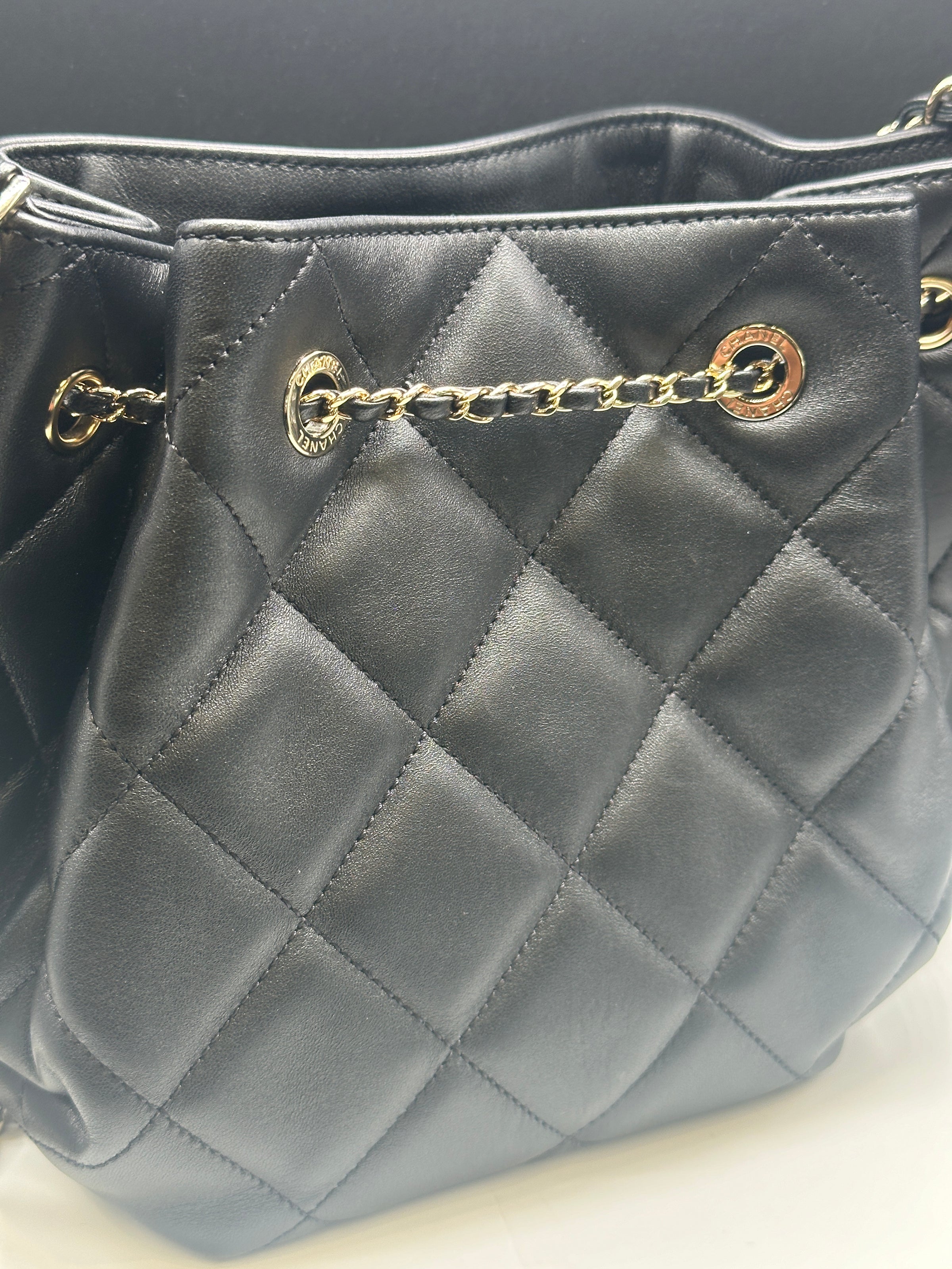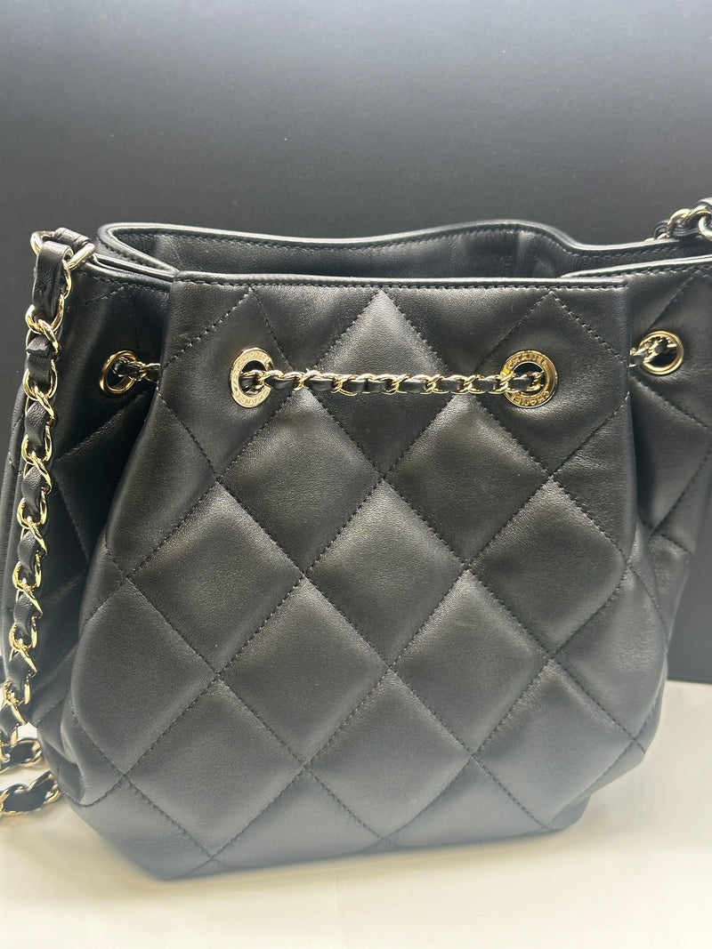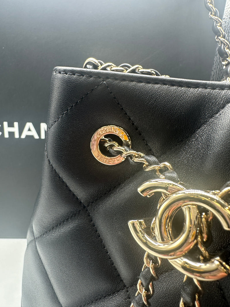 The Chanel Mini Bucket Drawstring Bag is a compact and stylish accessory that combines classic design with modern functionality. Crafted from high-quality materials such as quilted lambskin or caviar leather, this bag features the iconic CC logo and a drawstring closure for easy access. Its petite size makes it perfect for carrying essentials, while the adjustable chain strap allows for versatile wear as a shoulder or crossbody bag. Dimensions typically measure approximately 7 inches in height, 5 inches in width, and 5 inches in depth. The interior is lined with fabric or leather, depending on the model, and may include a small pocket for organization.