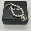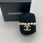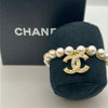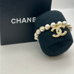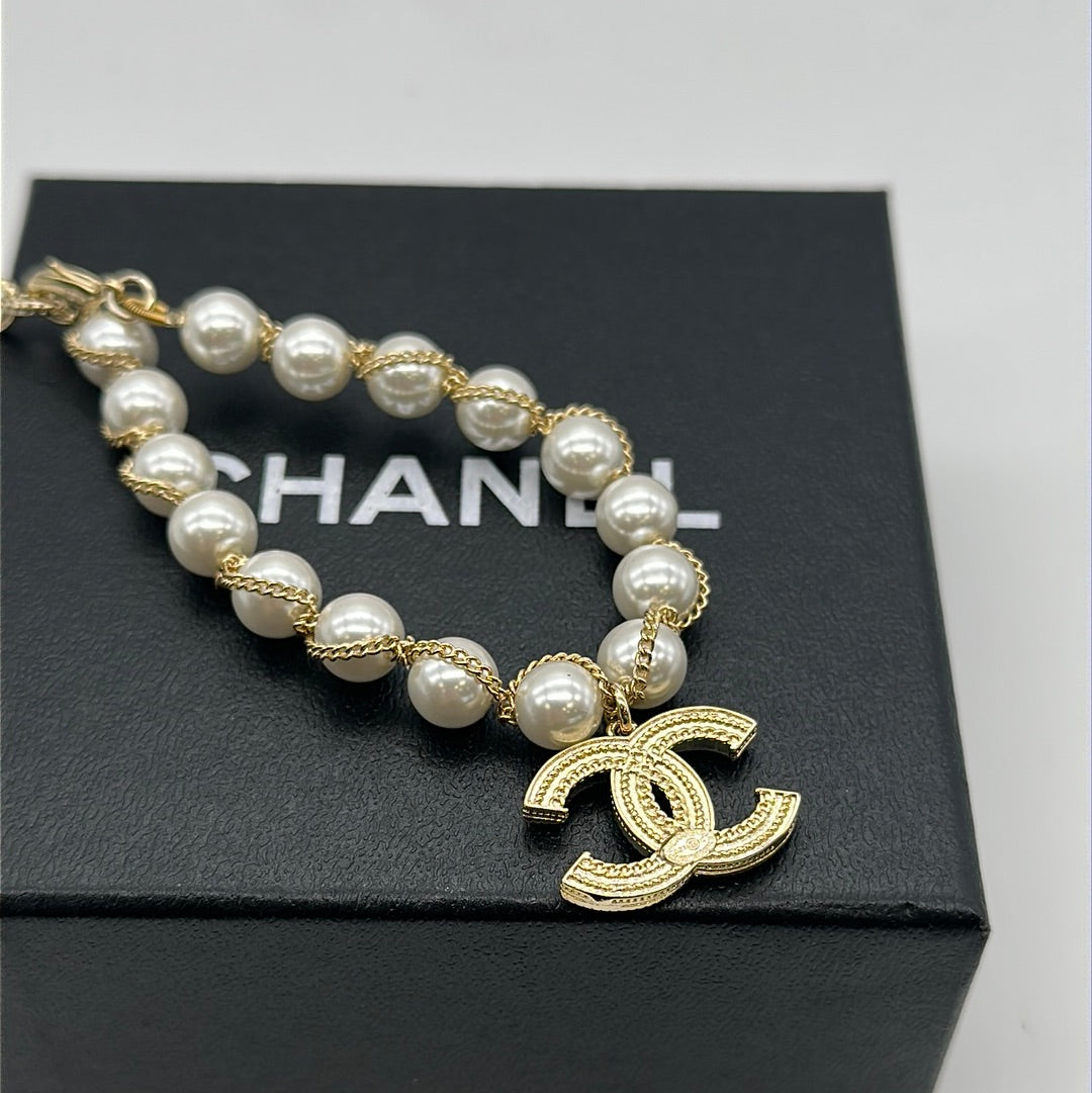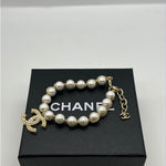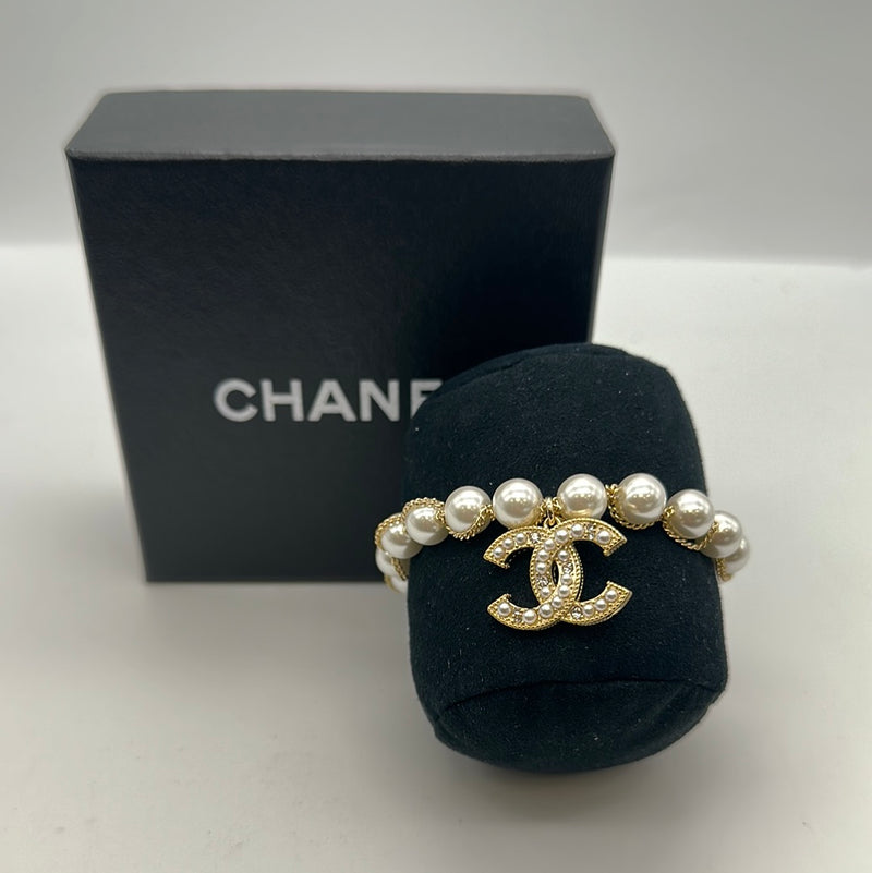 Chanel Pearl Bracelet set With Fine Gold Plated Chain Running Around The Pearls With The Iconic CC Logo Charm Attached To Middle Of Bracelet.