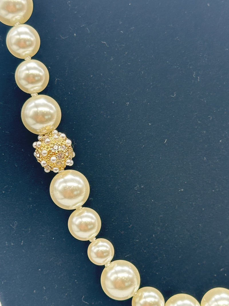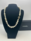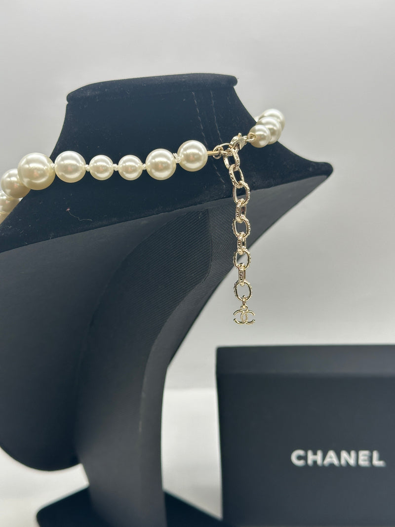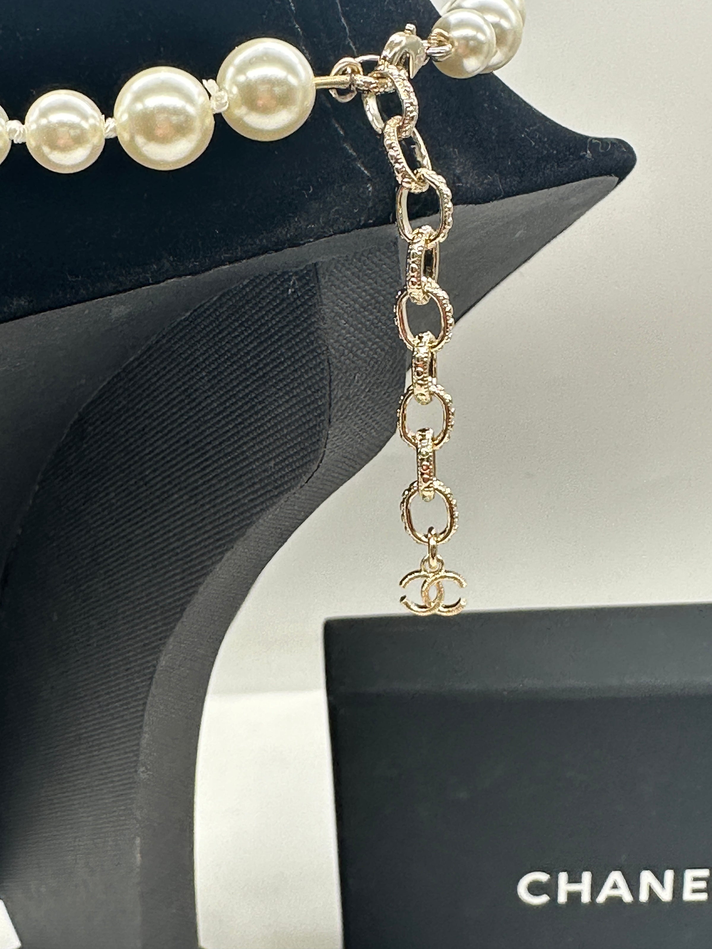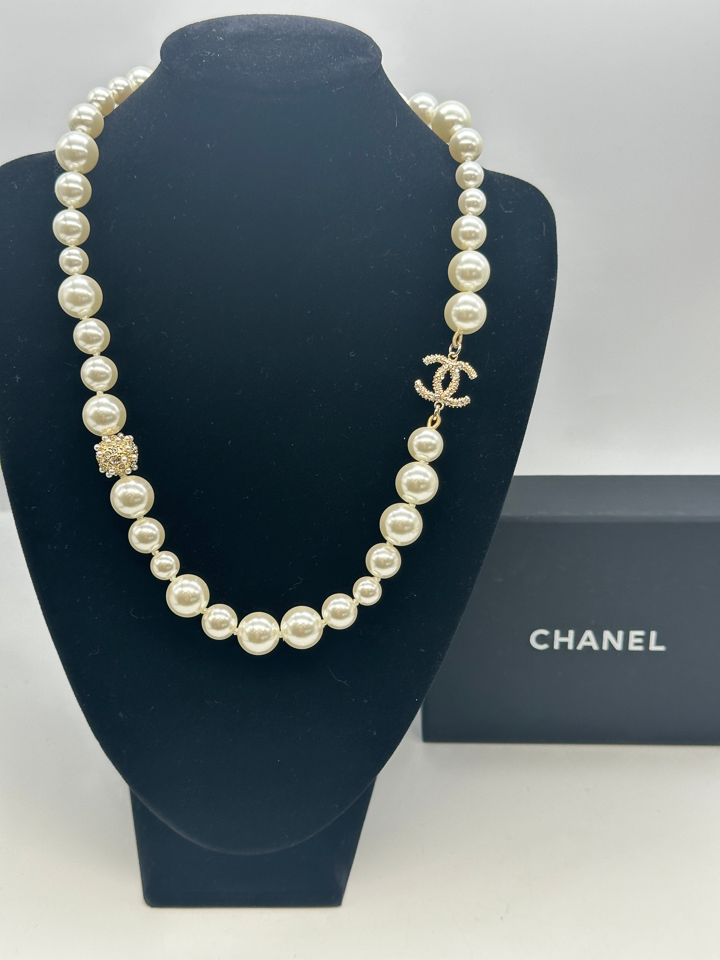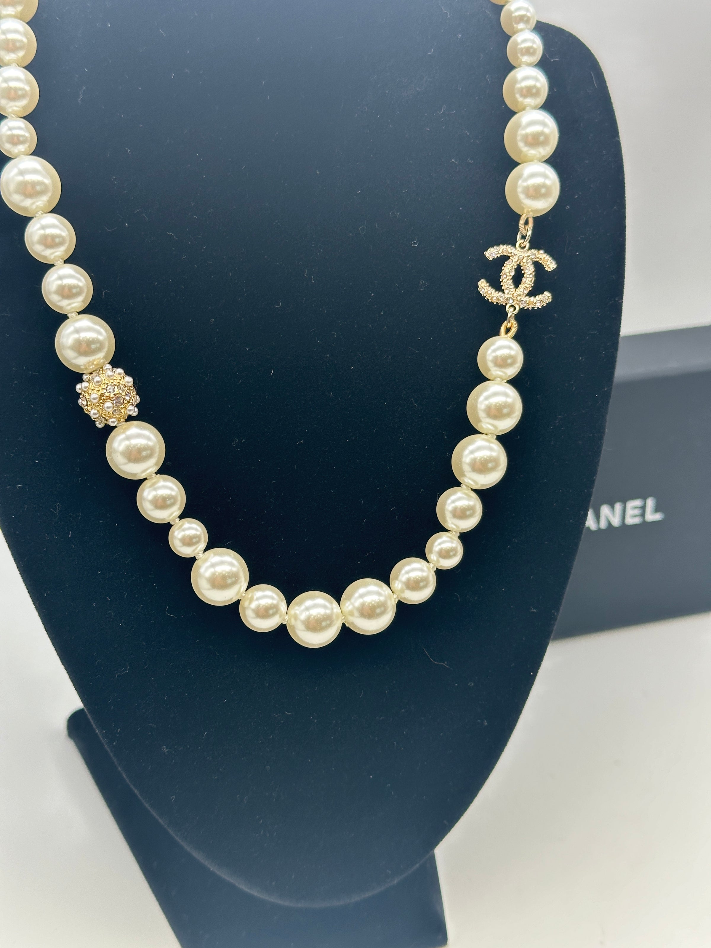 This stunning freshwater pearl necklace features CC logo and a pearl and crystal ball in-between the pearls on gold plate