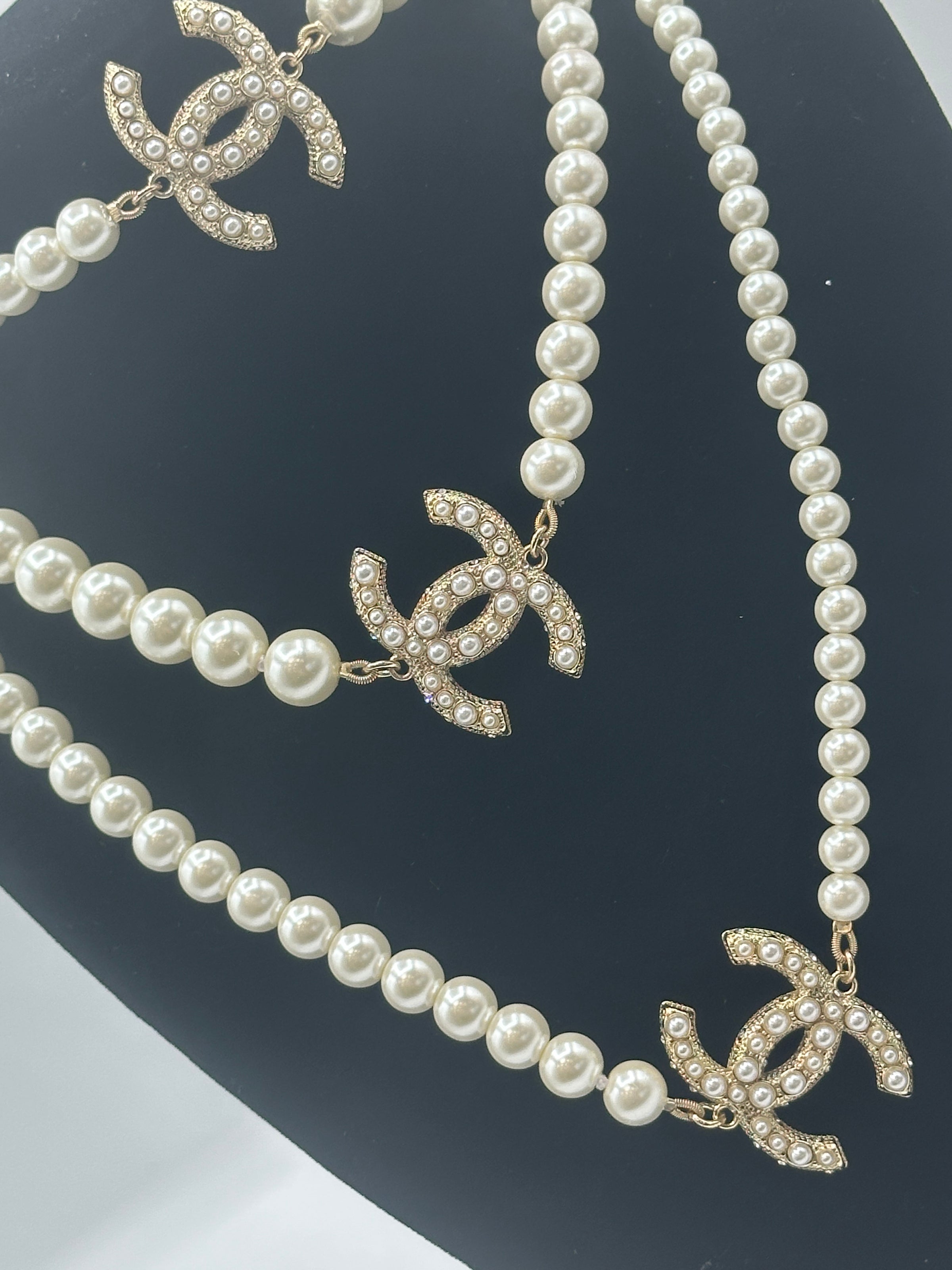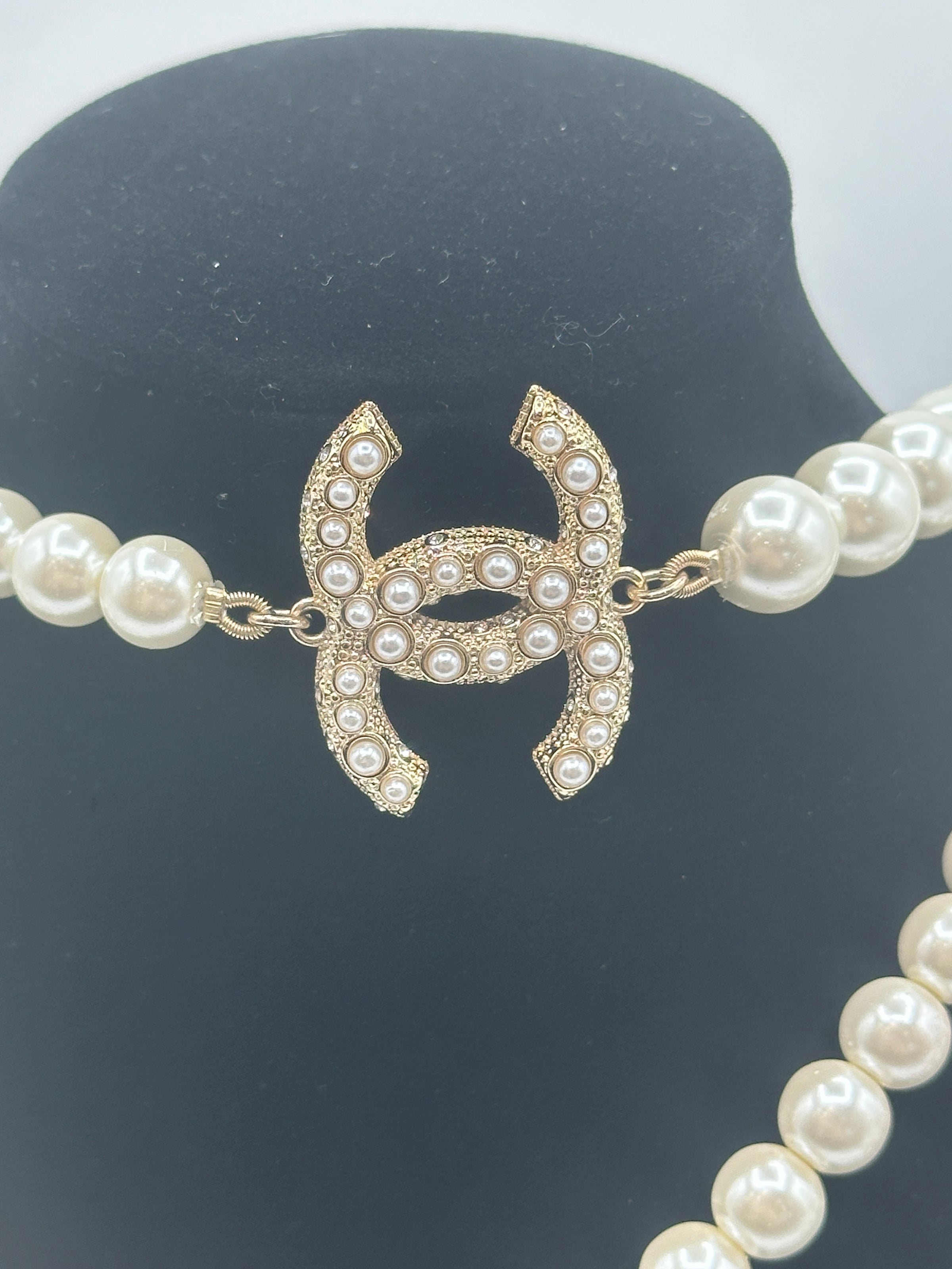 A reworked double-length Chanel pearl necklace featuring oversized cream faux pearls and signature interlocking CC logo charms—timeless, iconic, and effortlessly elegant.