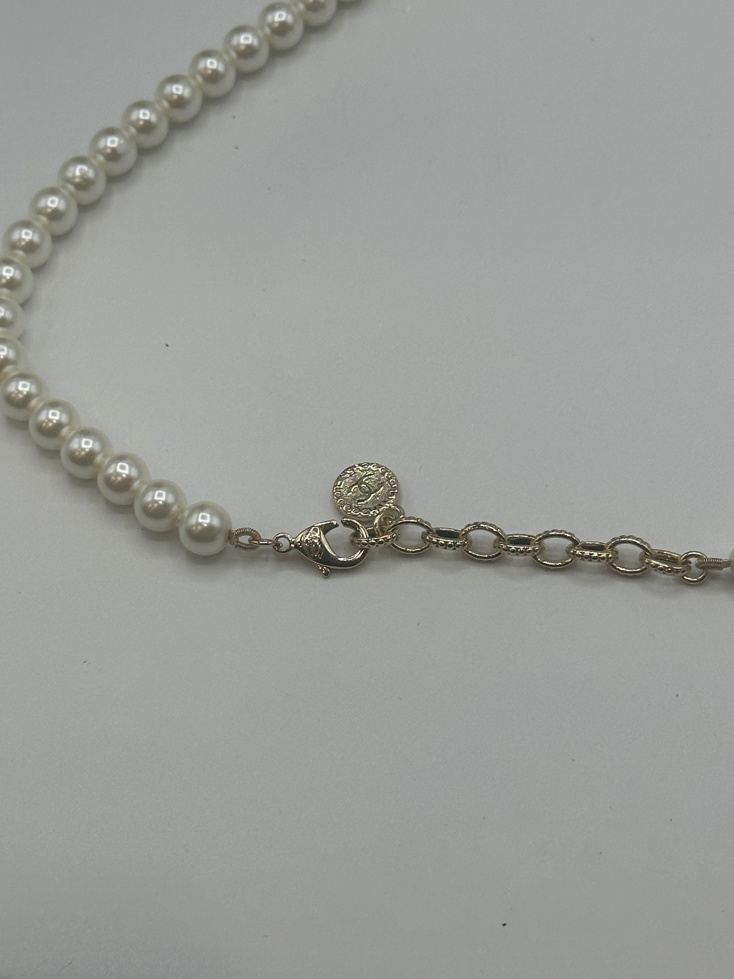 This necklace is crafted using genuine vintage Chanel elements, reworked into a modern heirloom. The oversized faux pearls and gold-plated CC logos are complemented by a secure bolt ring clasp, resulting in a bold yet elegant design that remains true to Chanel’s timeless appeal.