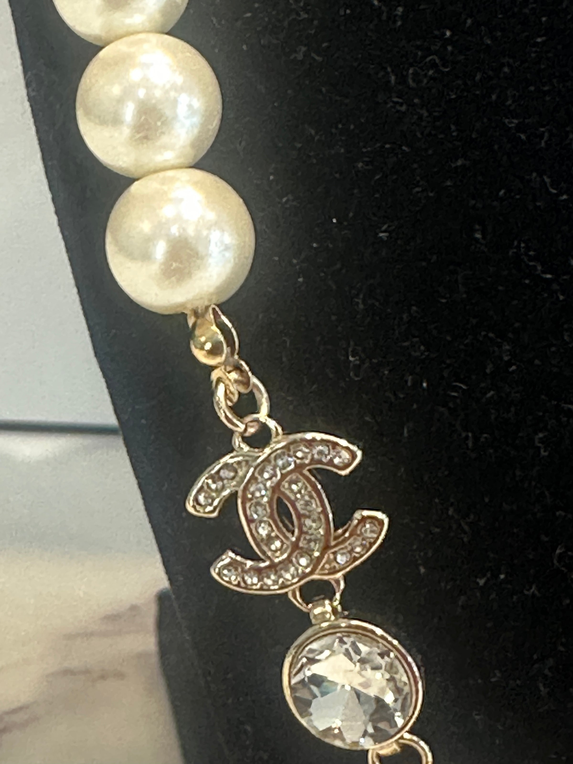 The re-worked Chanel pearl and crystal necklace in yellow gold plate with CC logo is an elegant, fashion-forward piece that blends classic Chanel styling with contemporary re-imagining. This necklace typically features a strand of lustrous faux pearls paired with crystal-set detailing and a yellow gold-plated finish for a refined, high-end look. The centrepiece is the iconic CC logo charm, embellished with clear crystals for a subtle hint of sparkle. As a re-worked piece, components originate from authenticated vintage or pre-owned Chanel jewellery, reassembled into a fresh, wearable design while retaining the unmistakable Chanel aesthetic. Length, pearl size and exact crystal arrangement may vary depending on the original elements used.