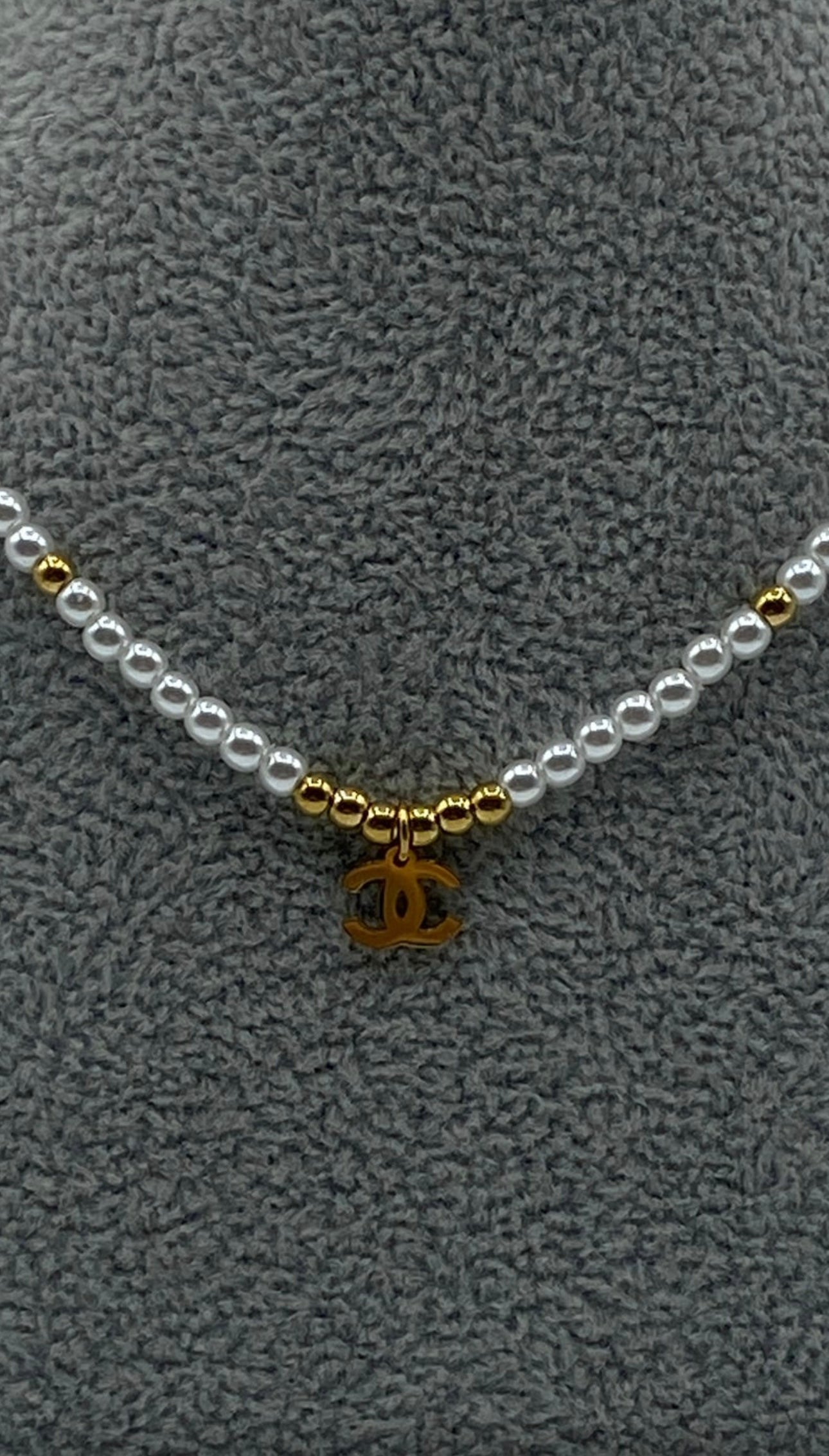 This beautiful freshwater pearl necklace is 16 inches with the iconic CC logo in 9ct gold plate at the front of the necklace and also one attached at the back with an extension chain to add another two inches.
