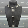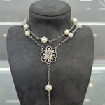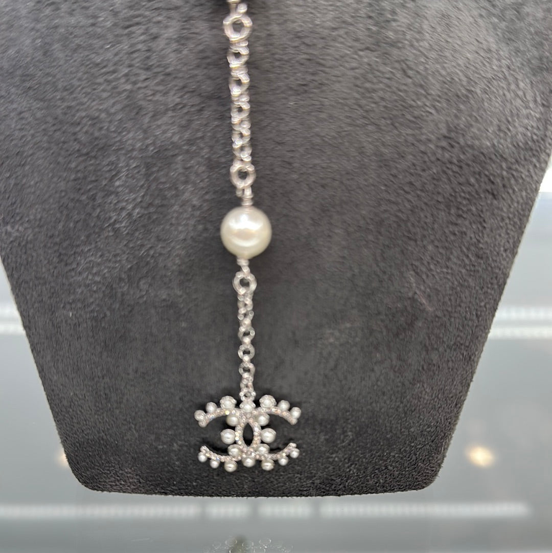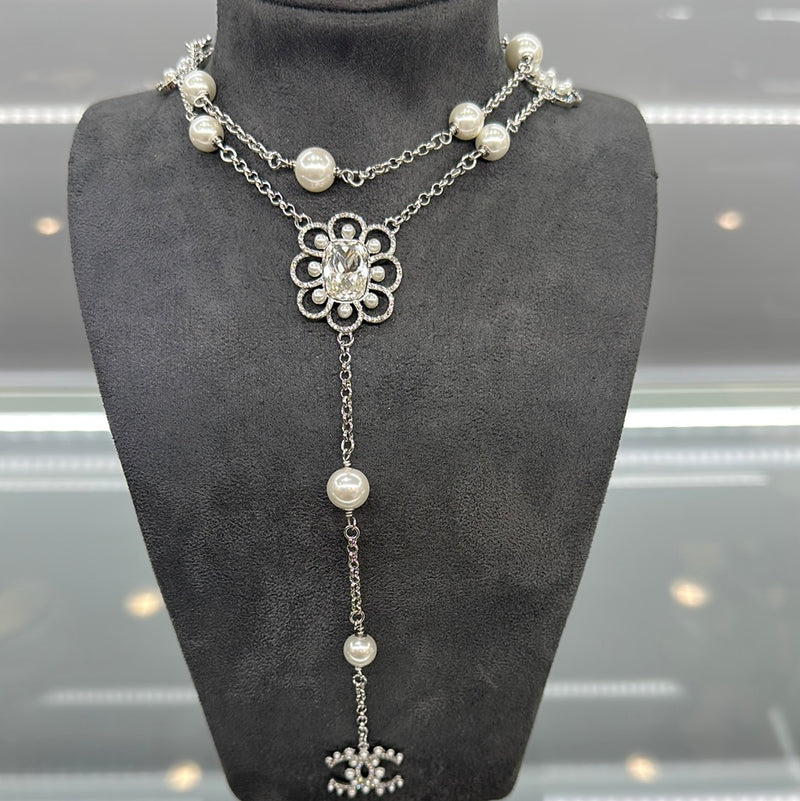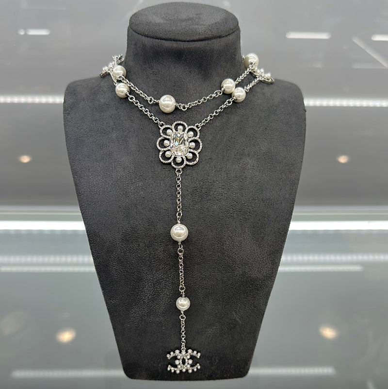 Chanel Necklace With Pearls And 3 Flowers Set With Crystals And Small Fresh Water Pearls On Silver With The CC Logo On Drop