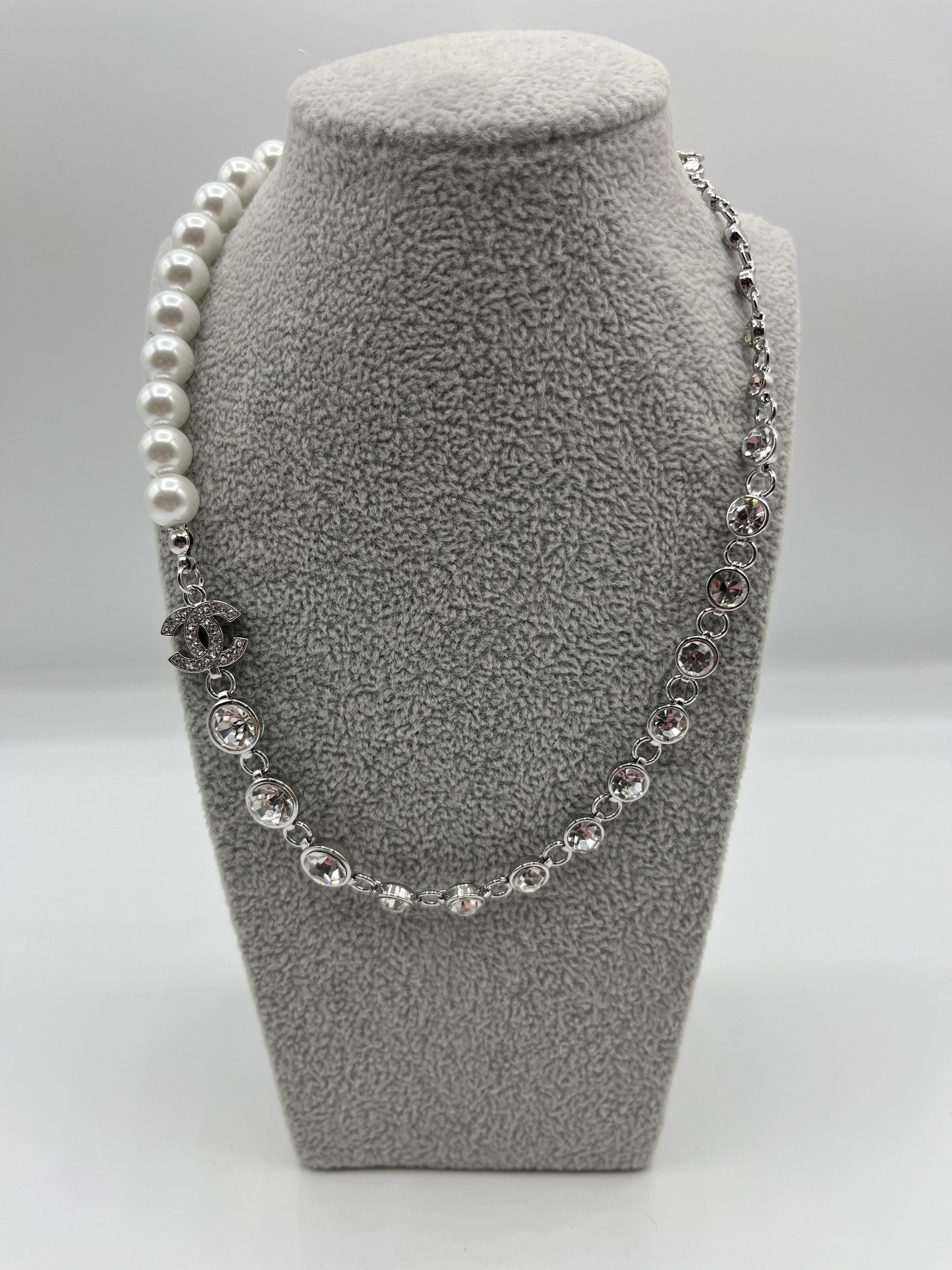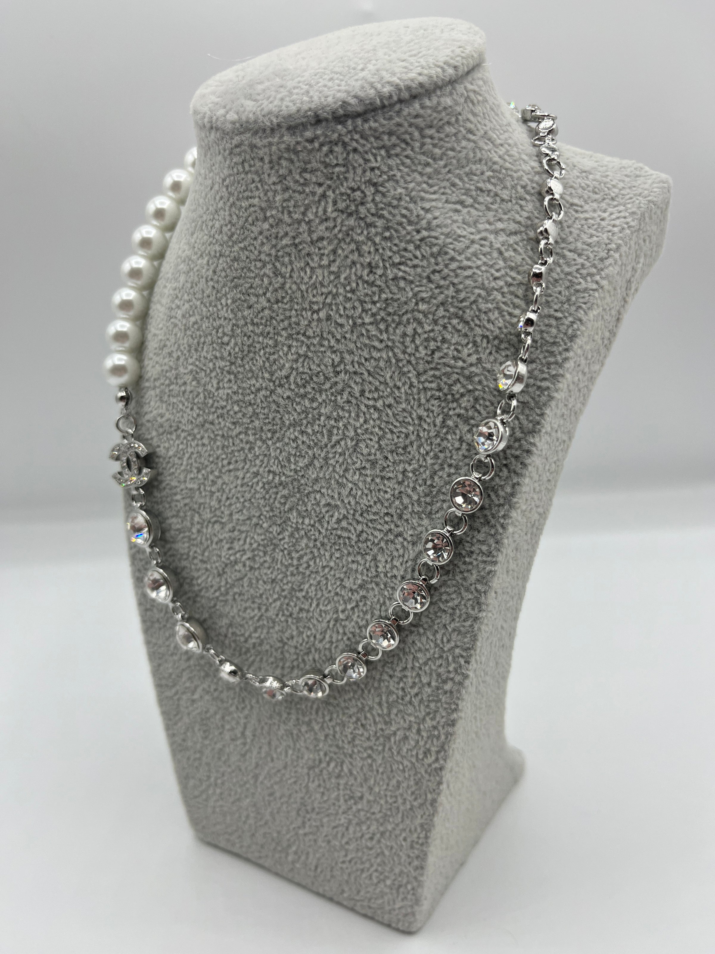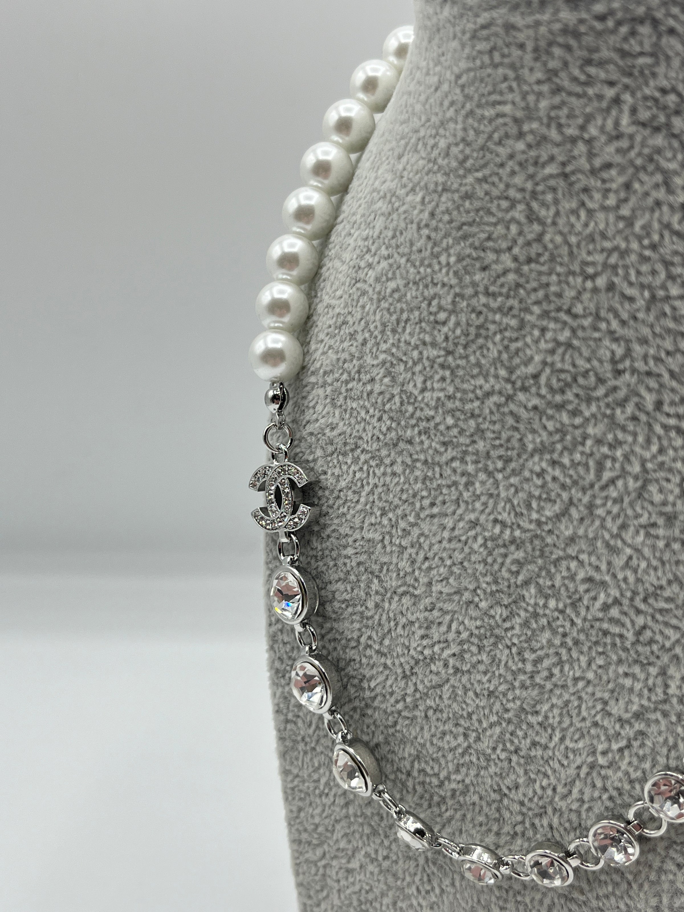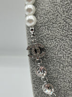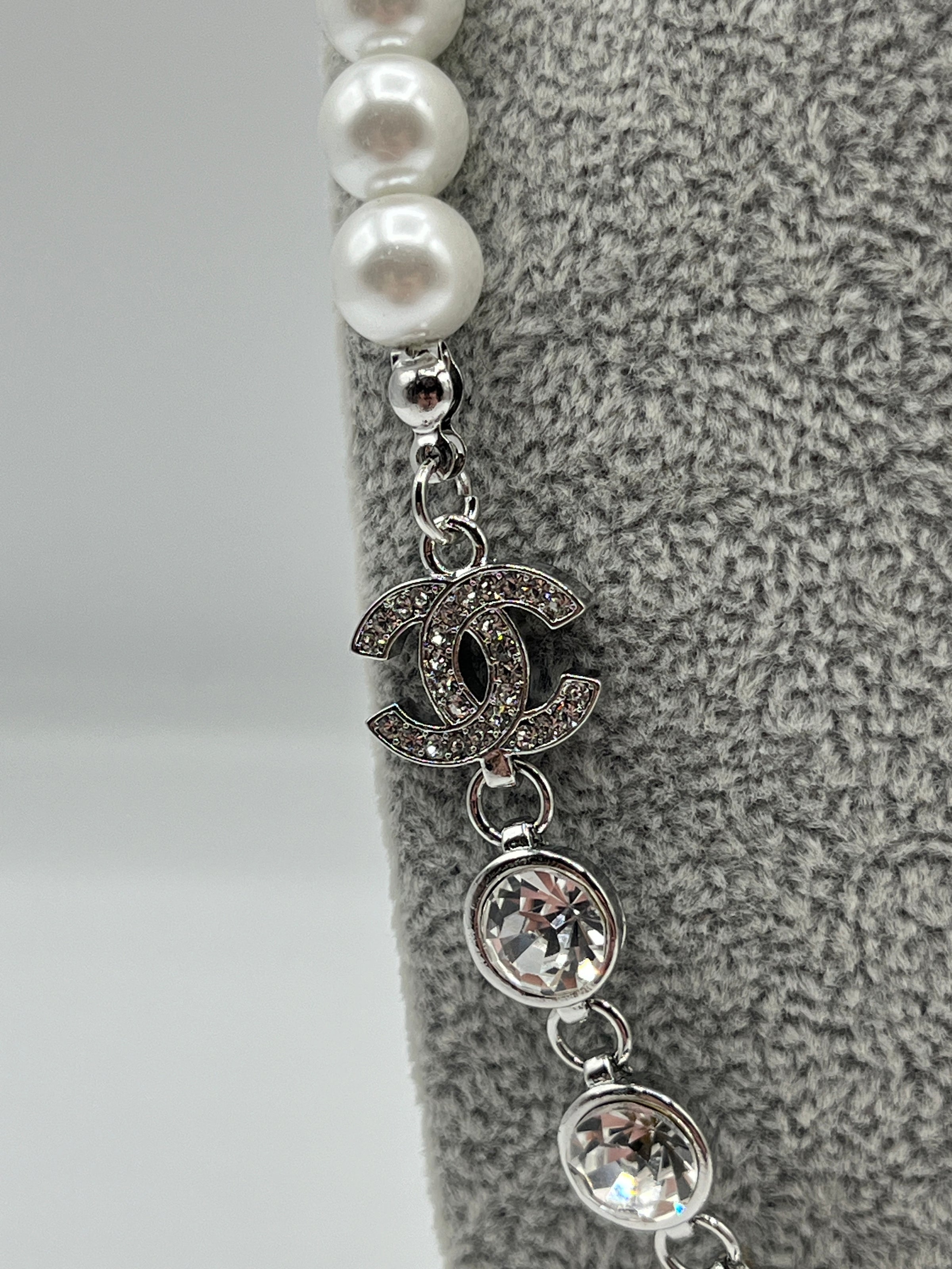 Beautiful Chanel Silver Necklace with Cubic Ziconia Crystals and Freshwater Pearls, Featuring the iconic interlocking C Chanel Logo decorated with Cubic Zircona