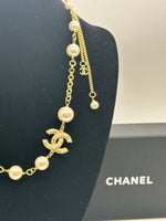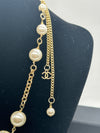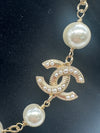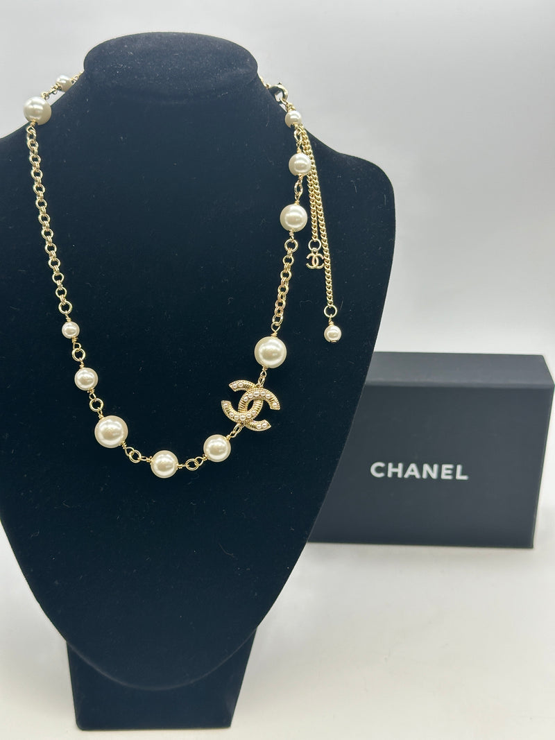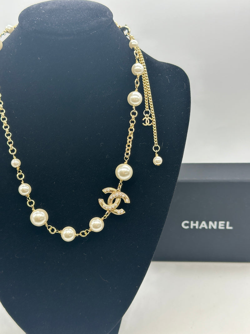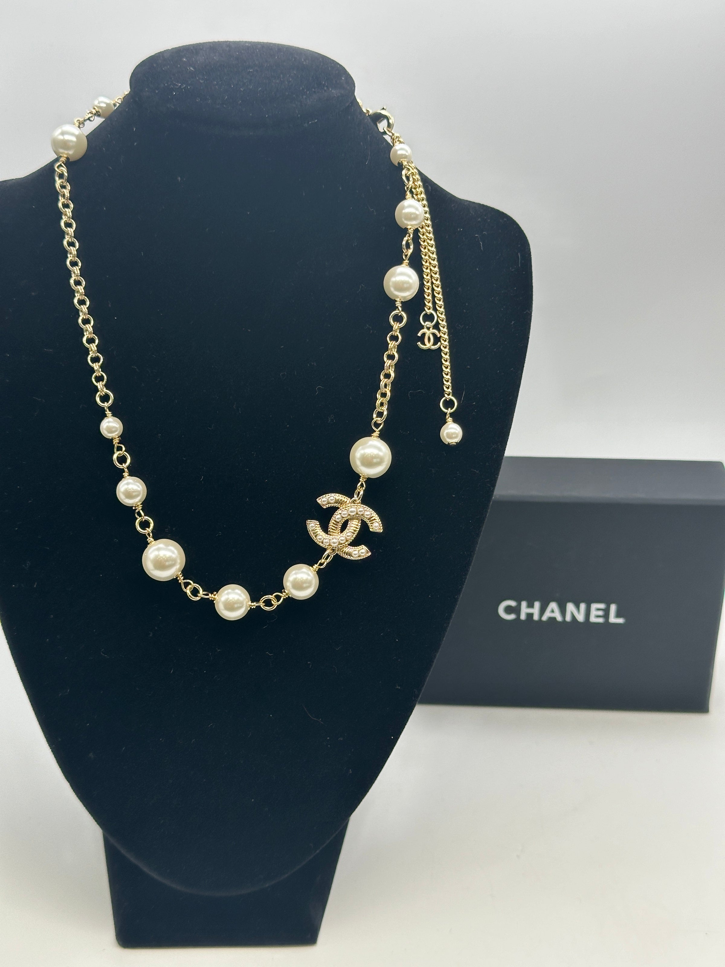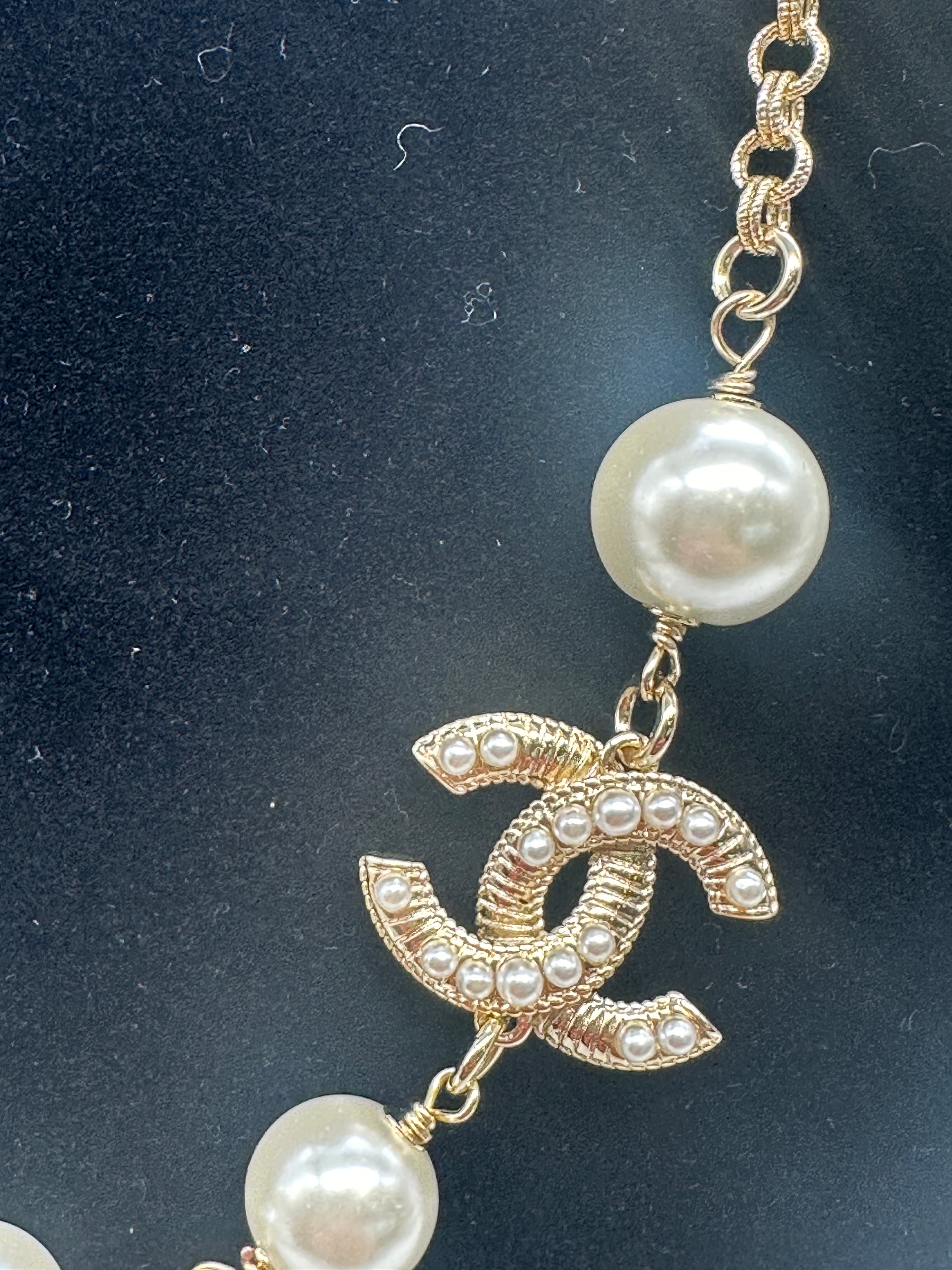 This beautiful gold-plated Chanel necklace is a stunning blend of timeless design and elegance. The necklace is adorned with lustrous pearls, creating a sophisticated look that reflects the luxurious style of Chanel. At the centre of the design is the iconic interlocking CC logo, a symbol that Coco Chanel created to embody the principles of comfort, geometry, and clean lines. The two intertwining Cs stand for “Coco Chanel,” adding a touch of heritage and meaning to the piece. This necklace has been re-worked, meaning it has been expertly rebuilt or repaired, ensuring it retains its beauty and functionality. -