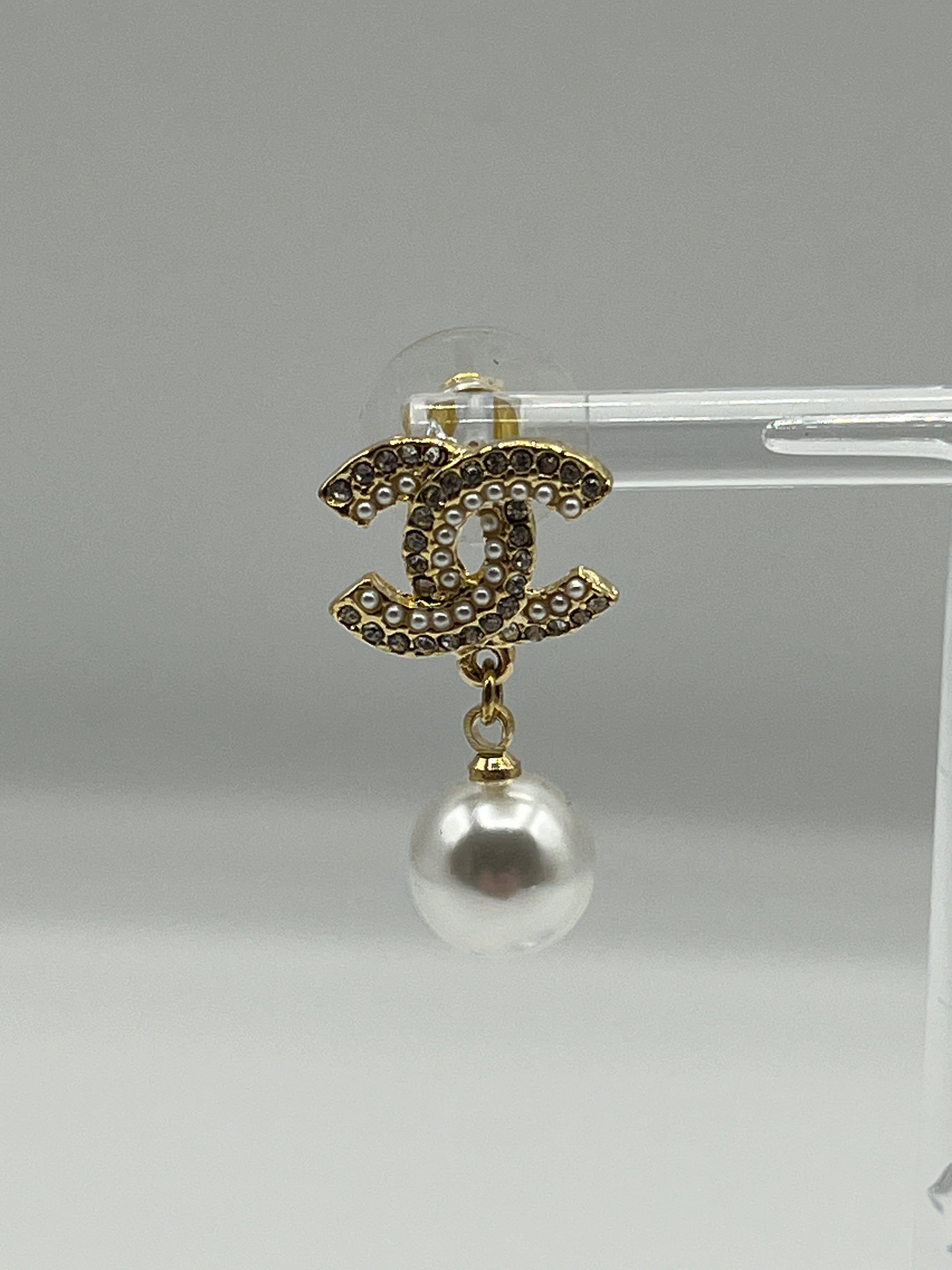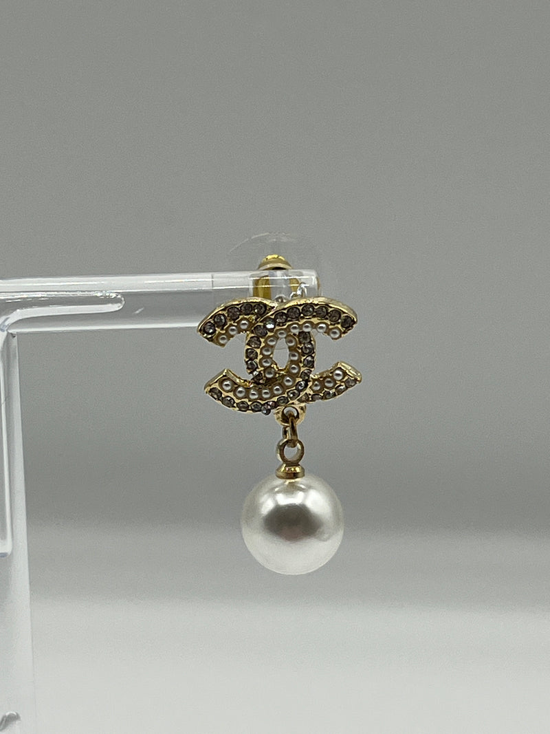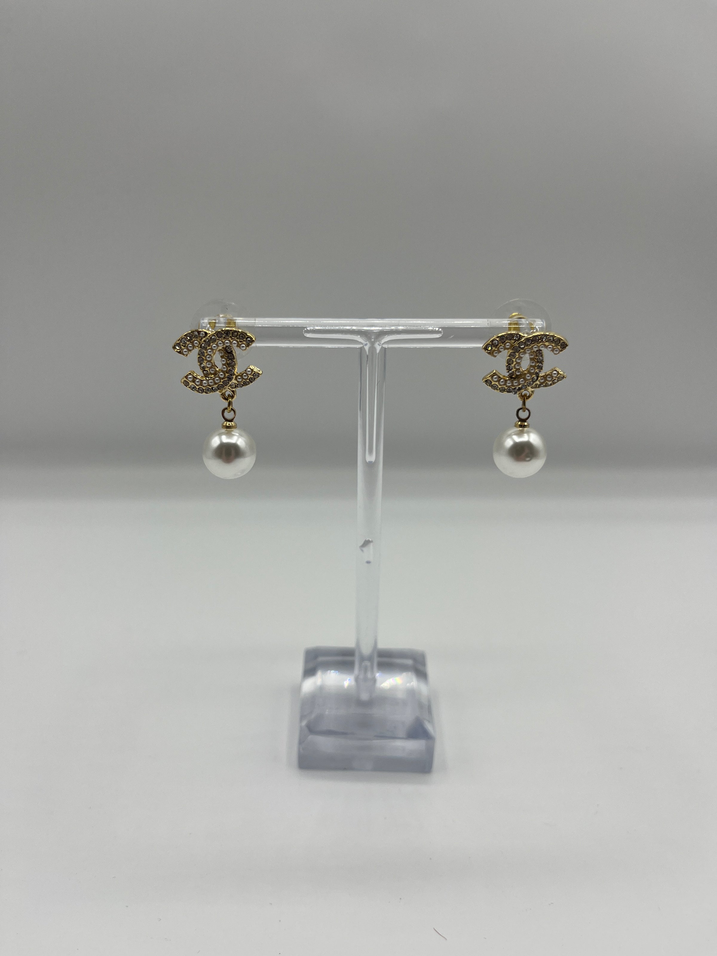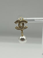 These beautiful Gold Plated Chanel Earrings Featuring the iconic interlocking C Chanel Logo decorated with Cubic Zirconia and a Pearl Drop