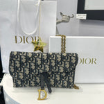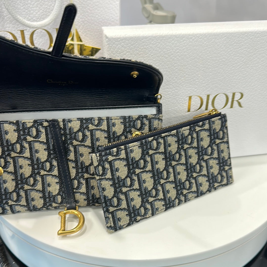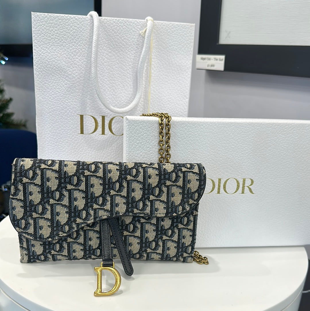 The long Saddle wallet with chain, crafted in blue Dior Oblique jacquard, is a hybrid item with a modern and streamlined design. The style is embellished with an asymmetric flap featuring an antique gold-finish metal 'D' stirrup. Thanks to its removable chain strap, the wallet can be worn over the shoulder, crossbody or carried by hand.