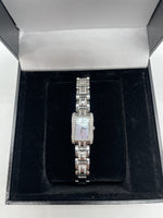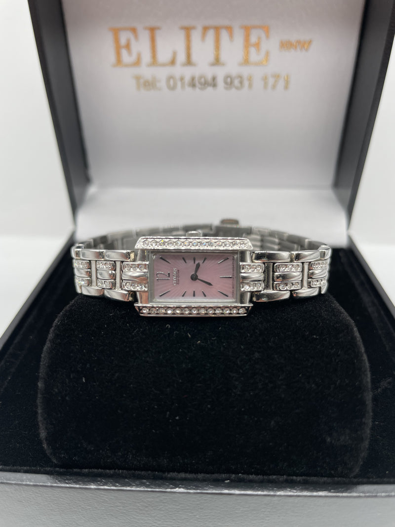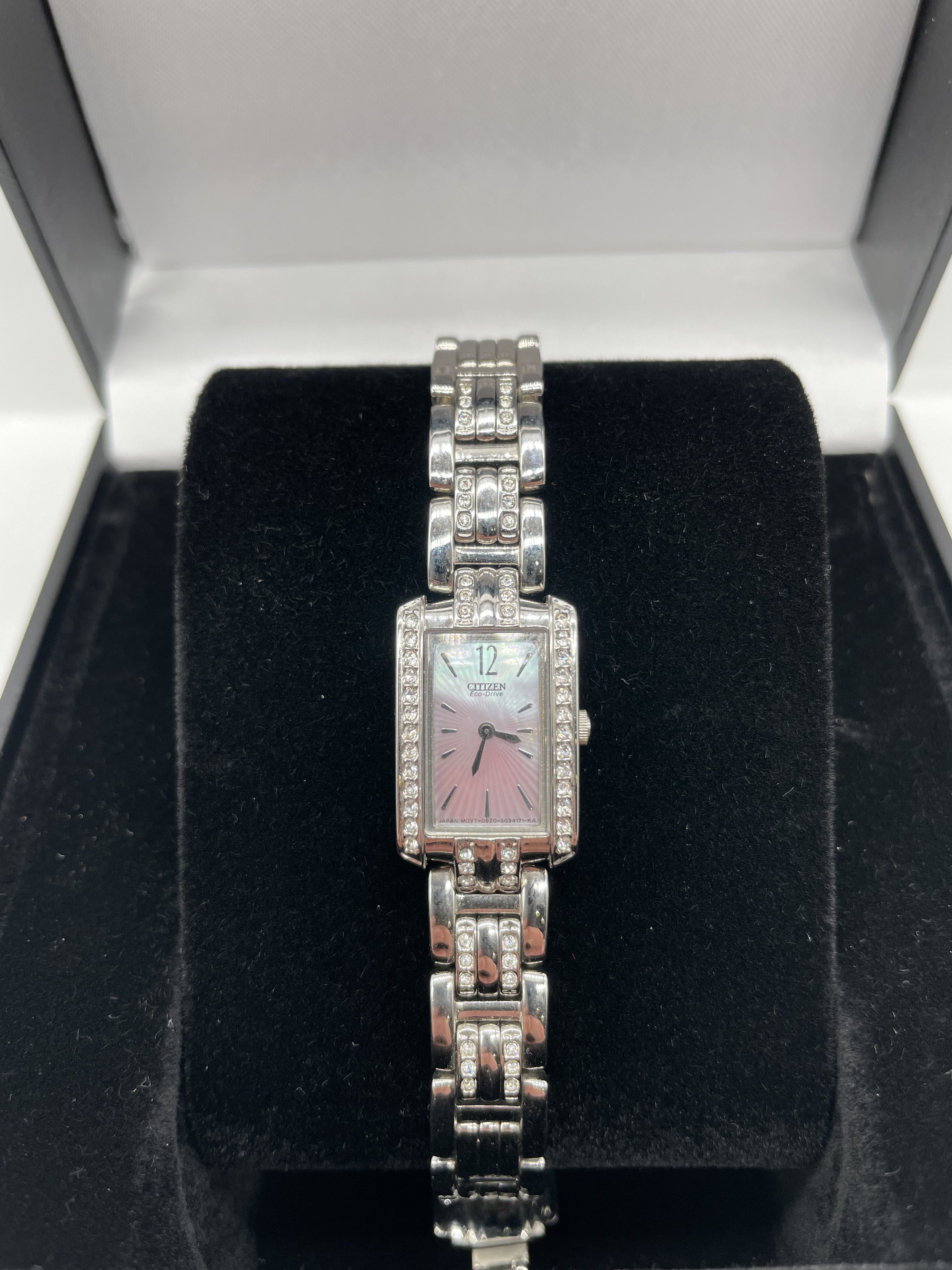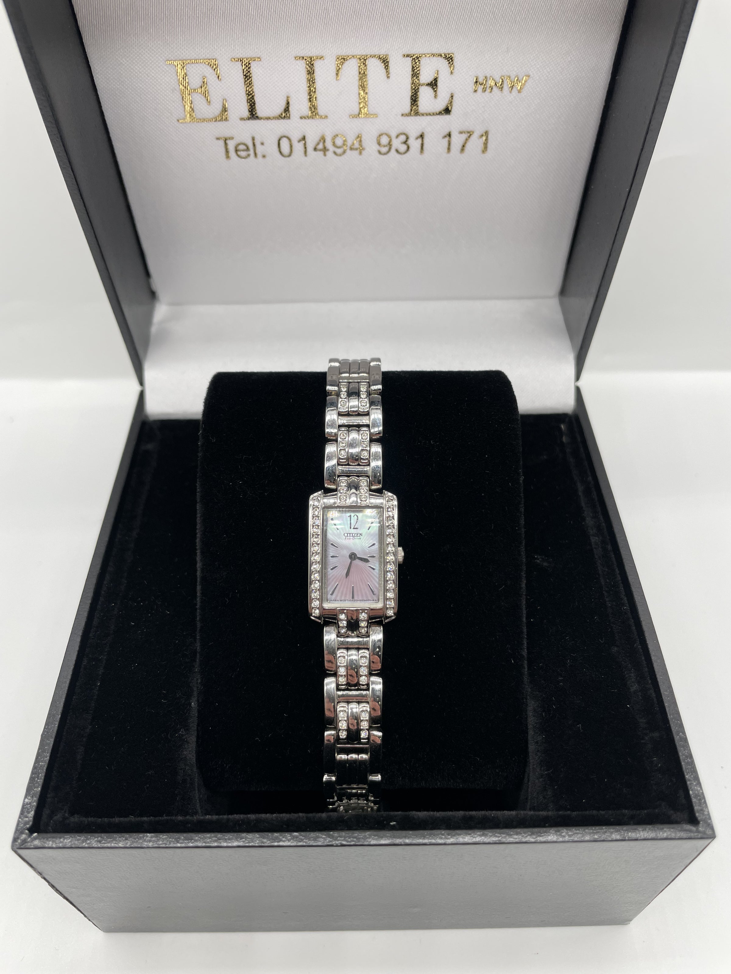 Citizen Ladies Rectangle Watch with mother of pearl face, with a crystal silhouette bracelet.
