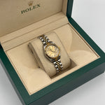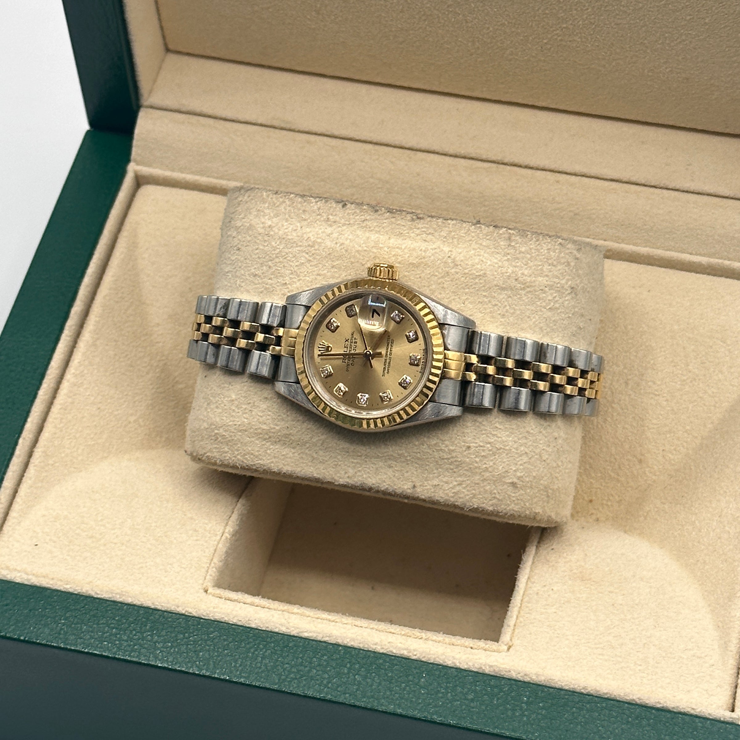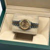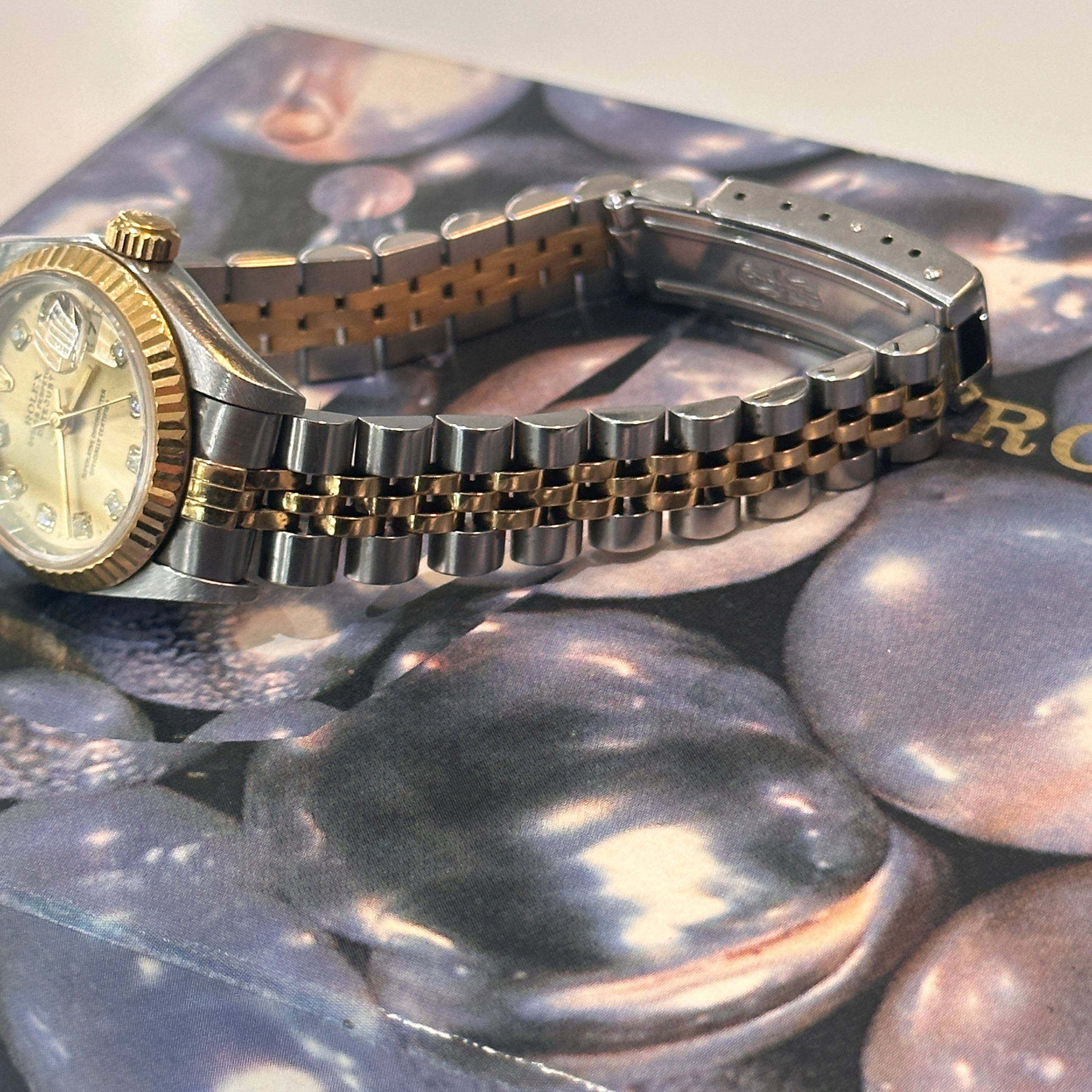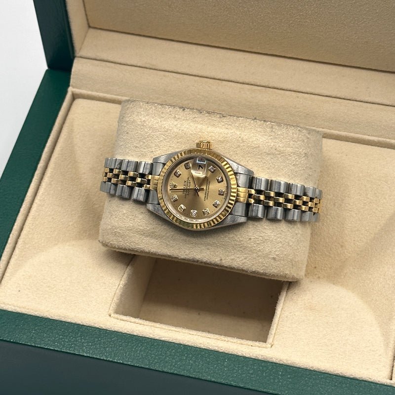 This Rolex Ladies Oyster Perpetual features a 26mm stainless steel case, champagne diamond dot dial with a 18k yellow gold fluted bezel,