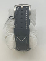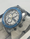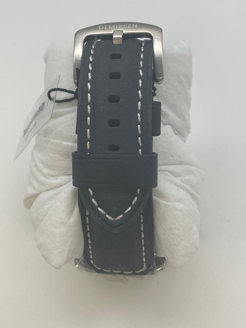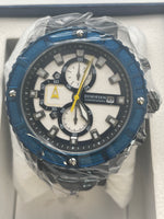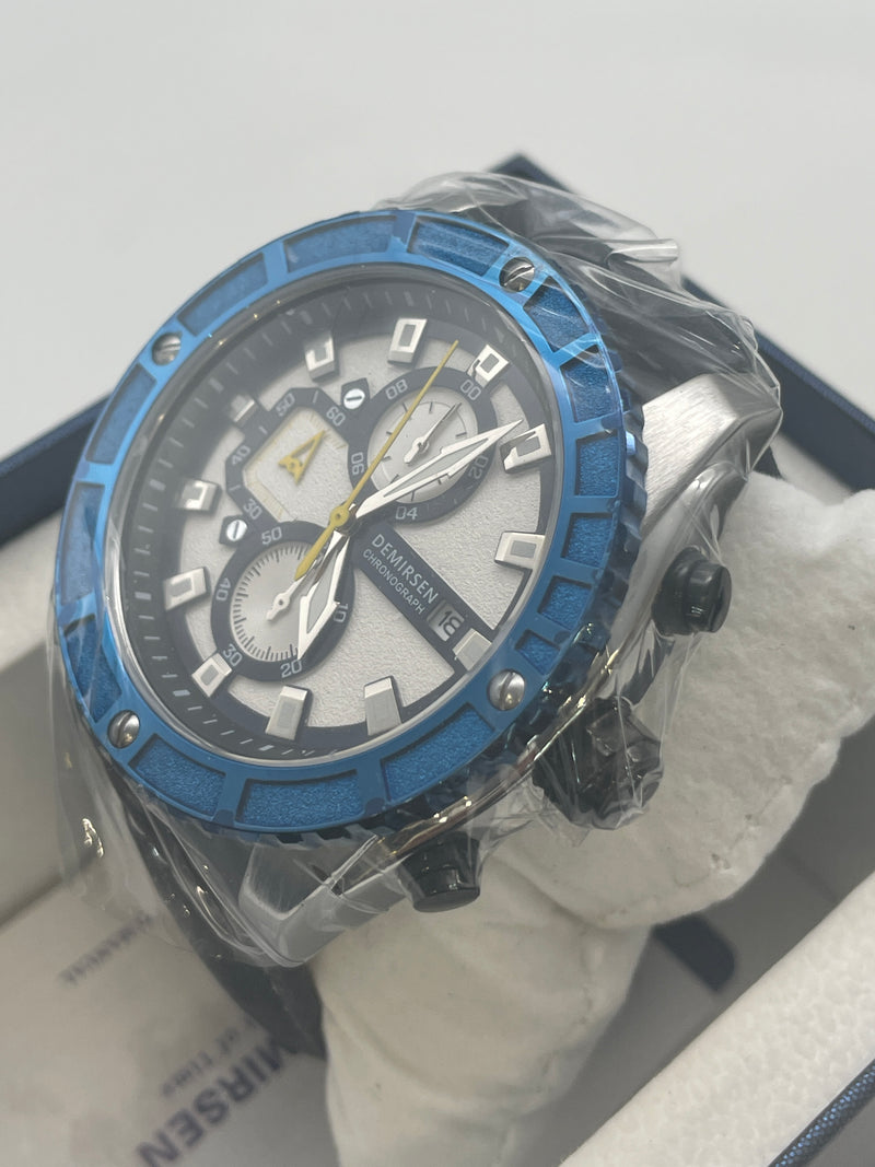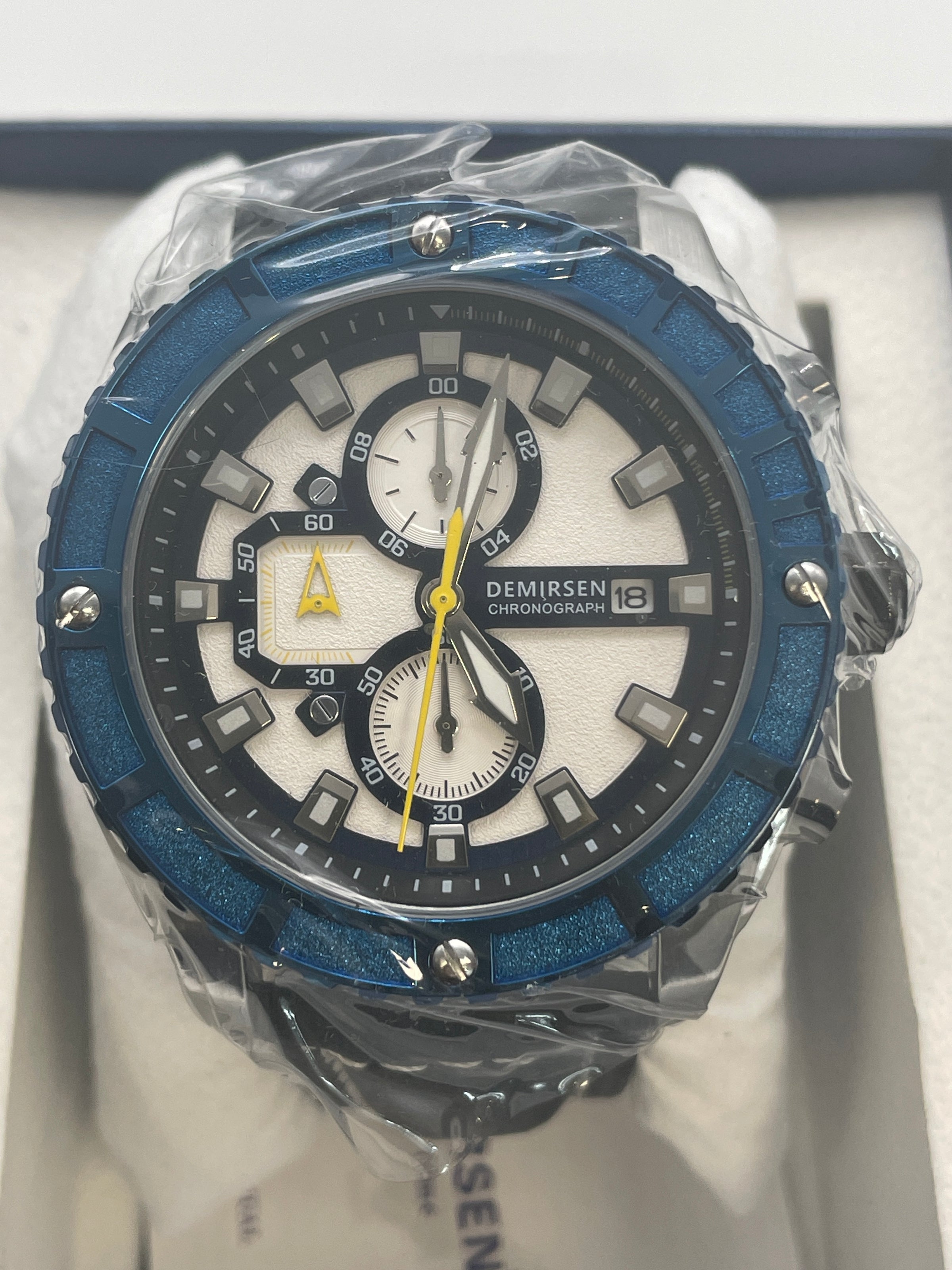 This Demirsen chronograph features a 42mm case, bright blue bezel, white dial with blue outlined chronograph dials with arrow hands and a yellow second hand. This watch comes on a blue leather strap and is the perfect everyday watch .