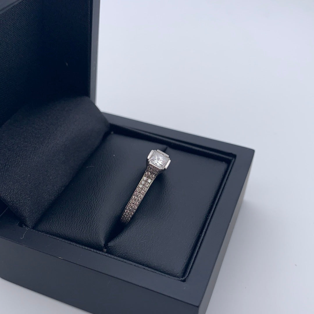This stunning diamond and platinum ring features a 0.58ct princess-cut diamond, renowned for its modern and geometric shape, offering a bold yet sophisticated look. The diamond is set in platinum, a metal celebrated for its durability, brightness, and hypoallergenic properties. Graded E for exceptional white and VS1 for clarity, this diamond offers outstanding brilliance and sparkle. The clean lines and classic design of this ring make it a perfect statement piece or a timeless engagement ring.