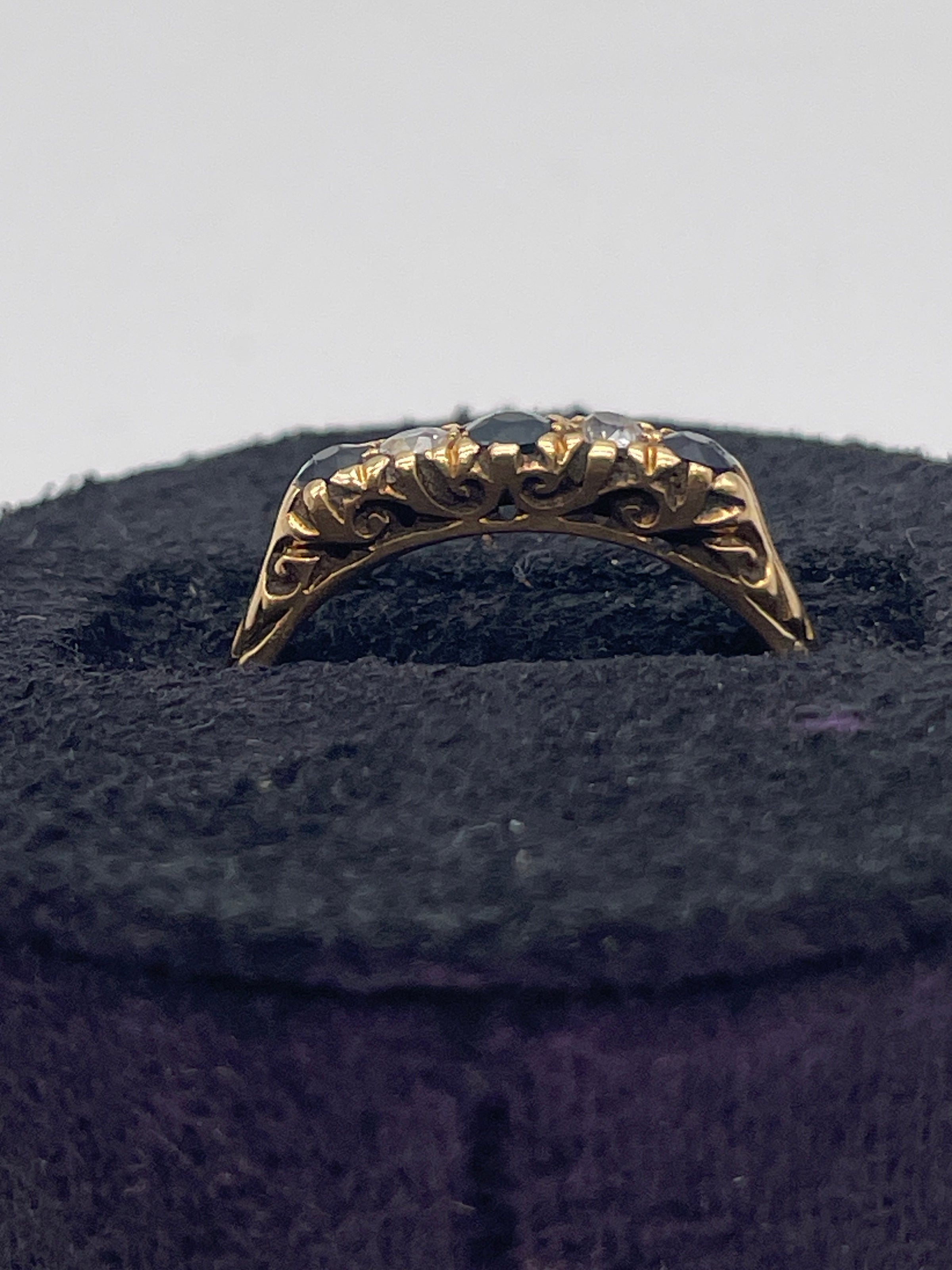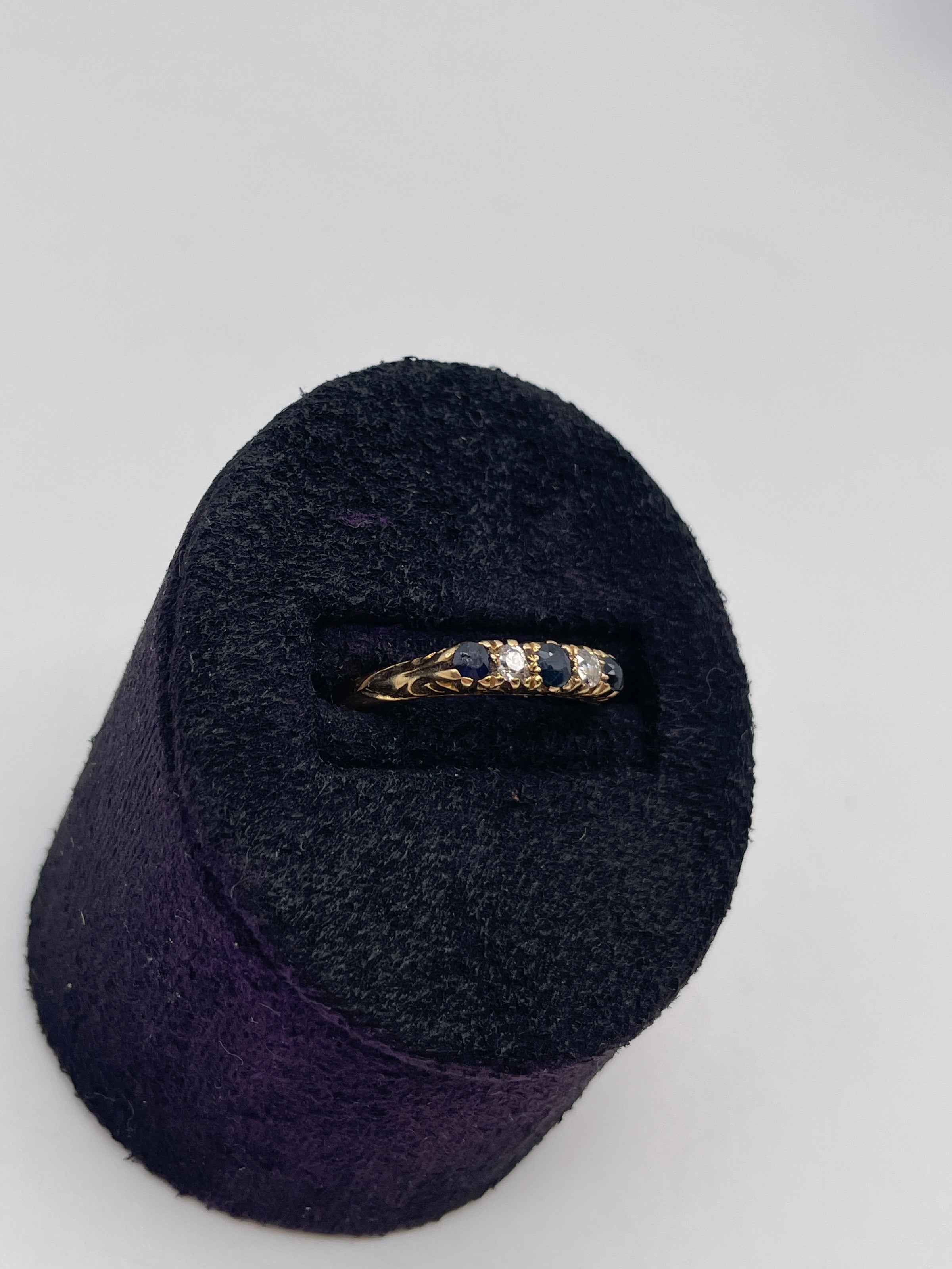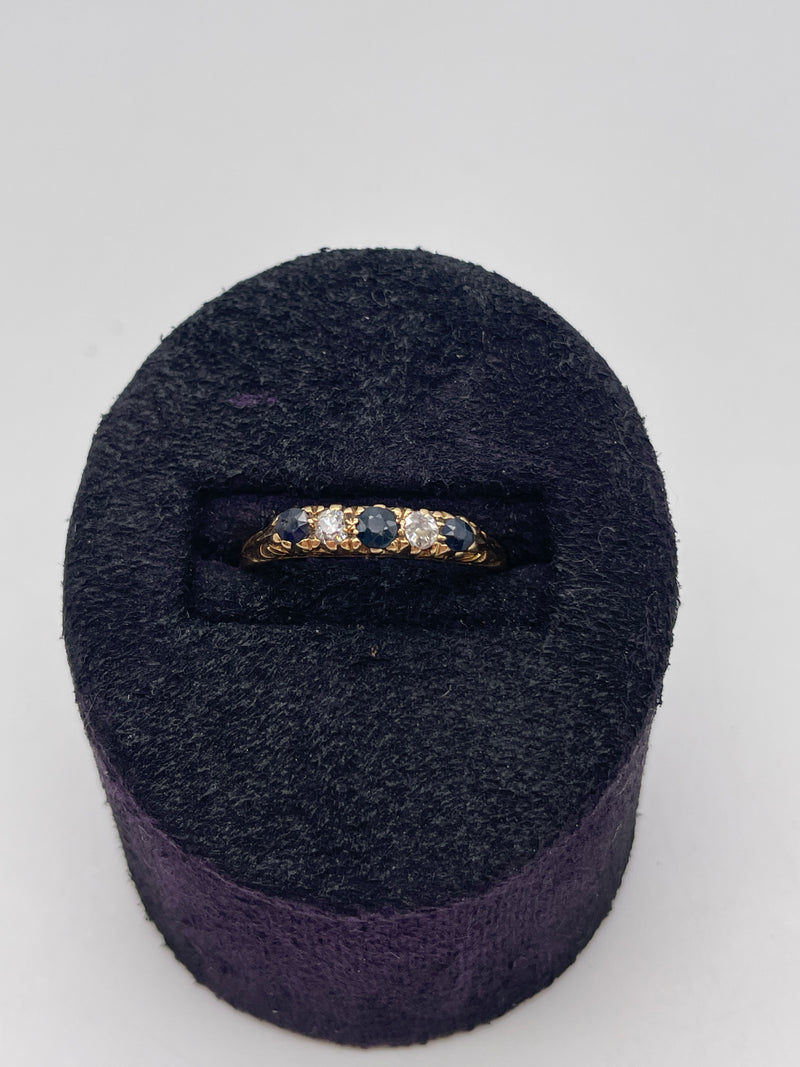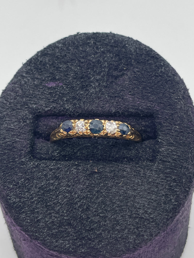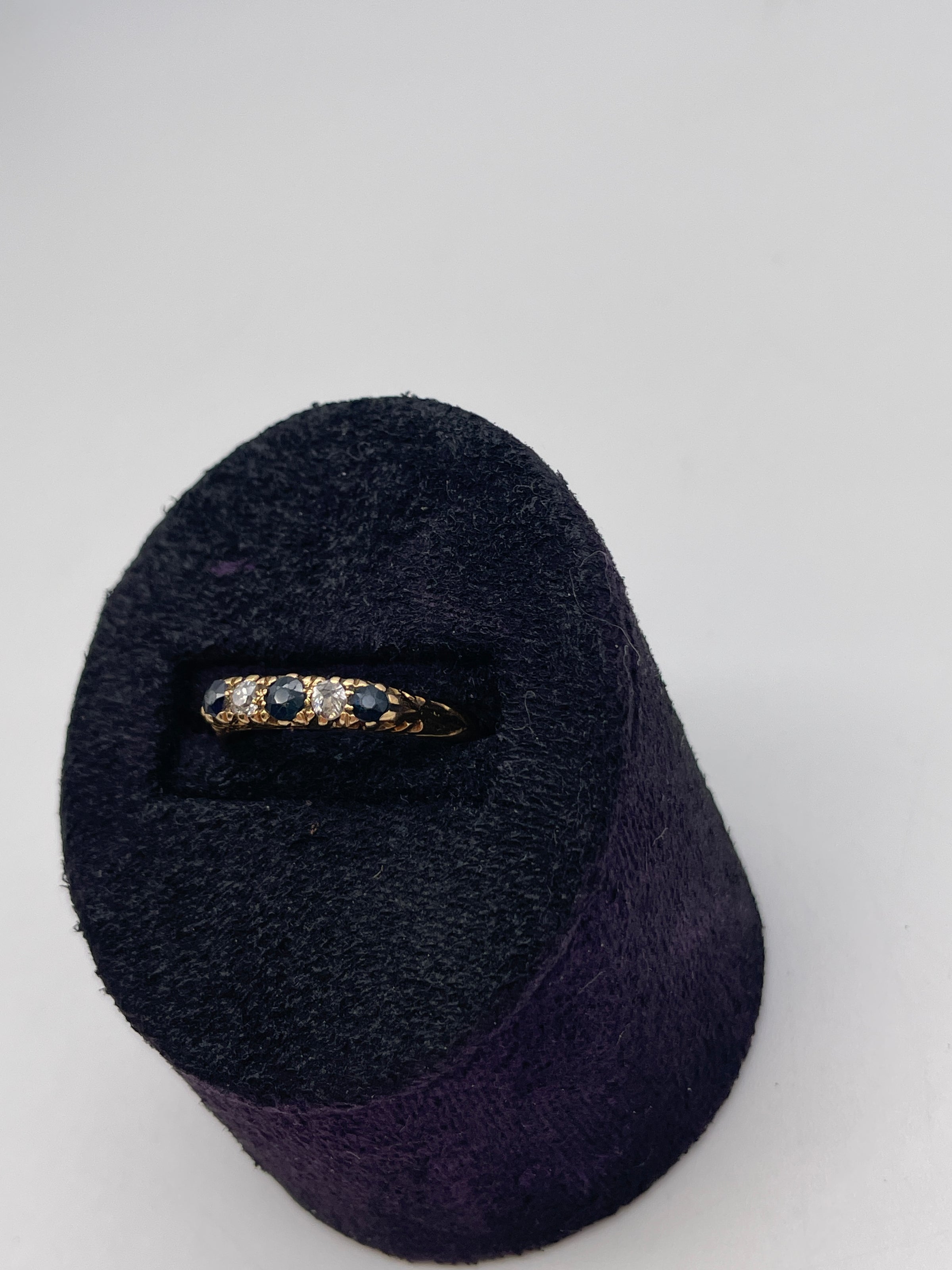 This elegant five-stone ring features a harmonious arrangement of alternating sapphires and diamonds, meticulously set in a lustrous 18ct yellow gold band. The central sapphire, flanked by two diamonds on each side, showcases the timeless allure of these precious gemstones. The band is designed with a smooth finish, ensuring comfortable wear while exuding sophistication.