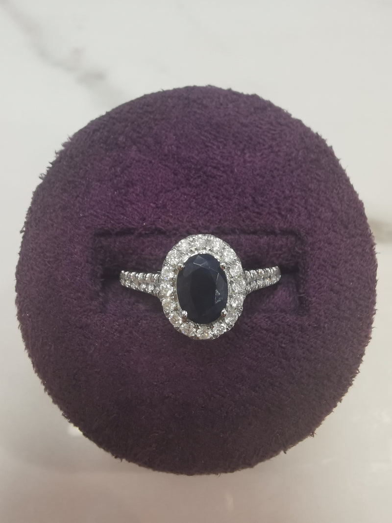 One Ladies 18ct White Gold Diamond And Sapphire Ring Set With Oval Cut Sapphire In A Diamond Halo Mount Set With Brilliant Cut Diamonds Surrounding And Running Down The Shoulders. Approx. Cart-Weight Sapphire 0.60ct Approx. Carat-Weight Diamonds 0.75ct Matching 18ct White Gold Diamond Half Eternity Ring Set With Brilliant Cut Diamonds Approx. Carat-Weight 0.30ct