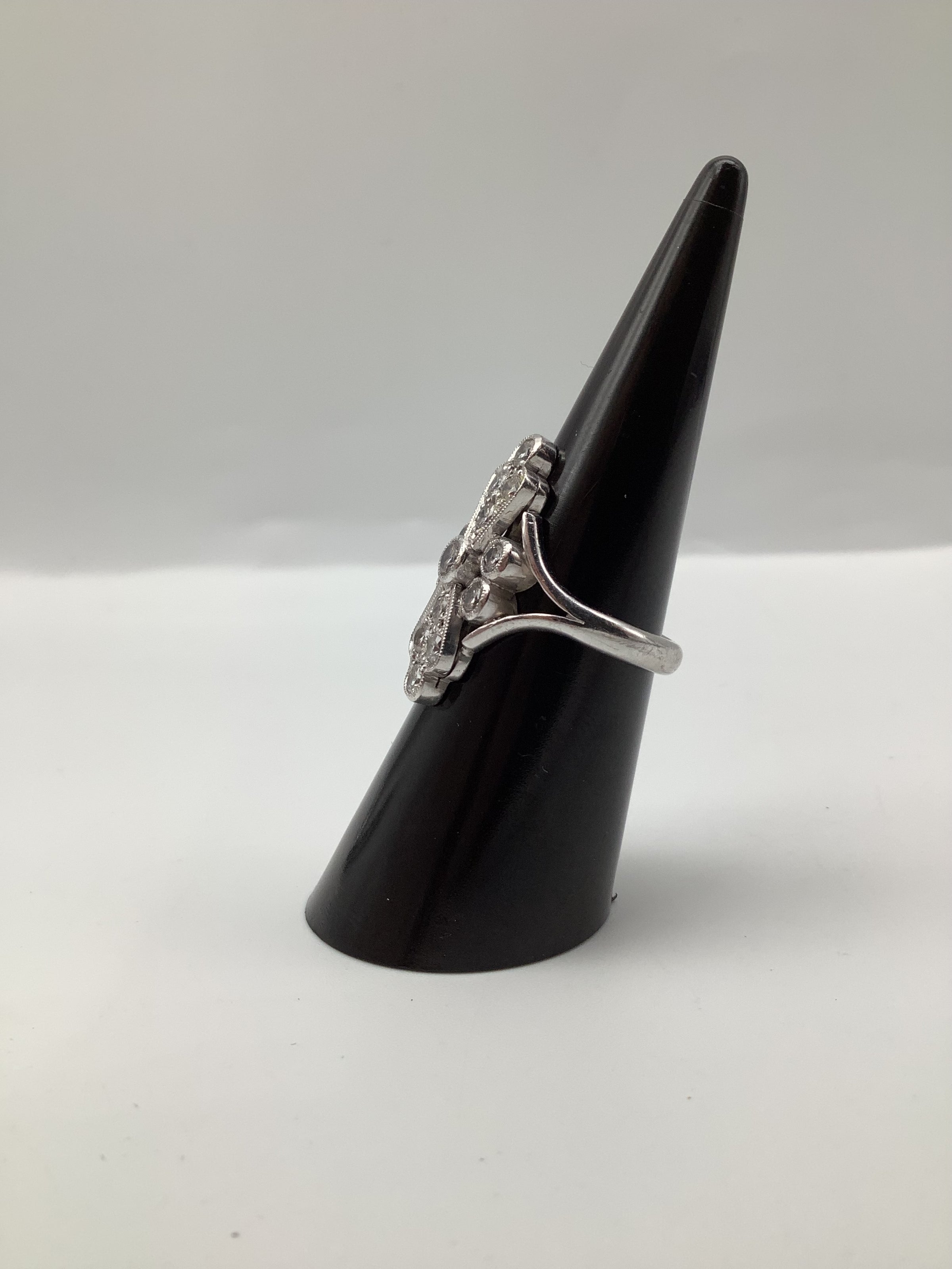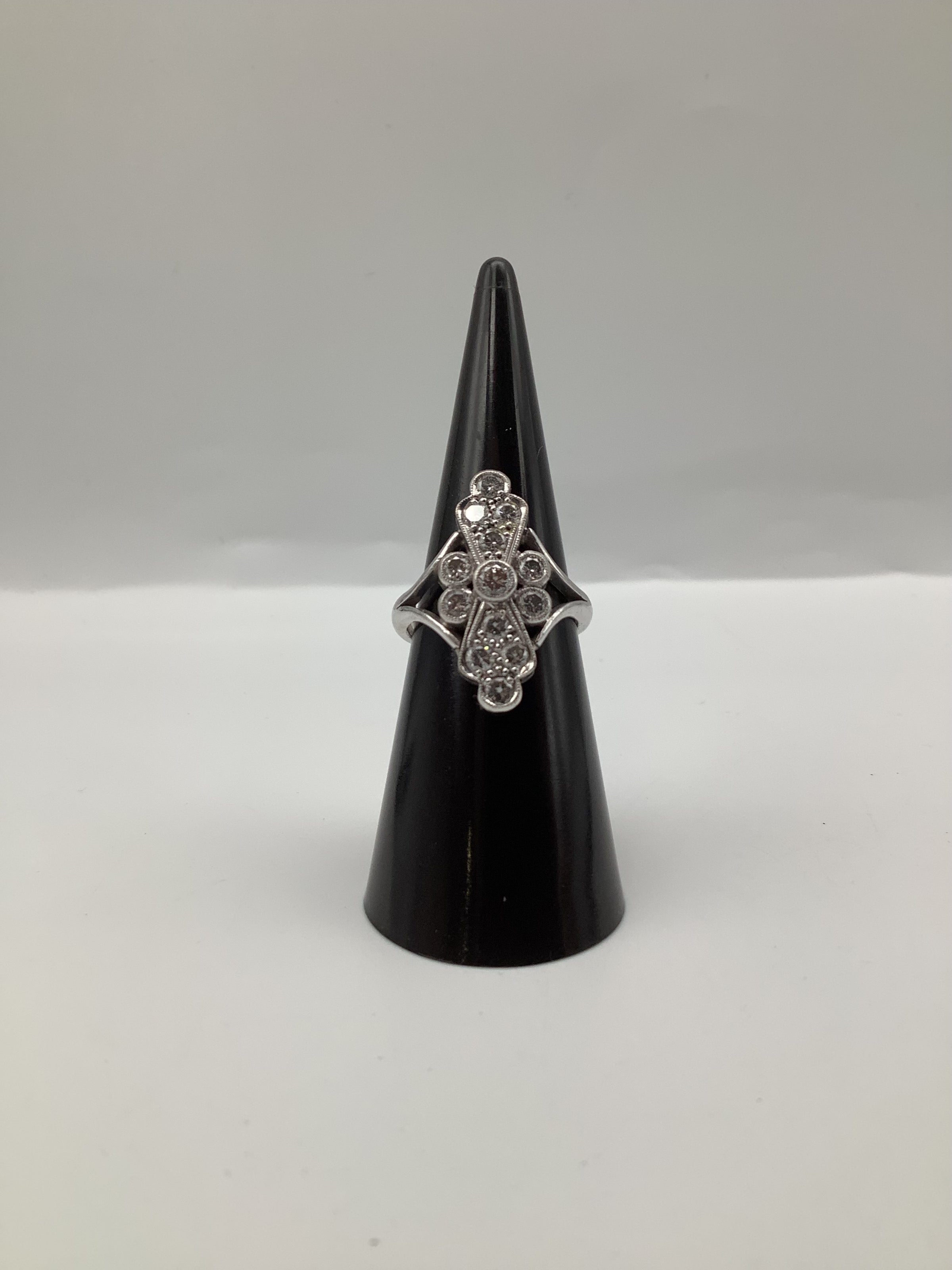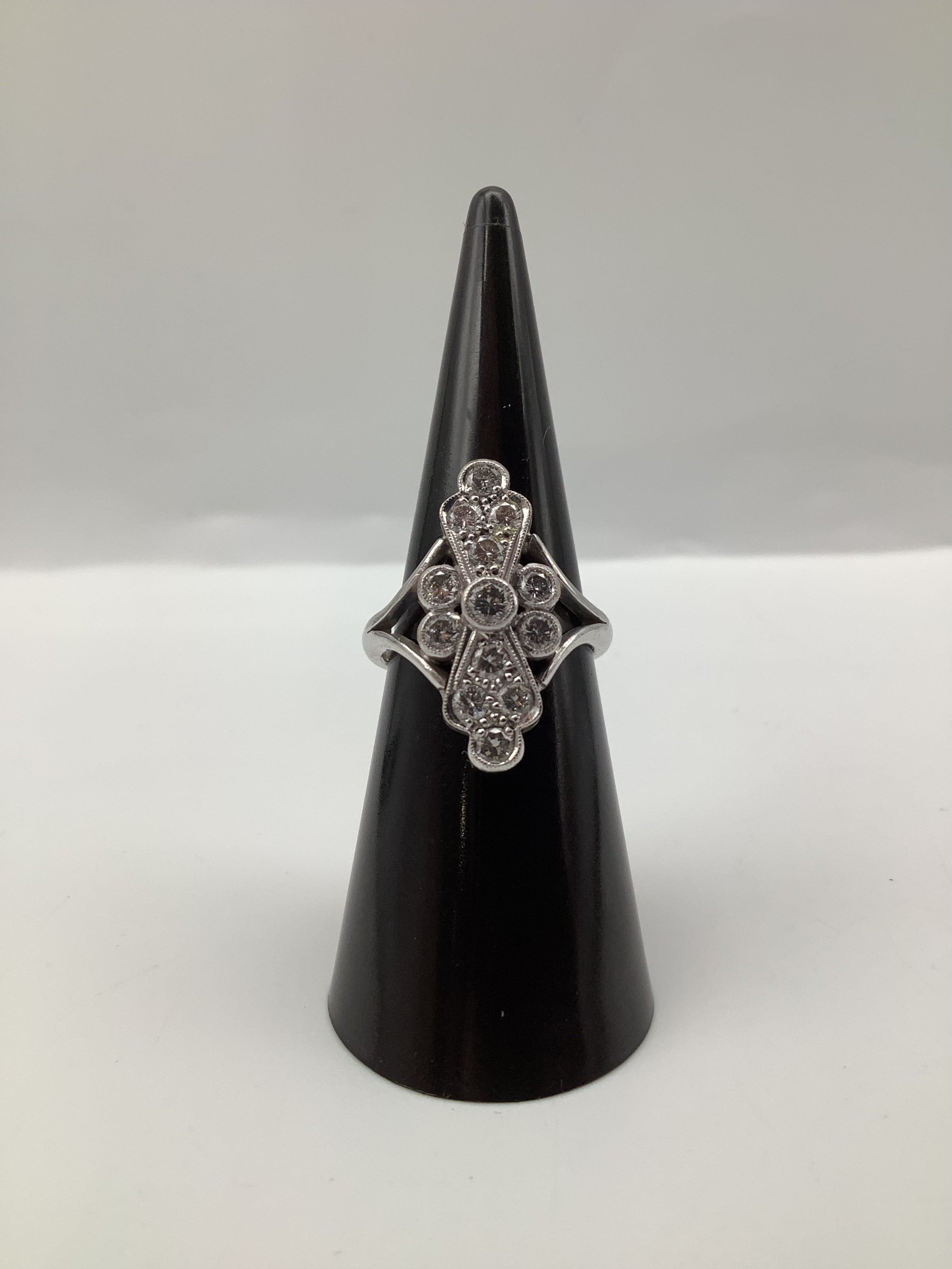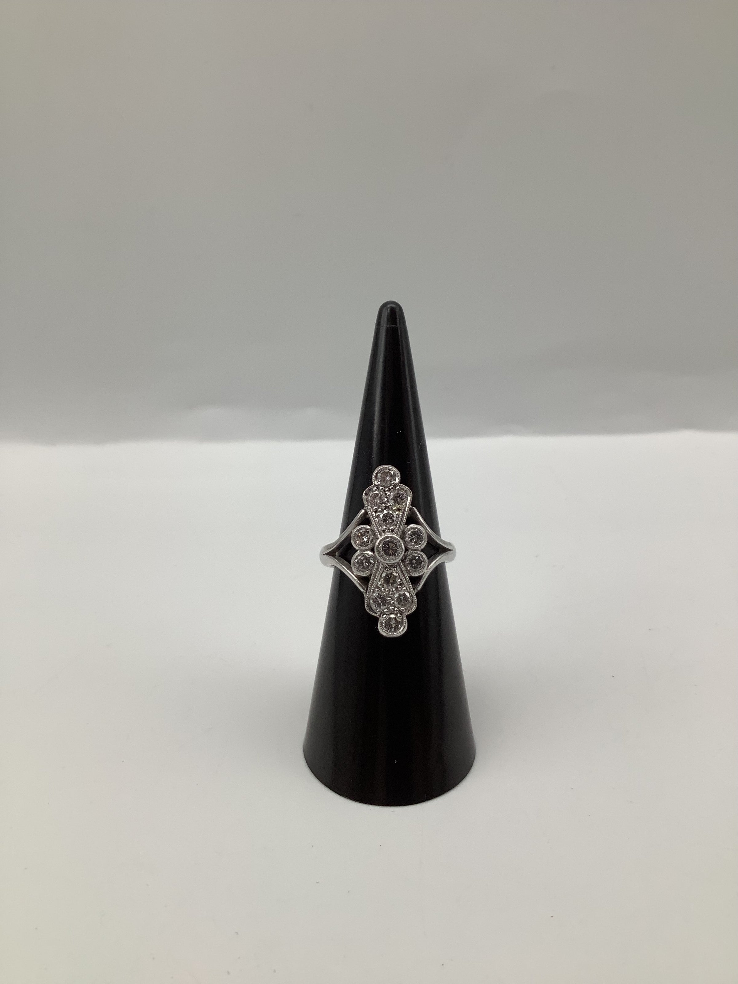 While specific brand information is not provided, this ring embodies the quintessential elements of Art Deco jewellery design, popular from the 1920s to the 1930s. The era is celebrated for its bold geometric patterns and lavish ornamentation, often incorporating diamonds and platinum or white gold settings. Such designs continue to influence contemporary jewellery, appealing to those who appreciate vintage aesthetics.