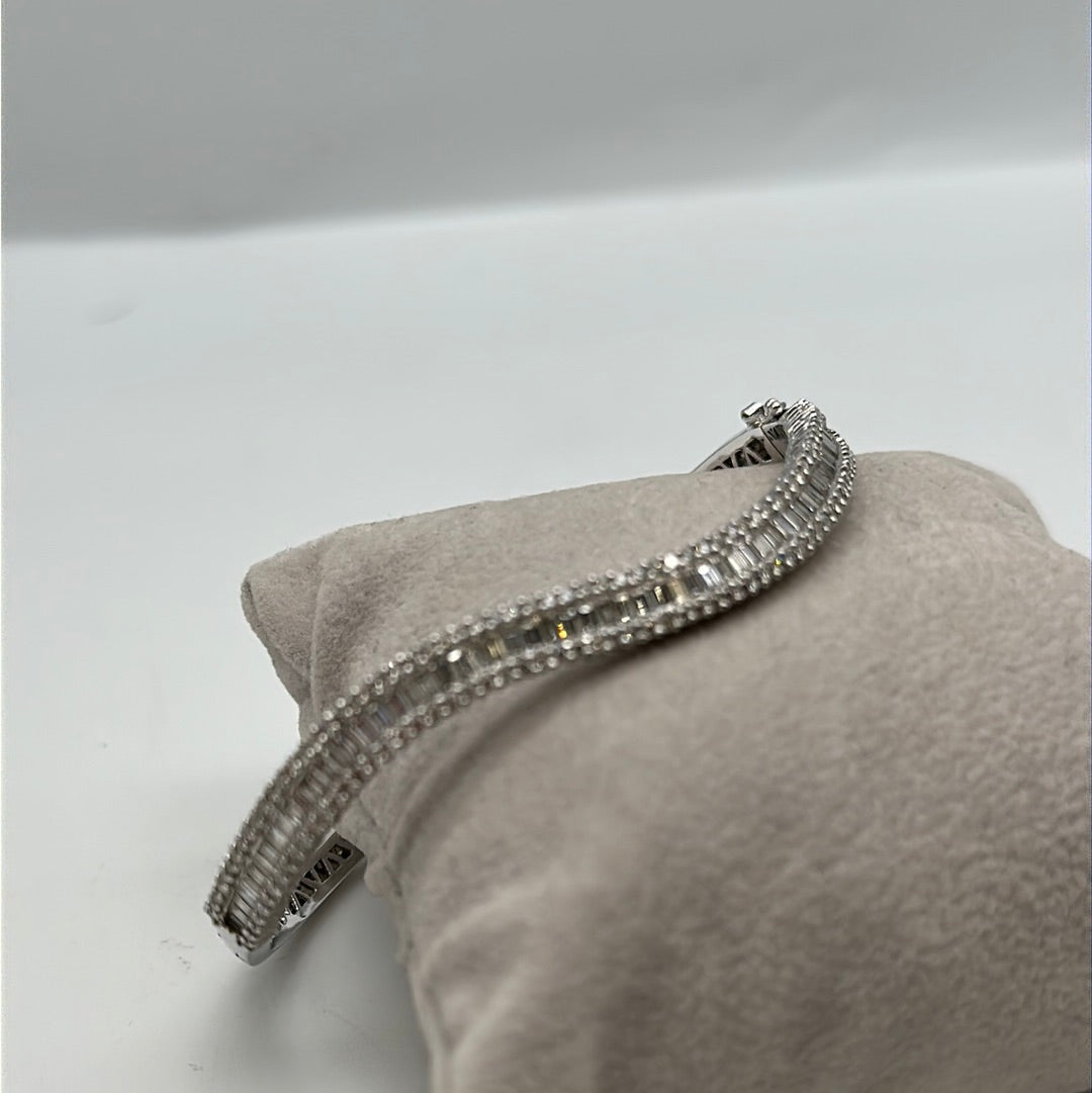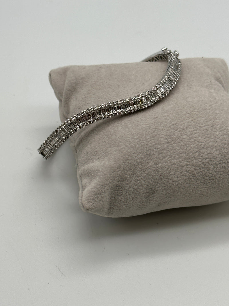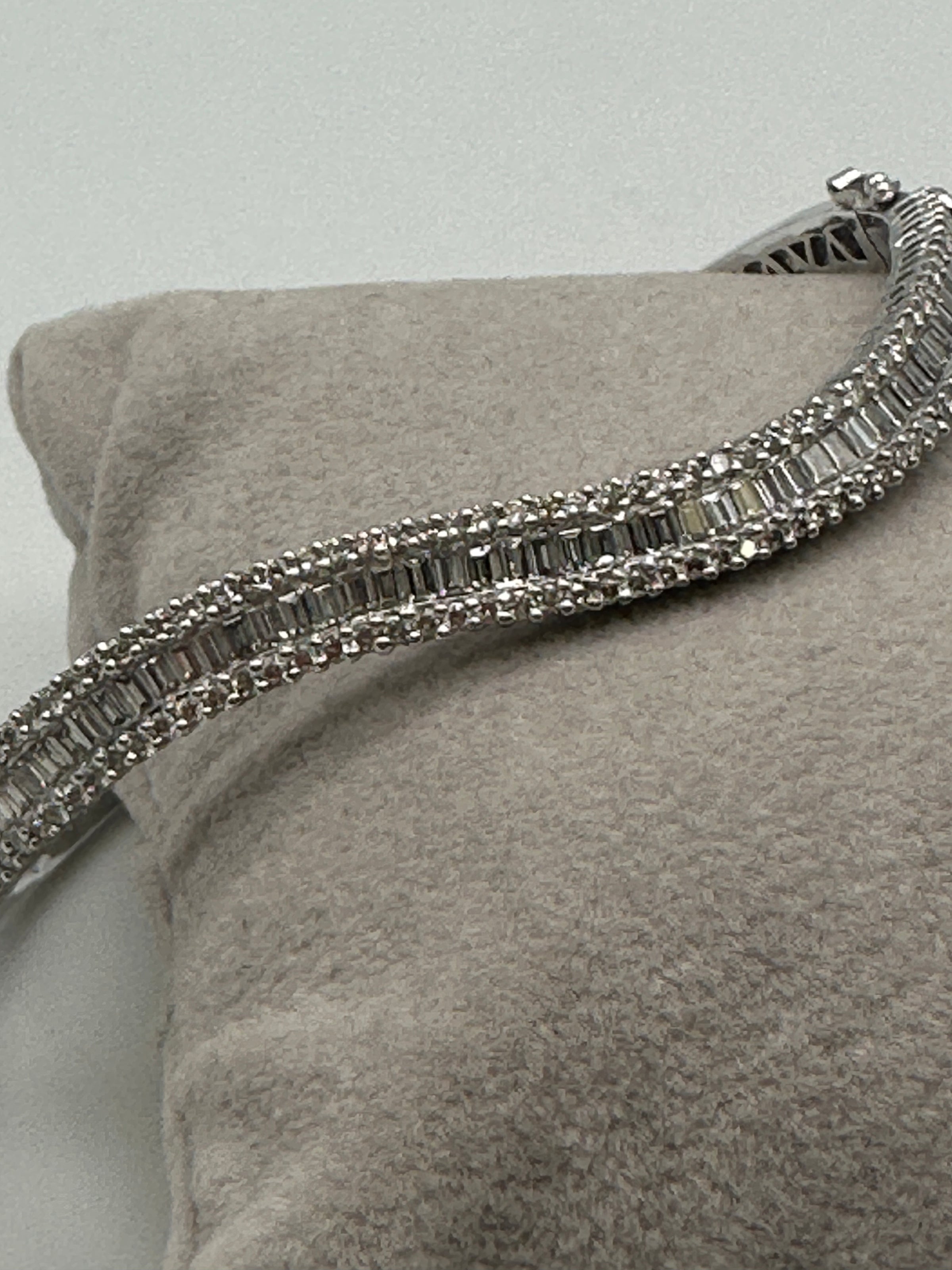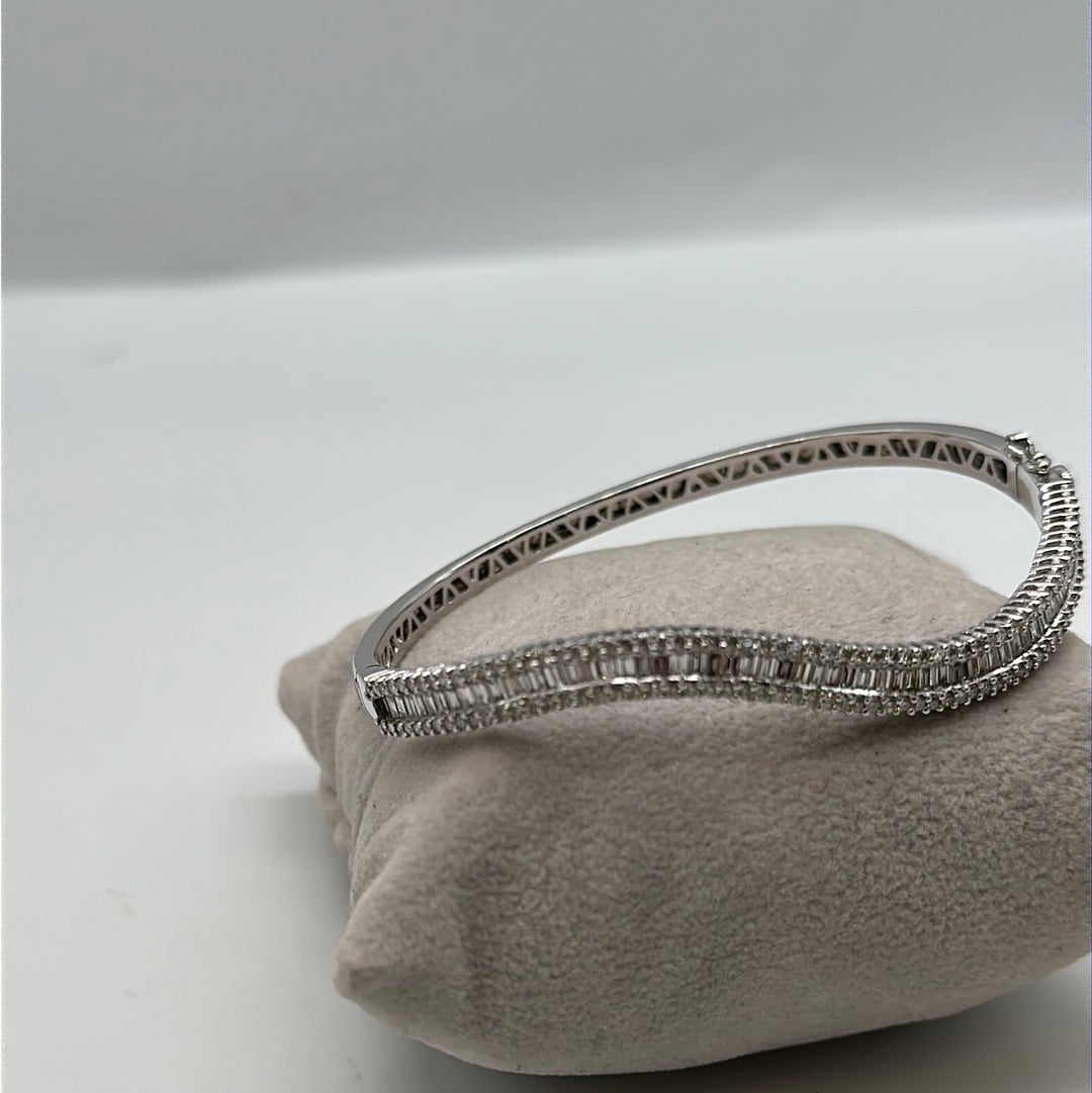 One ladies 18ct white gold diamond bangle set with baguette and brilliant cut diamonds in a wave across the top of the bangle, baguette cut diamonds are channel set wit ha row of brilliant cut diamonds on either side claw set.