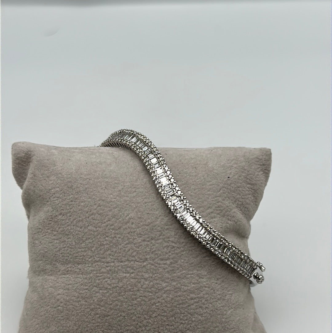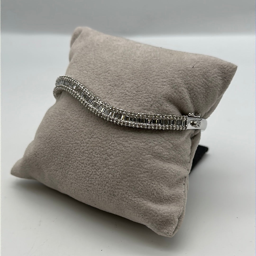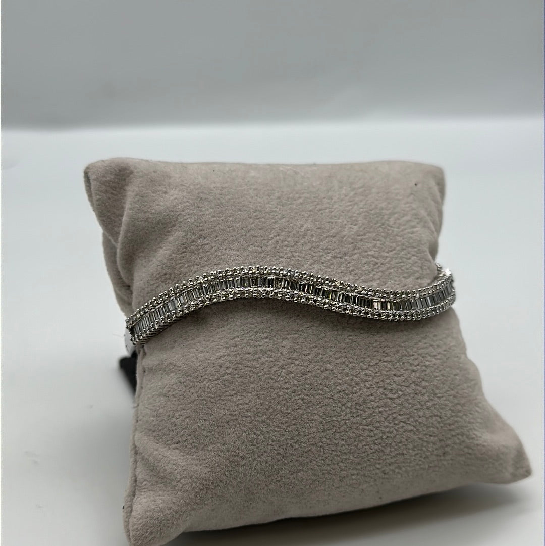 One ladies 18ct white gold diamond bangle set with baguette and brilliant cut diamonds in a wave across the top of the bangle, baguette cut diamonds are channel set wit ha row of brilliant cut diamonds on either side claw set.
