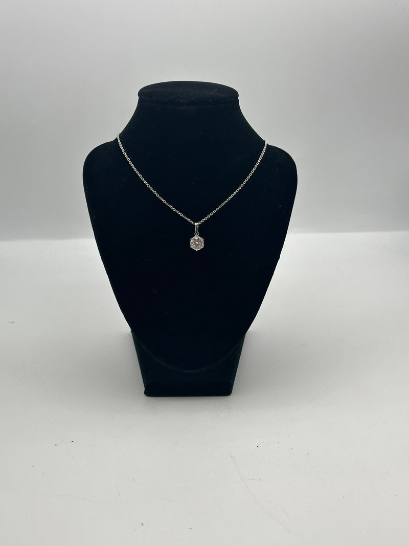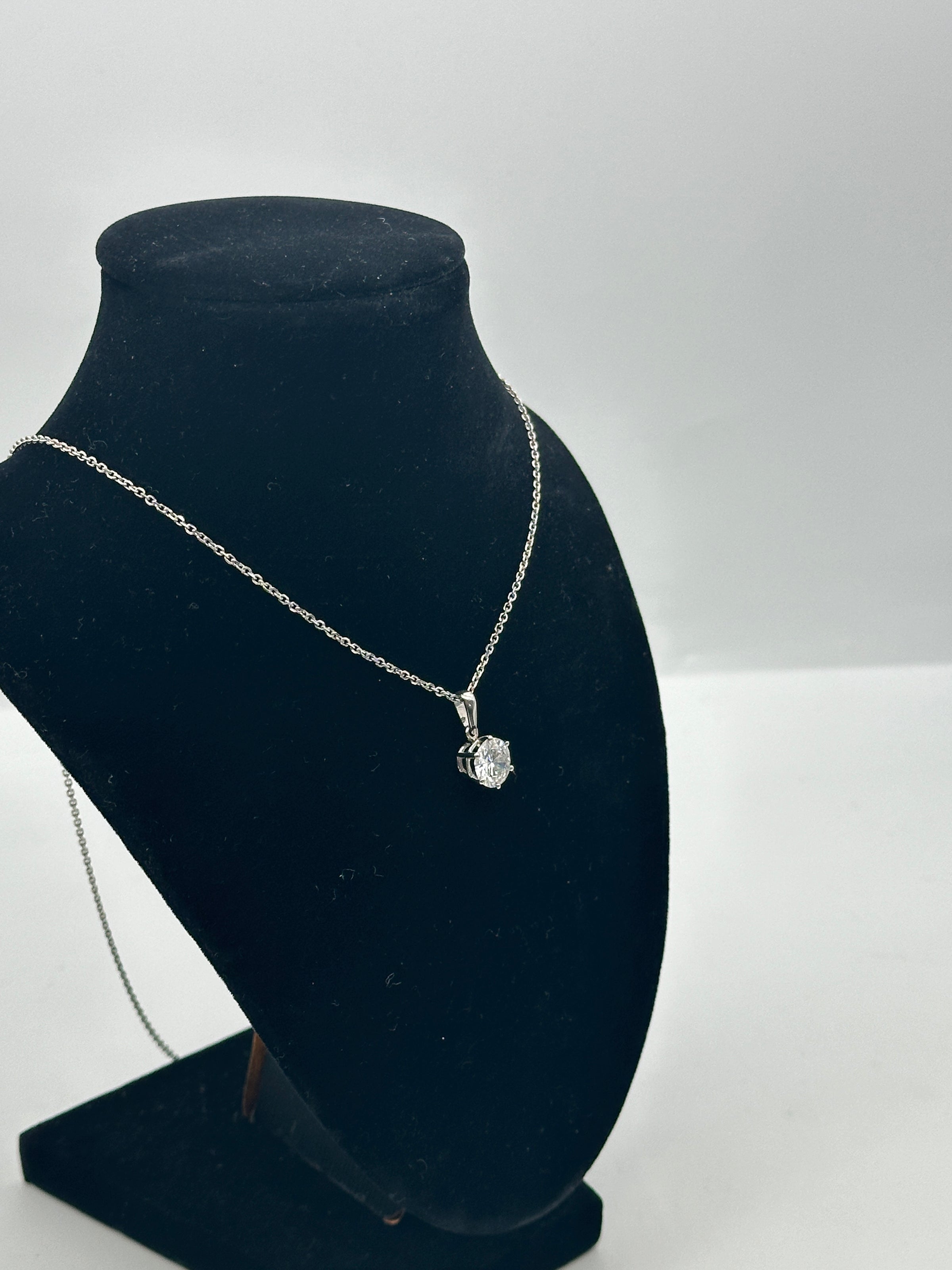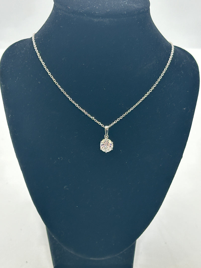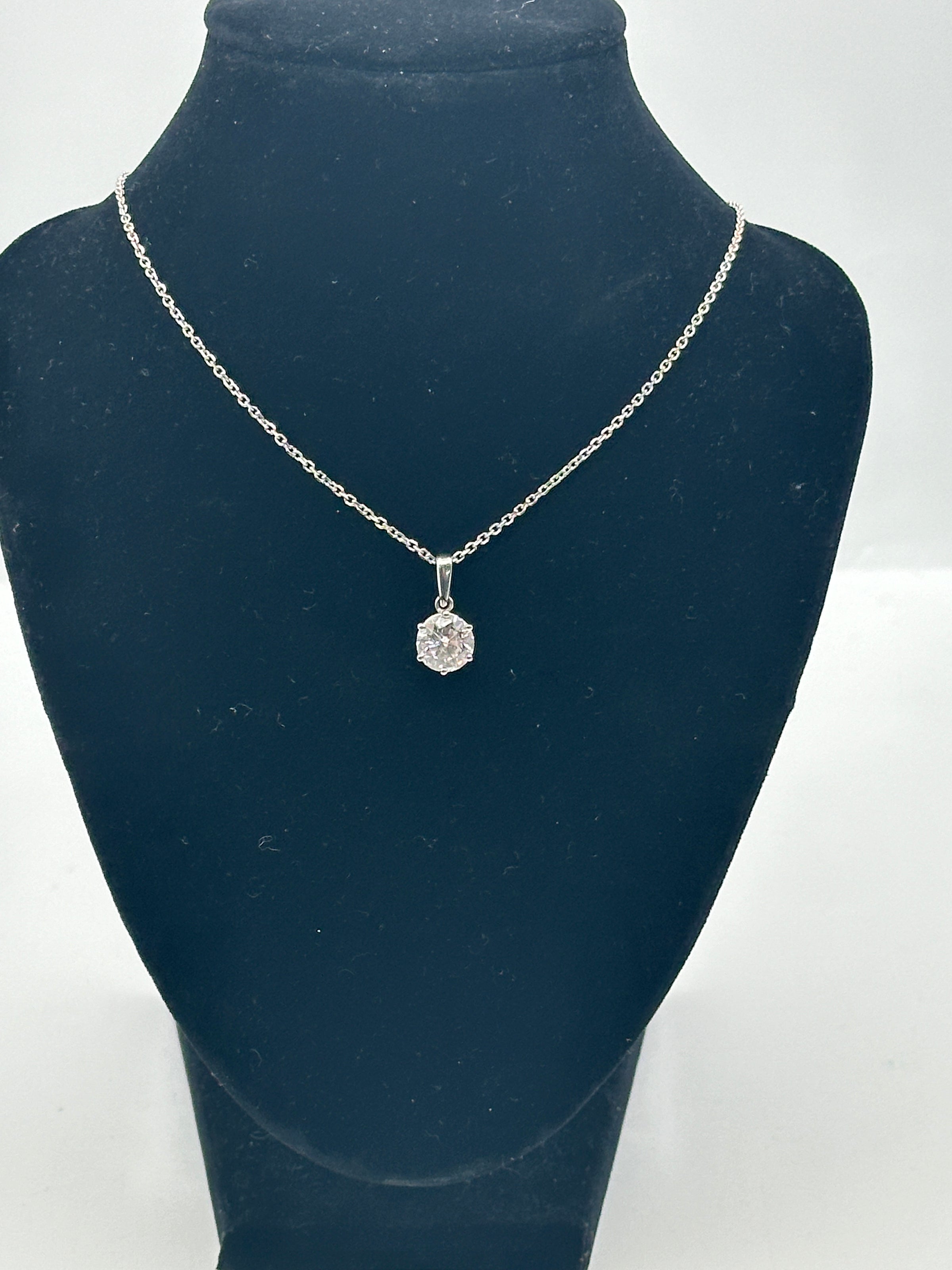 This stunning diamond pendant is in a platinum six claw setting with a platinum belcher chain, Brilliant Cut Diamond