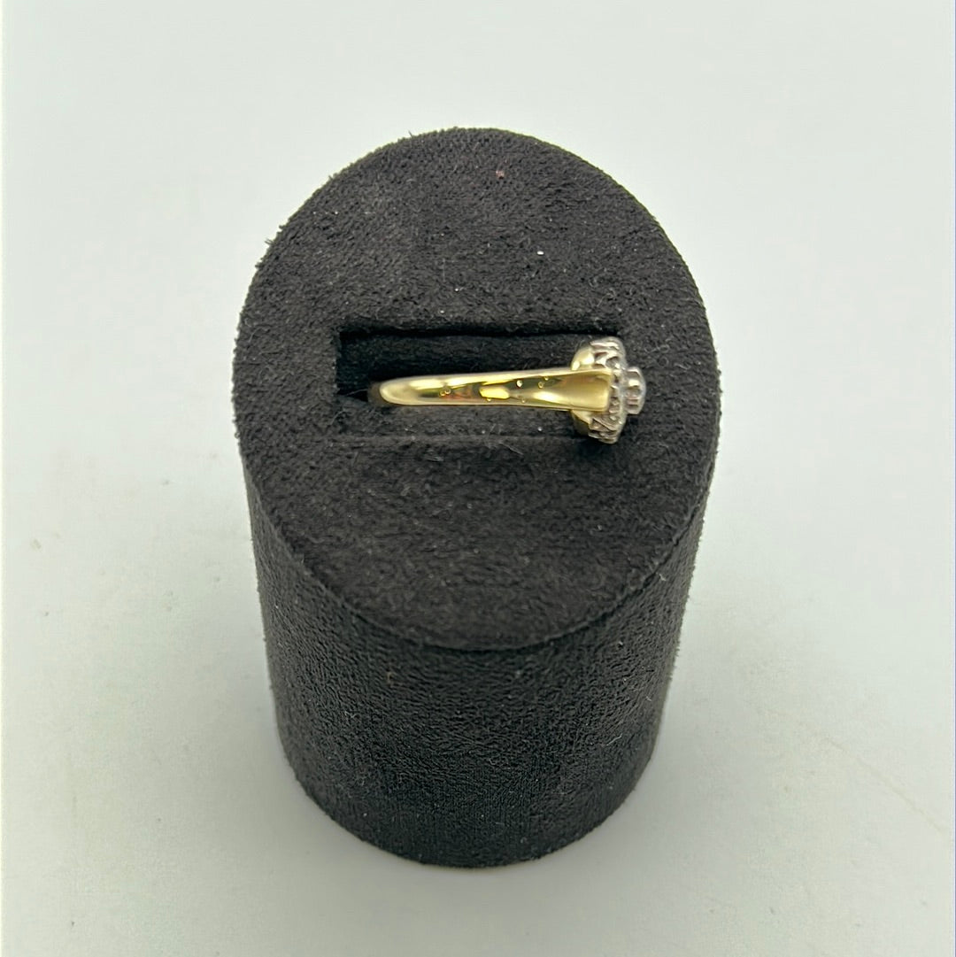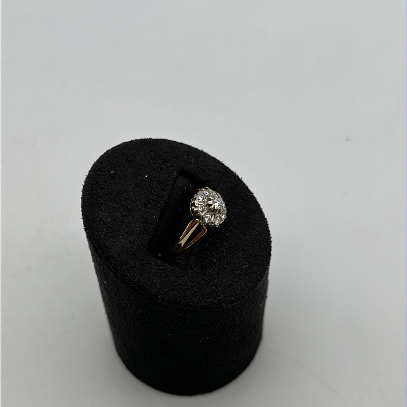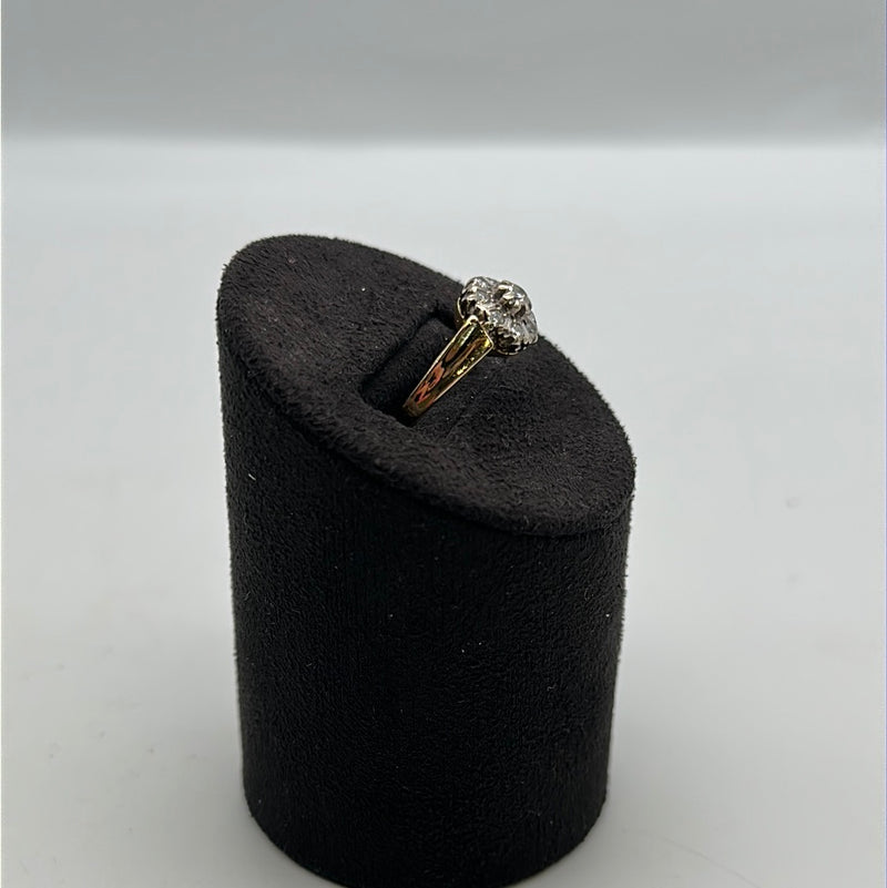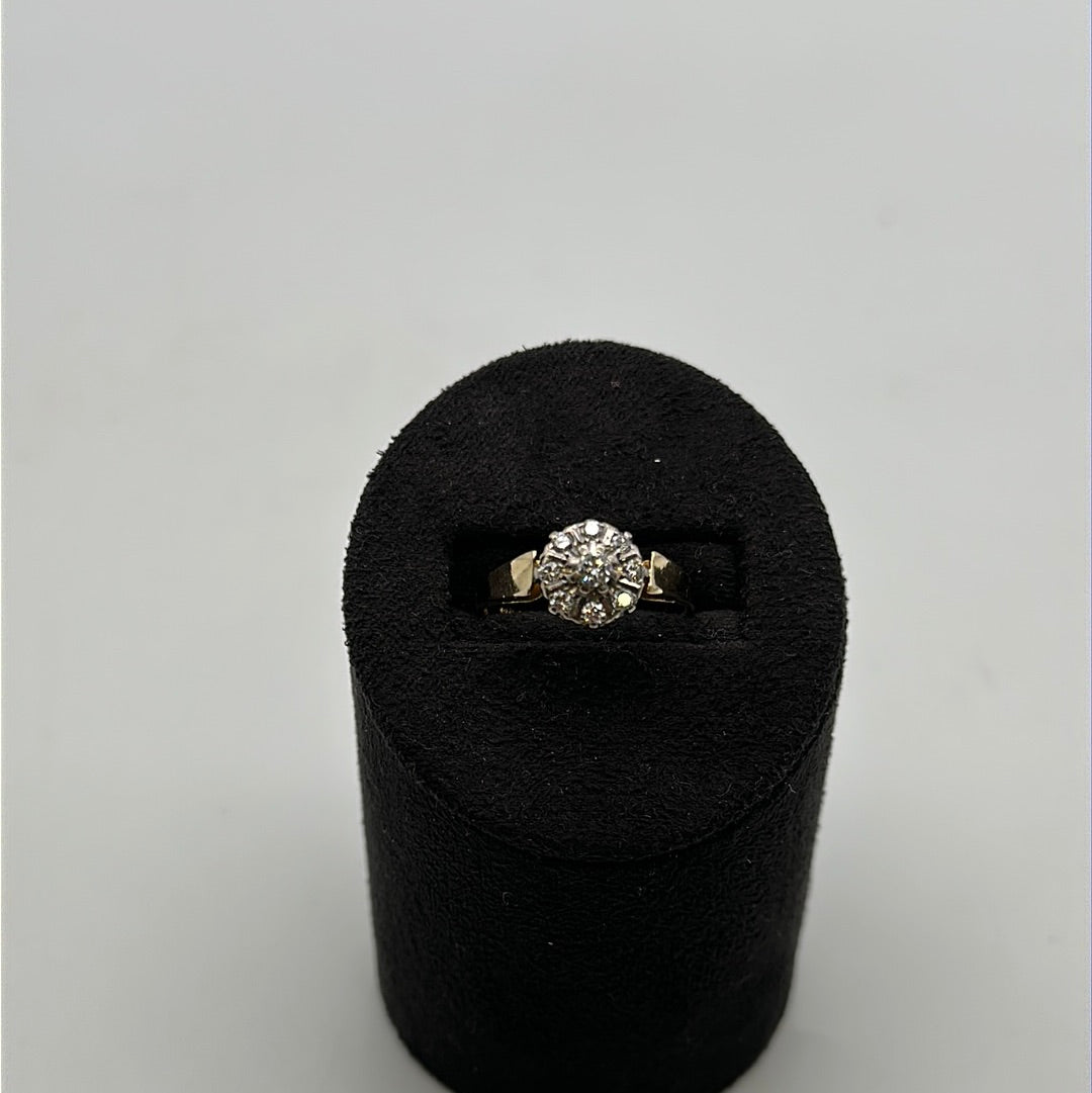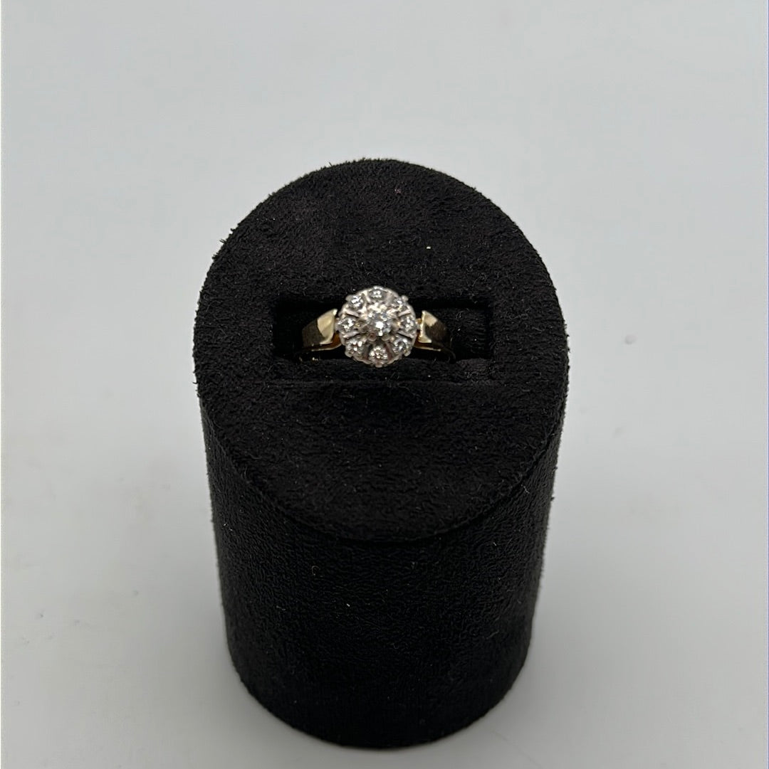 Beautiful 18ct Yellow Diamond Cluster Ring Set With Nine Brilliant Cut Diamonds In Claw Pavie Setting On A Tapered Yellow Gold Shank Platinum Collet.