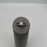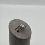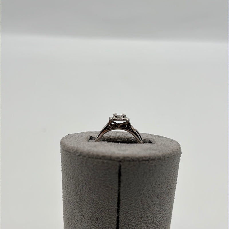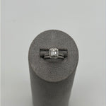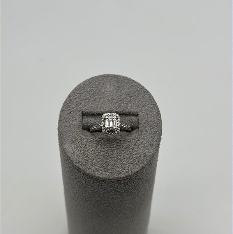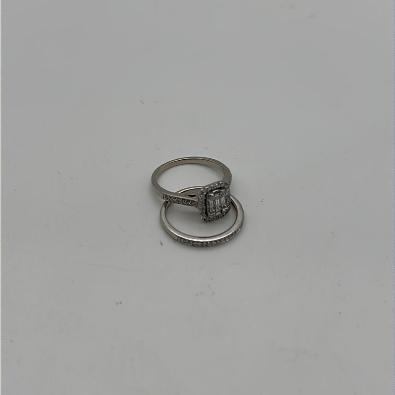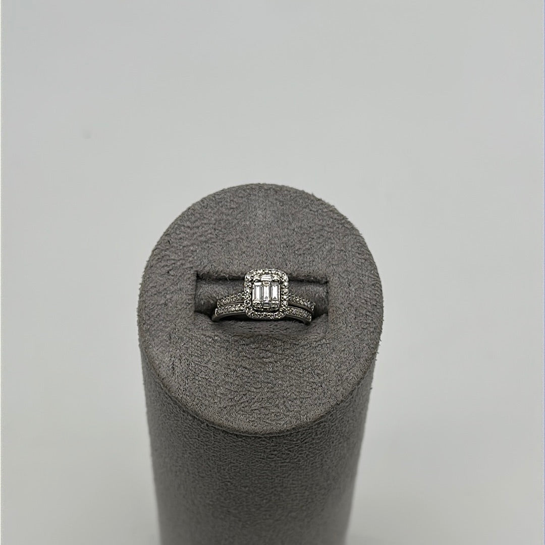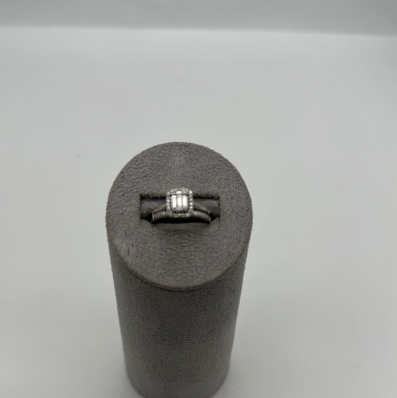 These beautiful 18ct white gold engagement and wedding band are set with baguette cut diamond centre pressure set with a halo of brilliant cut round the engagement ring and running down the shoulders, the wedding band has brilliant cut diamonds half way around the band in a pave setting.