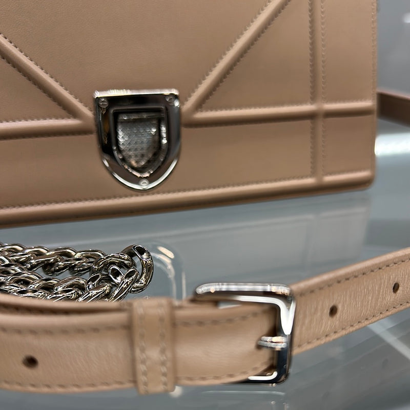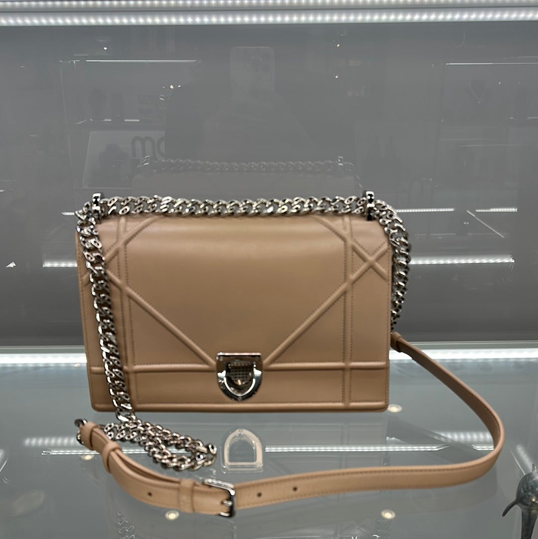 Chic Dior Diorama shoulder bag in varnished blush nude leather, hardware in silver metal, one chain strap in silver metal allowing the bag to be worn on the shoulder or across the body, comes with original card and dust bag.