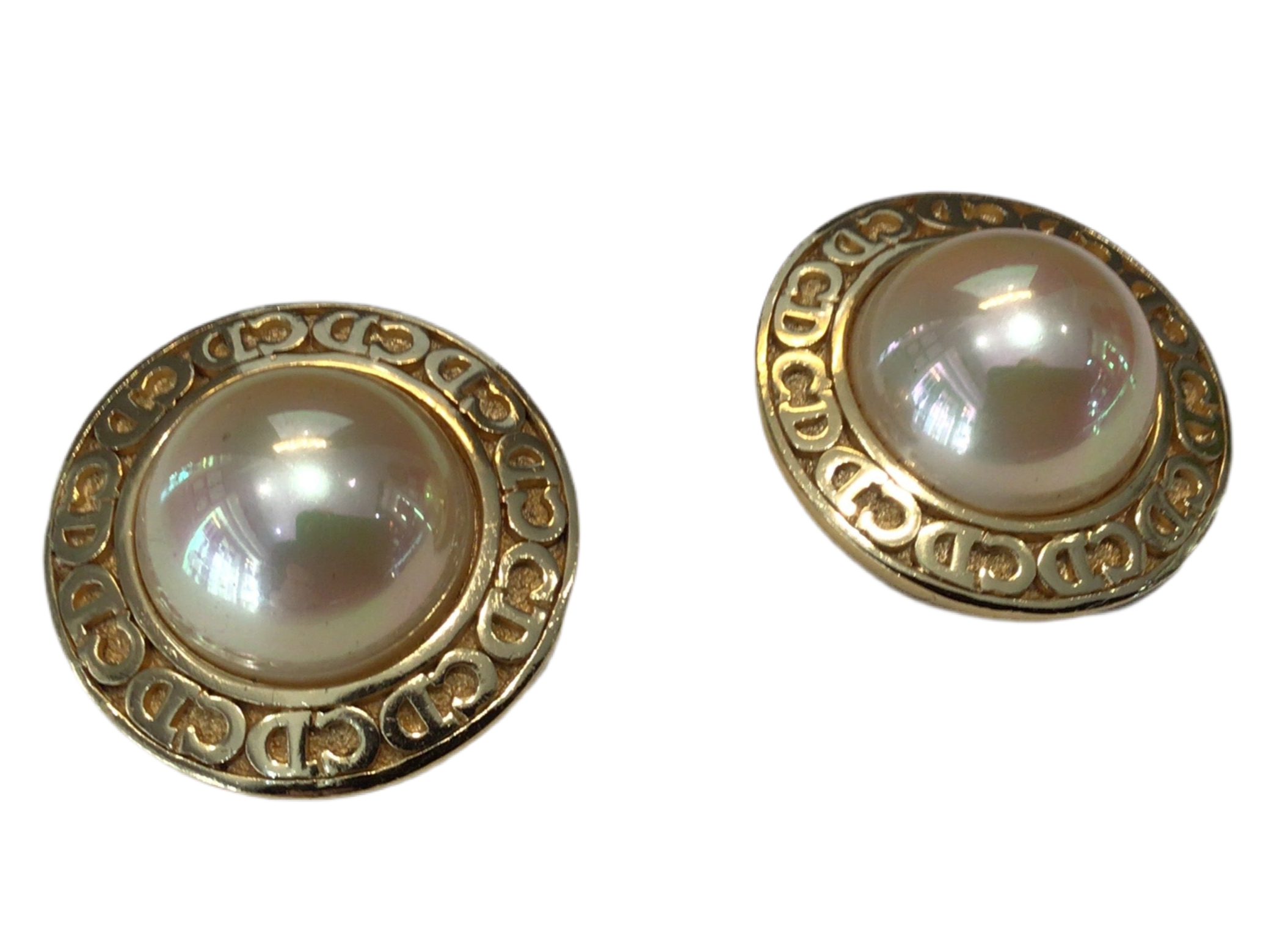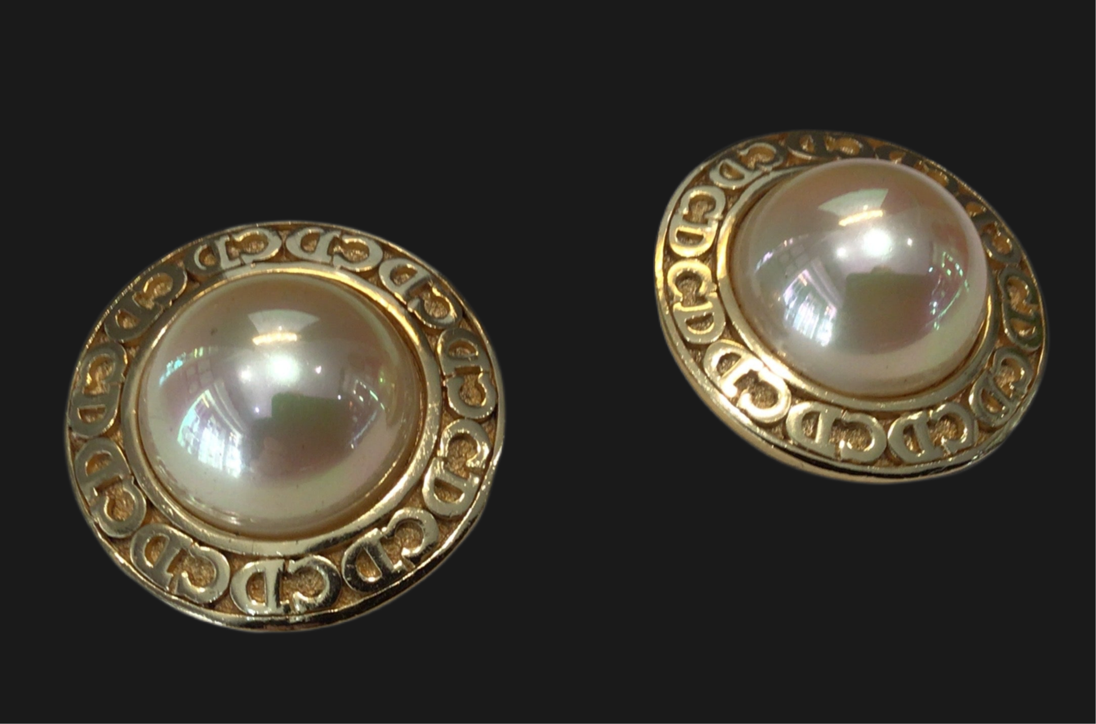 • Material: Gold-tone metal base with large faux pearls or resin pearls; clip-on mechanism (non-pierced) made to Dior’s standards; possibly with the “CD” signature detail.