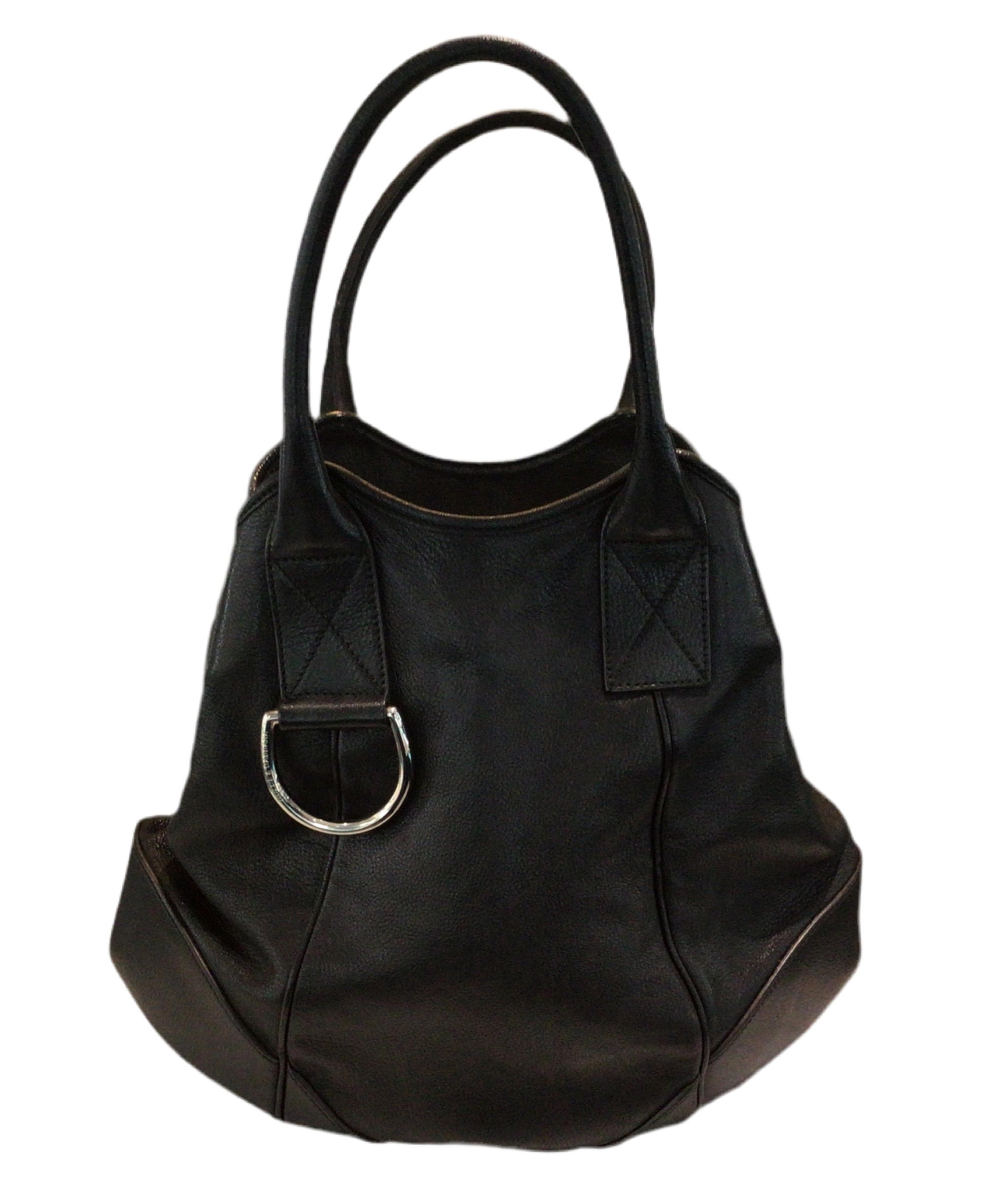 Design & Hardware: Features dual rolled leather handles, polished silver-tone hardware, and a distinctive D‑ring.