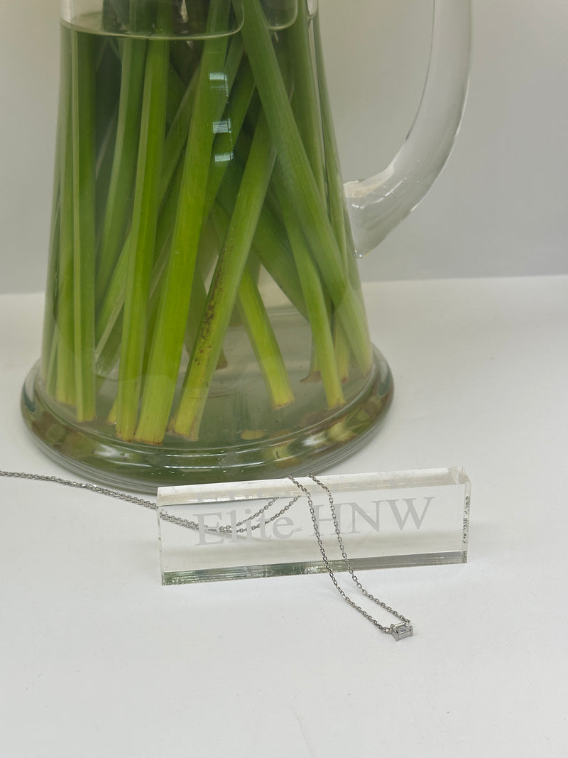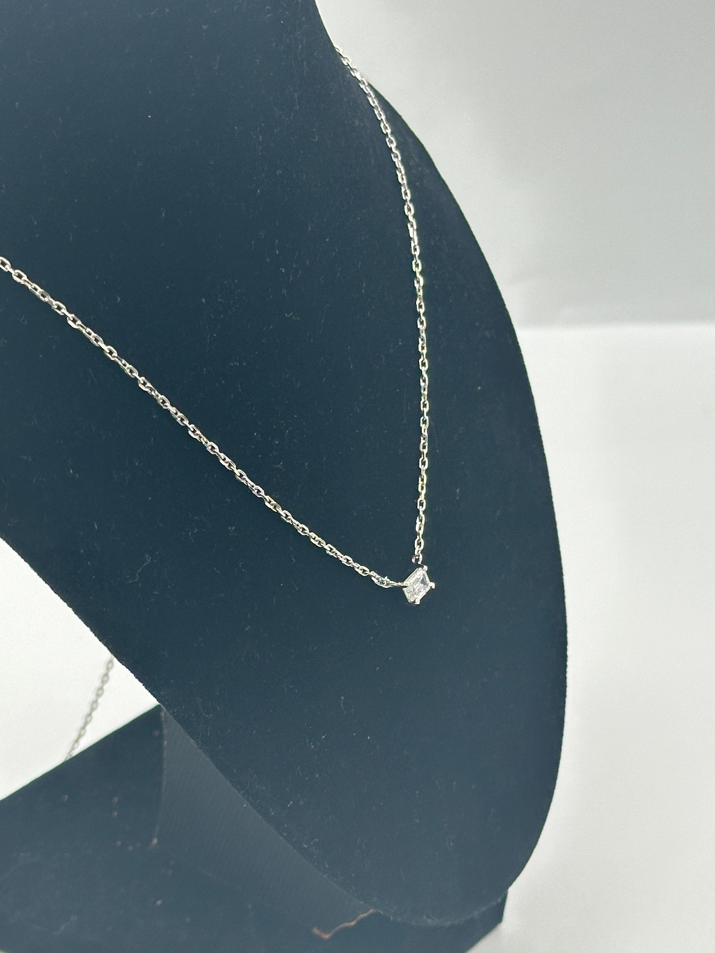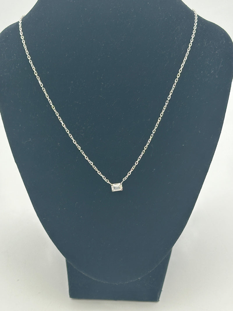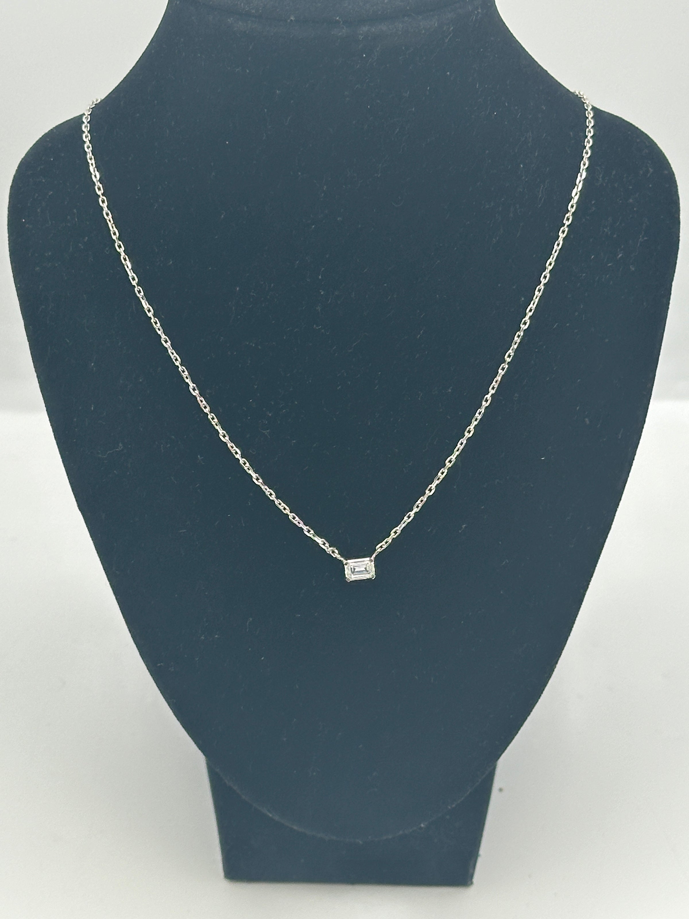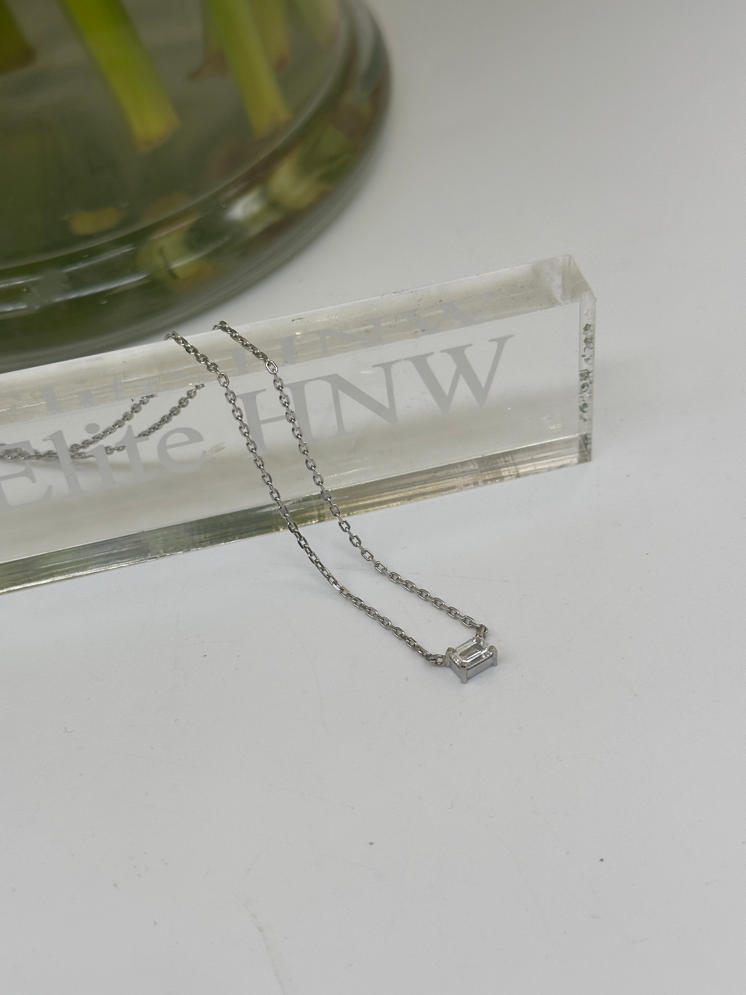 This exquisite pendant features a 0.50ct emerald-cut diamond set in a timeless platinum mount, suspended from a 21-inch platinum chain. The clean lines of the emerald cut paired with the icy lustre of platinum offer a refined and minimalist aesthetic, perfect for everyday wear or special occasions. With a design that prioritises clarity and proportion, this piece embodies understated luxury. -