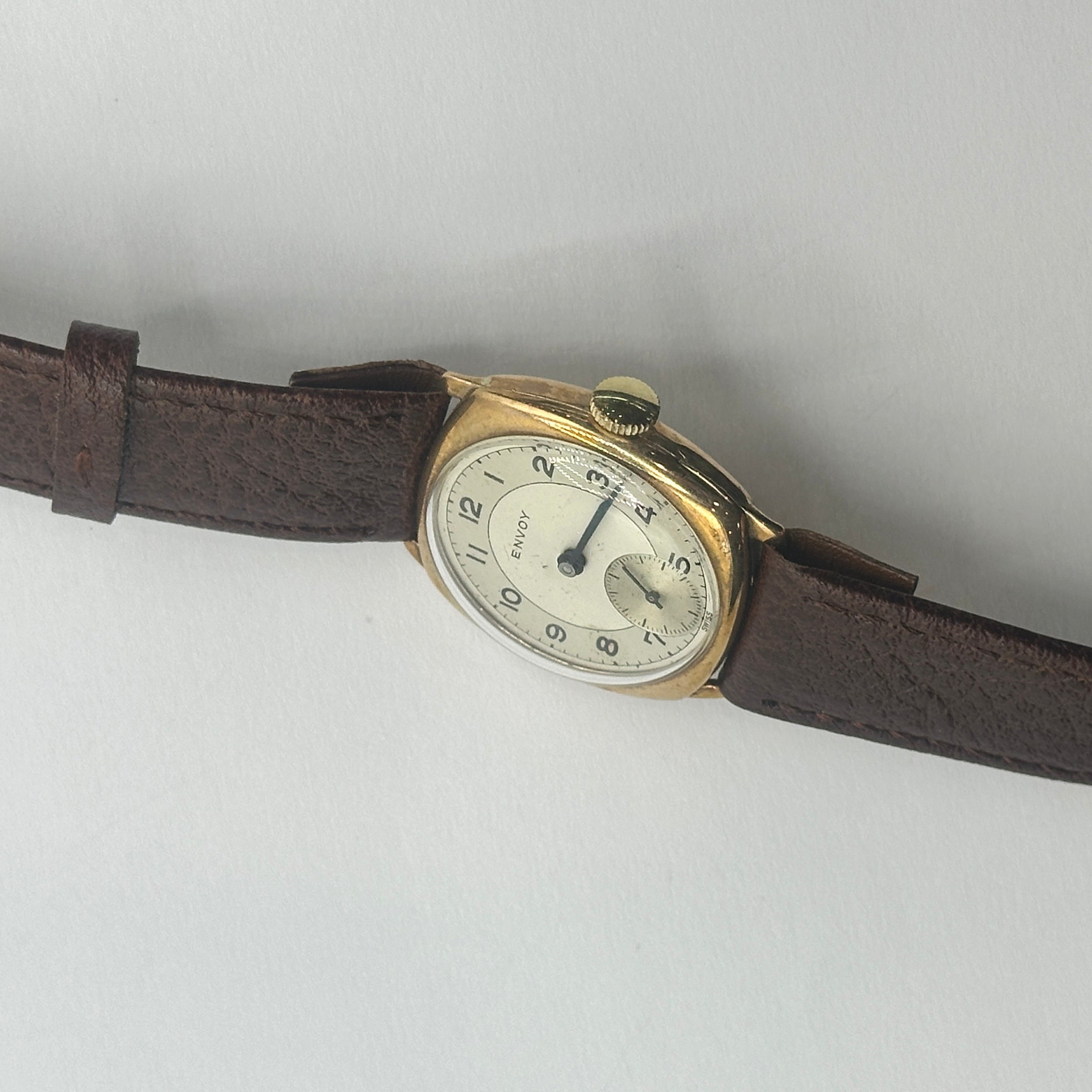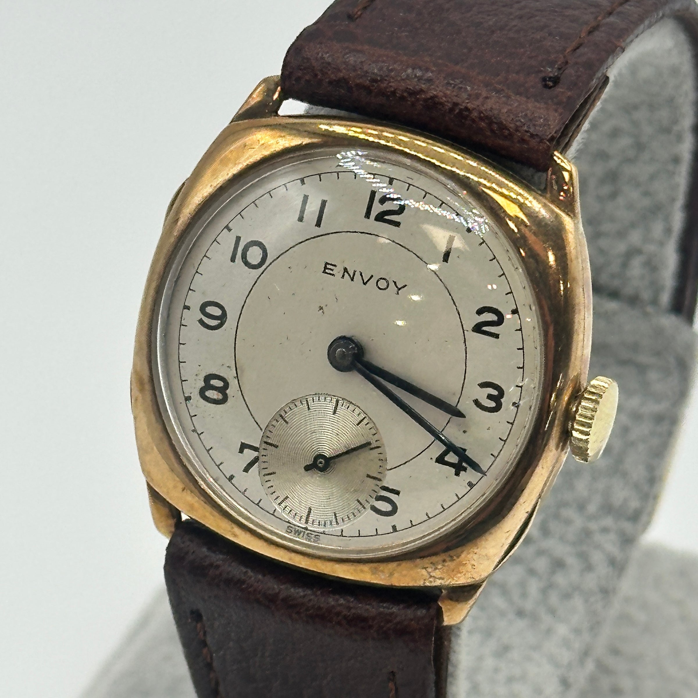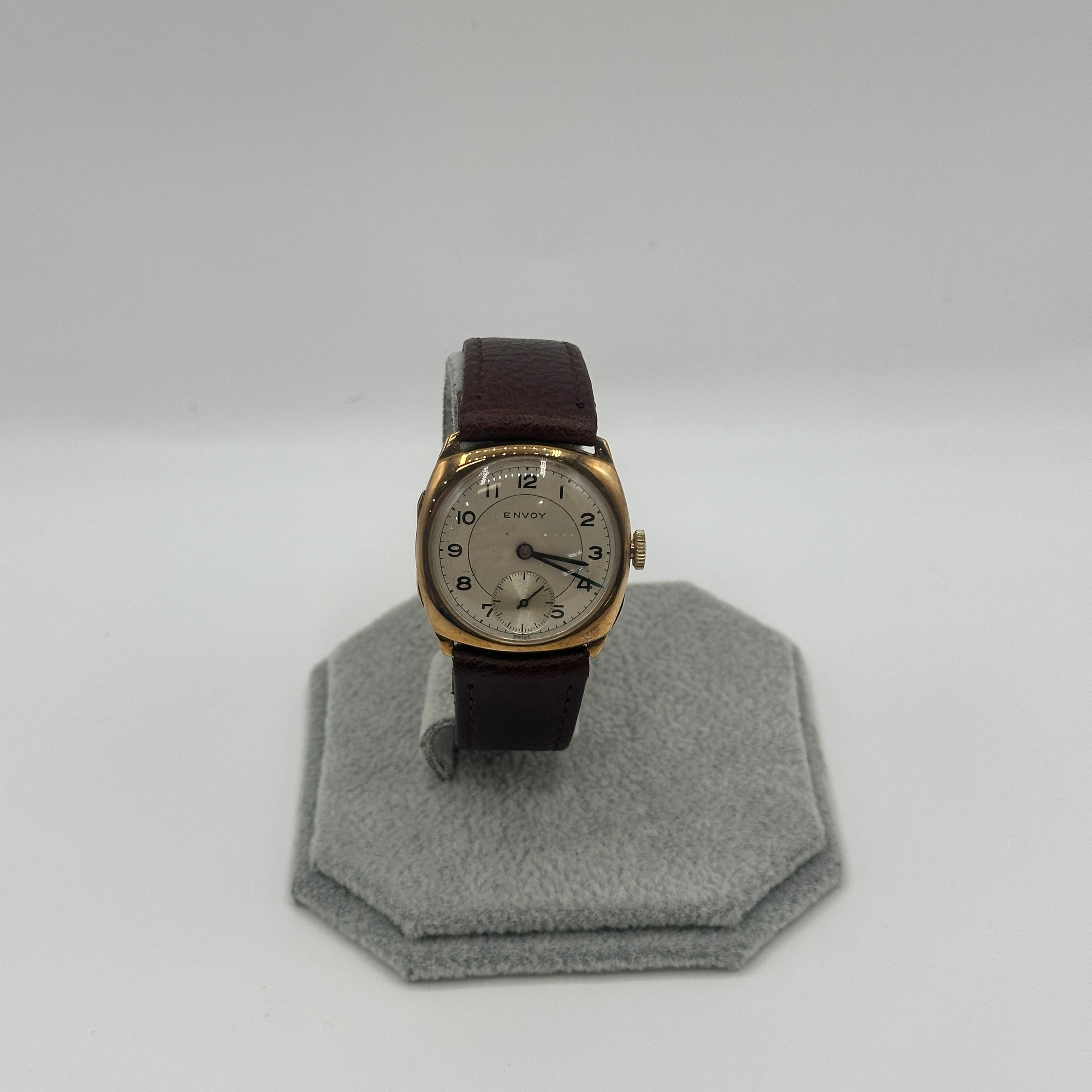 A charming example of vintage mid-century watch design, this Envoy wristwatch from 1960 is crafted from solid 9ct yellow gold. The cushion-shaped case surrounds a silvered dial with bold black Arabic numeral hour markers and a small seconds subdial at 6 o'clock, offering a classic, functional aesthetic. Measuring approximately 30mm across, the case is complemented by a brown textured leather strap and a gold-tone buckle. Powered by a manual wind movement, this watch embodies a timeless simplicity, perfect for collectors seeking a piece of understated vintage style.