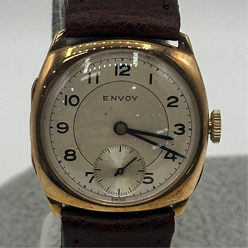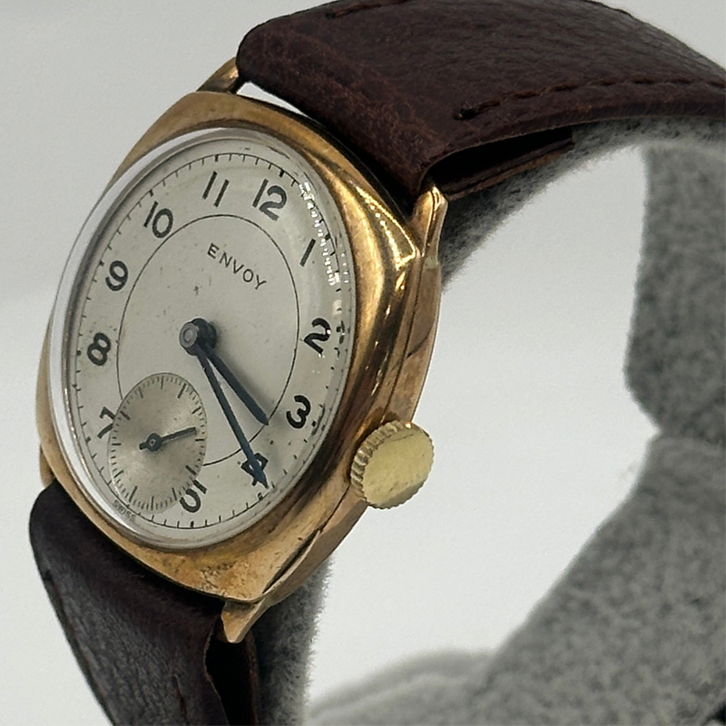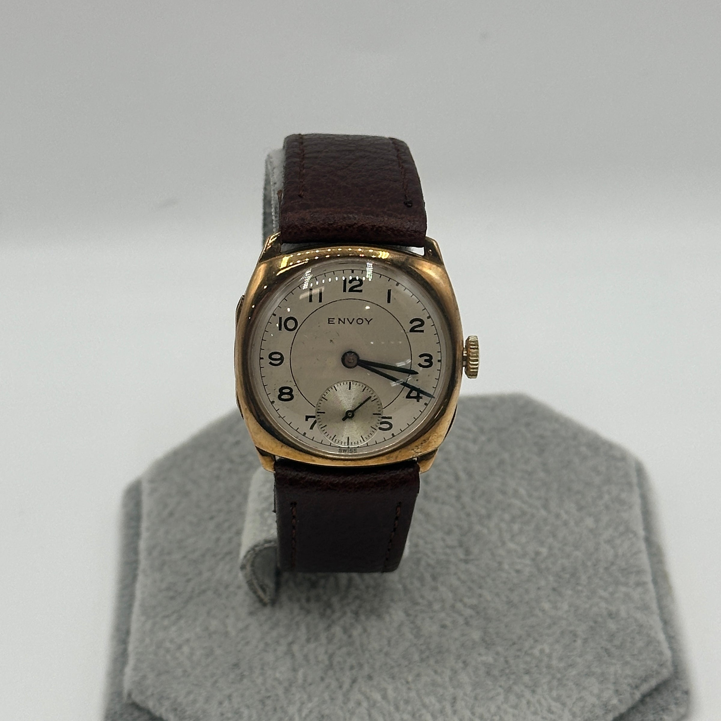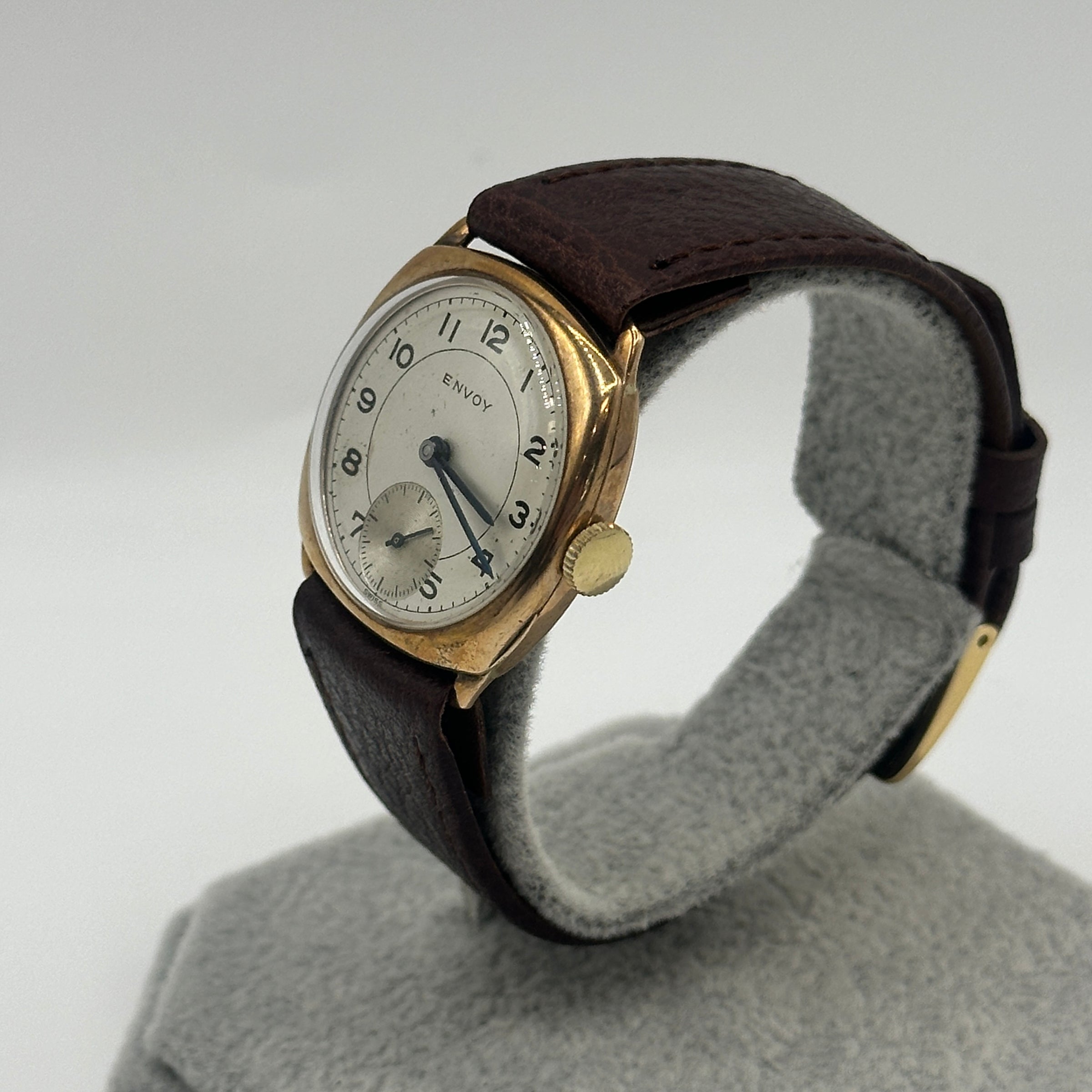 A charming example of vintage mid-century watch design, this Envoy wristwatch from 1960 is crafted from solid 9ct yellow gold. The cushion-shaped case surrounds a silvered dial with bold black Arabic numeral hour markers and a small seconds subdial at 6 o'clock, offering a classic, functional aesthetic. Measuring approximately 30mm across, the case is complemented by a brown textured leather strap and a gold-tone buckle. Powered by a manual wind movement, this watch embodies a timeless simplicity, perfect for collectors seeking a piece of understated vintage style.