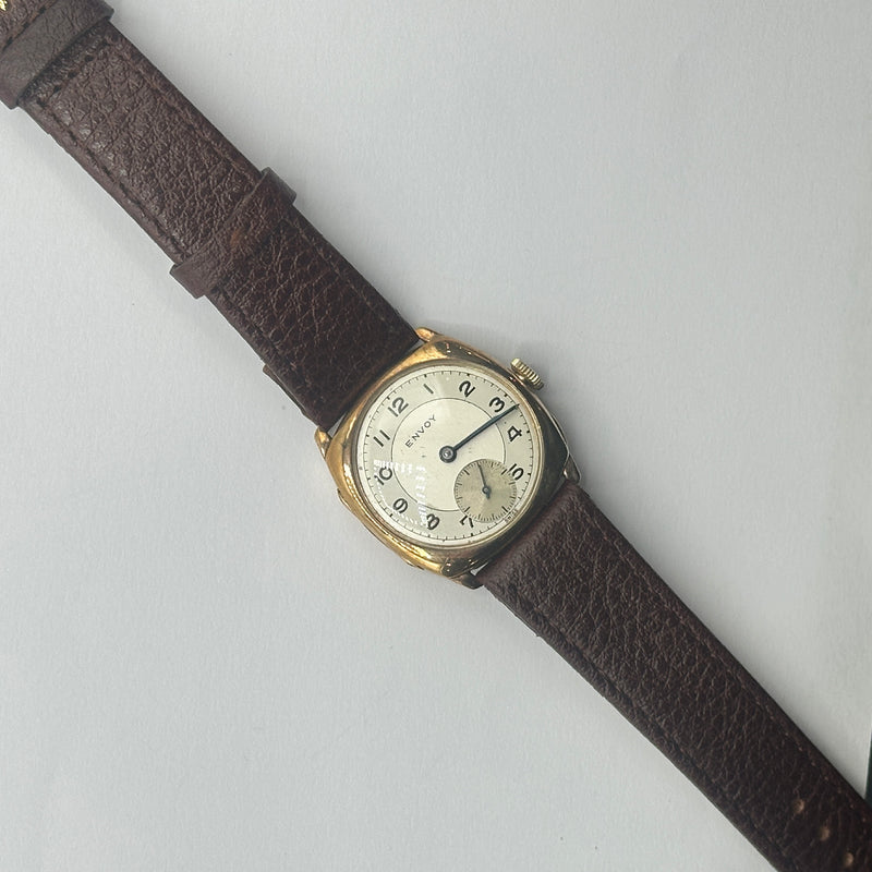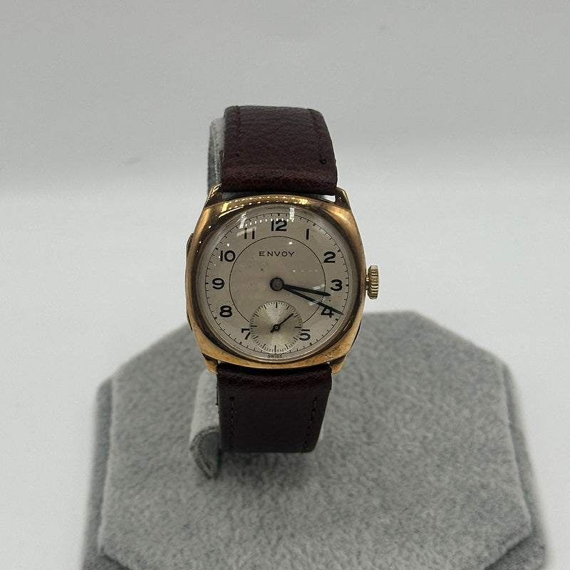 Envoy watches were part of a respected tradition of mid-20th-century Swiss and British watchmaking, offering well-crafted timepieces at an accessible luxury level. Known for their elegant, durable designs and reliable mechanical movements, Envoy produced watches that have remained desirable for vintage enthusiasts. This 1960 9ct gold model captures the post-war period’s emphasis on practicality blended with a touch of refined style, making it an excellent choice for collectors and vintage watch lovers.