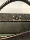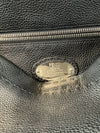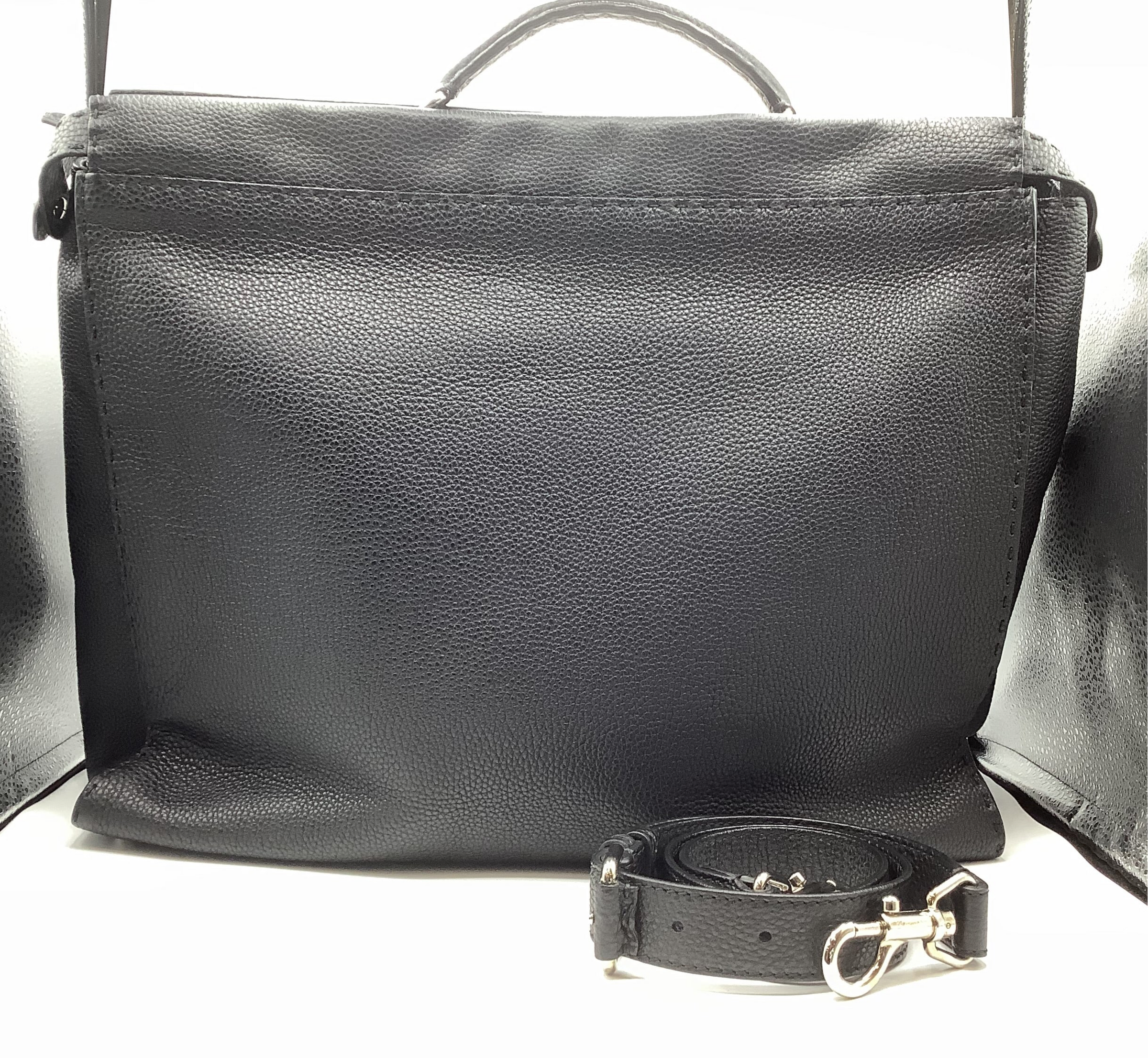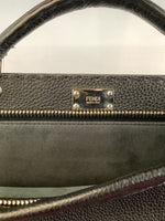 The Fendi Peekaboo Large is a refined and versatile accessory, designed to accommodate the demands of modern life. Crafted from premium black pebbled leather, it features a structured silhouette complemented by silver-tone hardware. The bag offers dual interior compartments, separated by a stiff partition, and secured with the iconic twist-lock closures. An adjustable and detachable shoulder strap provides versatility, while the top handle allows for classic hand-carrying. The interior is lined with soft suede, providing a luxurious touch to its practical design.
