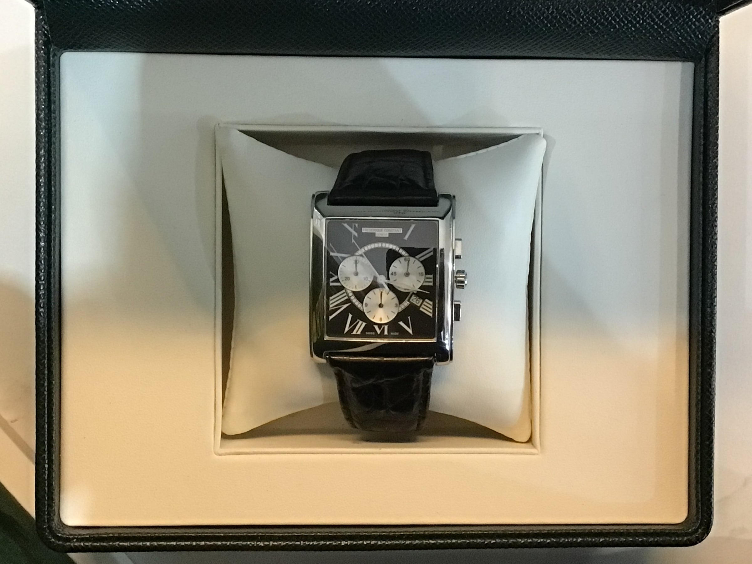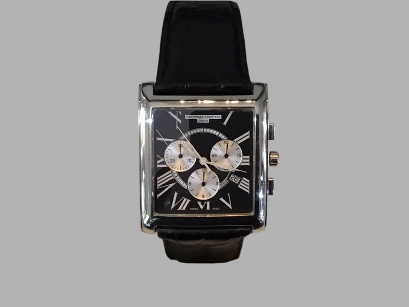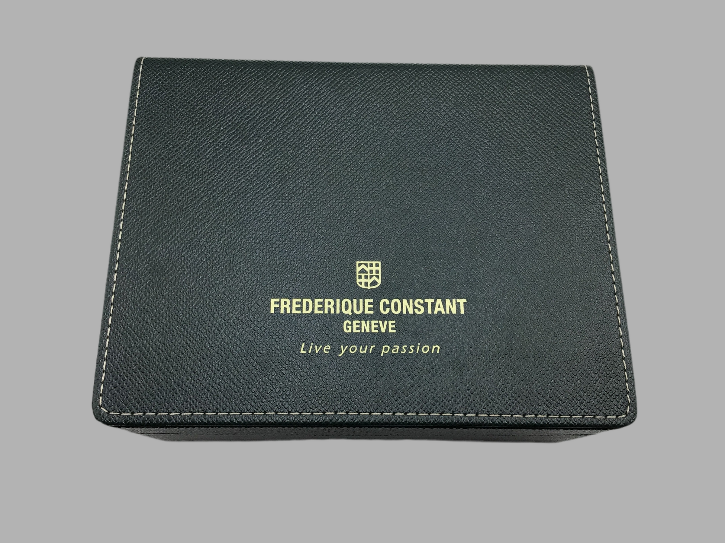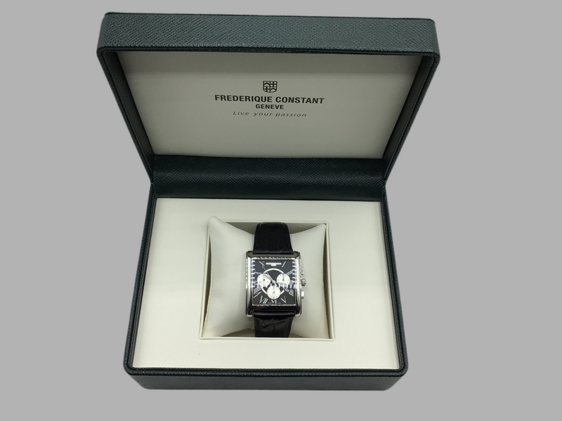 This classic men’s Frederique Constant watch comes with a leather strap and original box. There is no paperwork or certificates accompanying this watch.