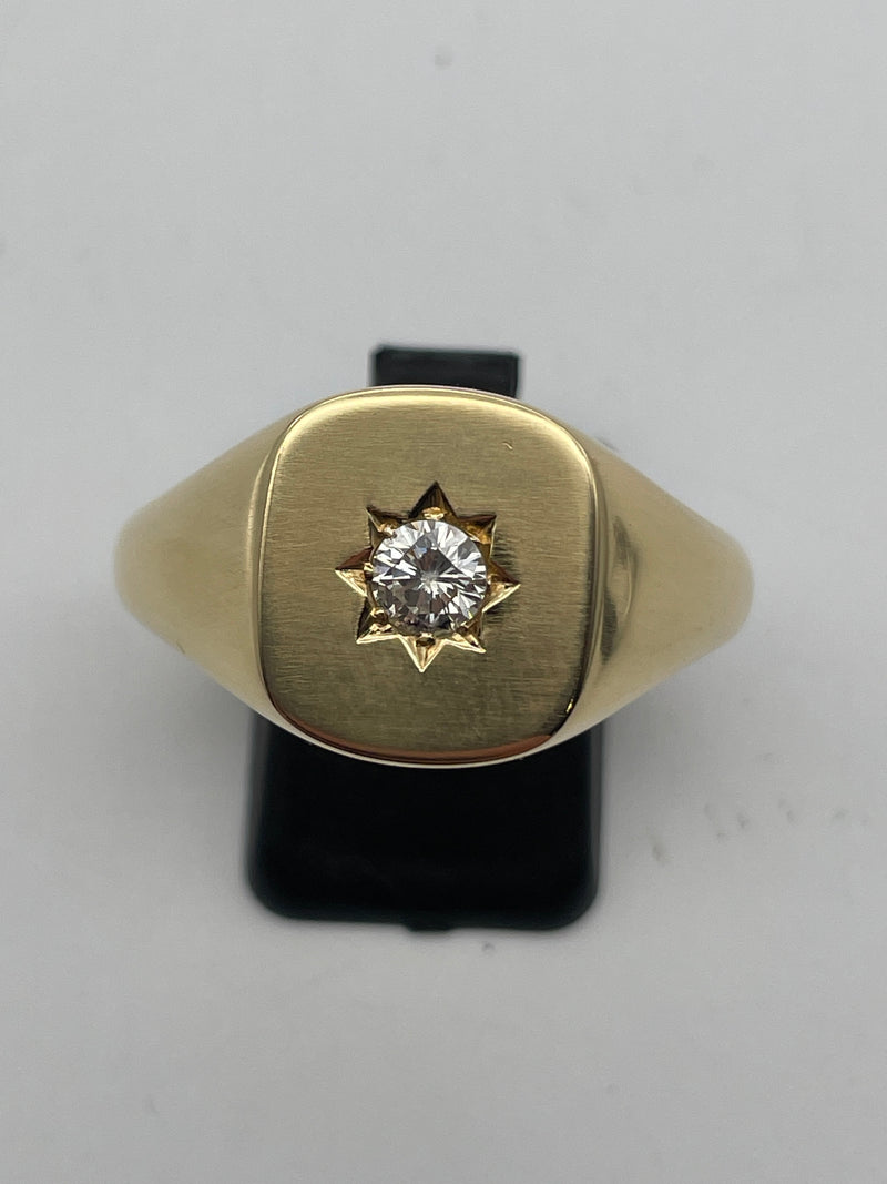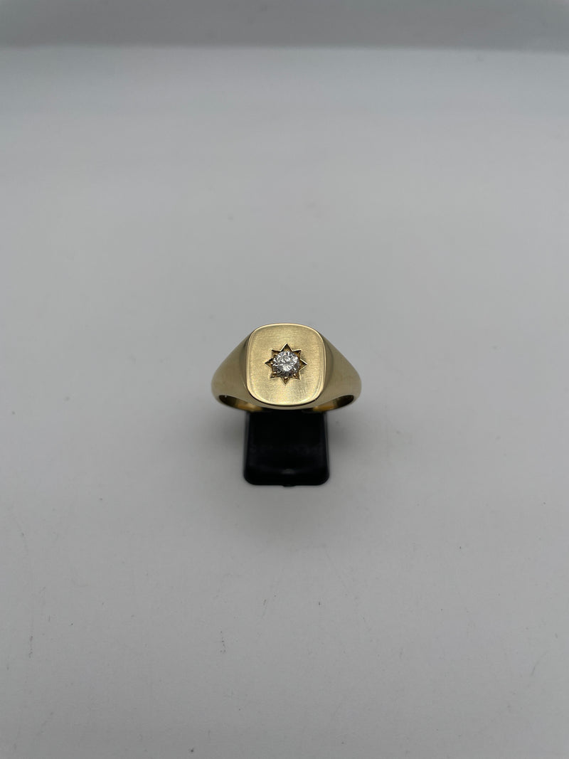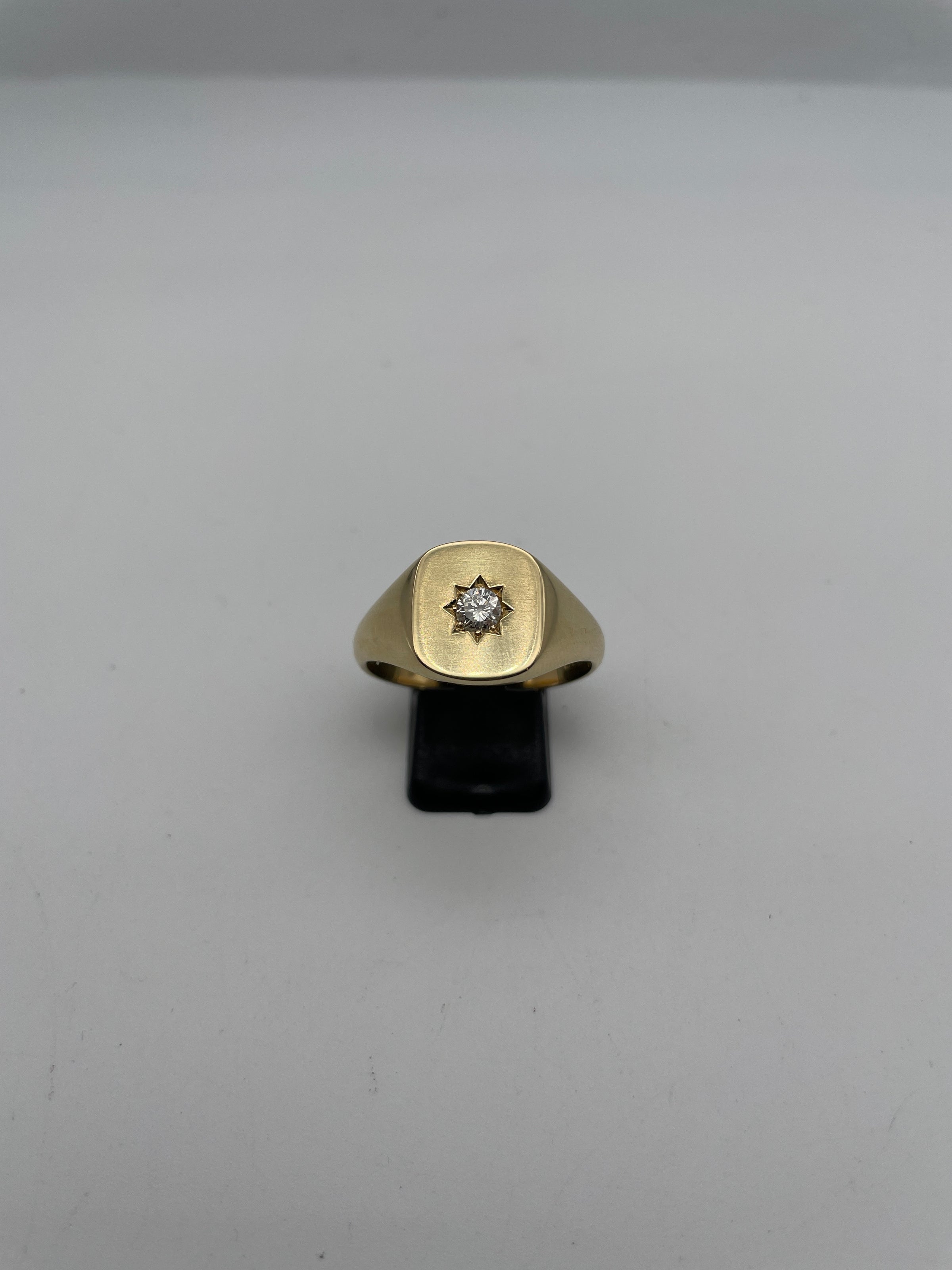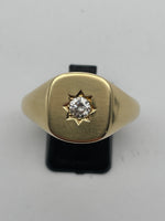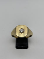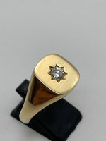 A Perfect 18ct yellow Gold Gents Signet Ring set with a brilliant cut diamond in a gypsy style setting.