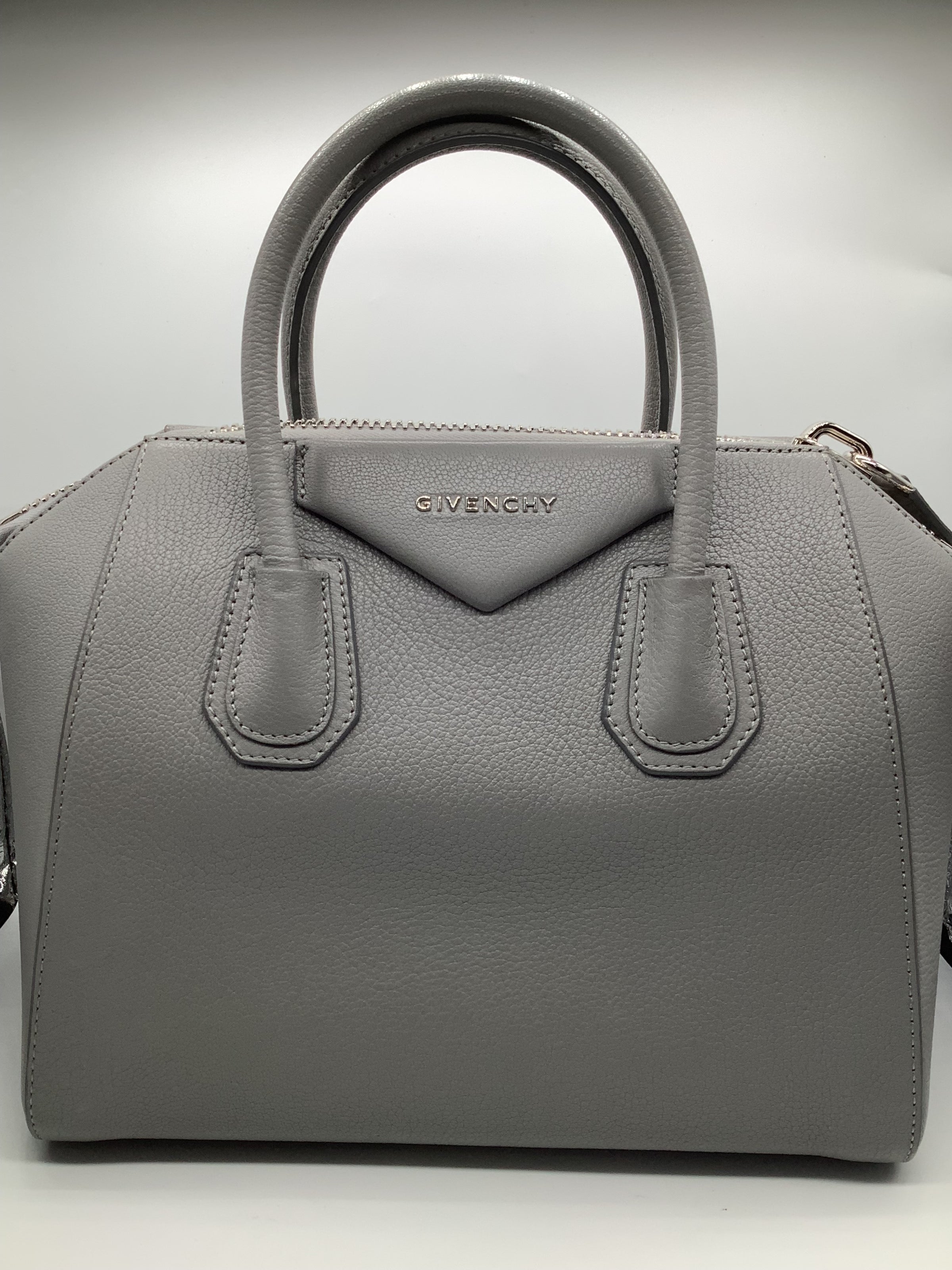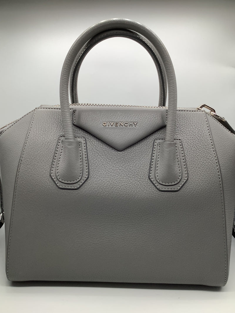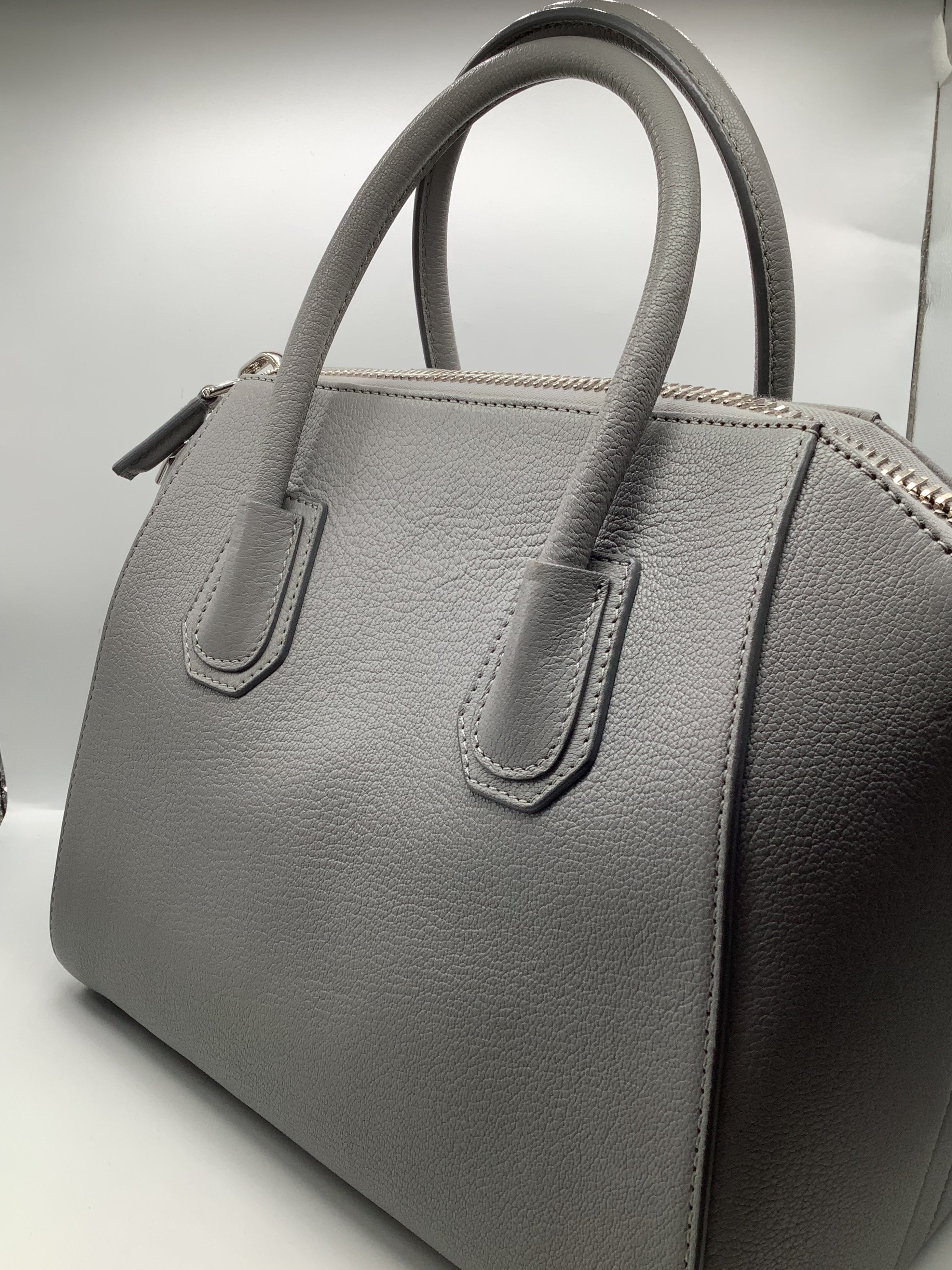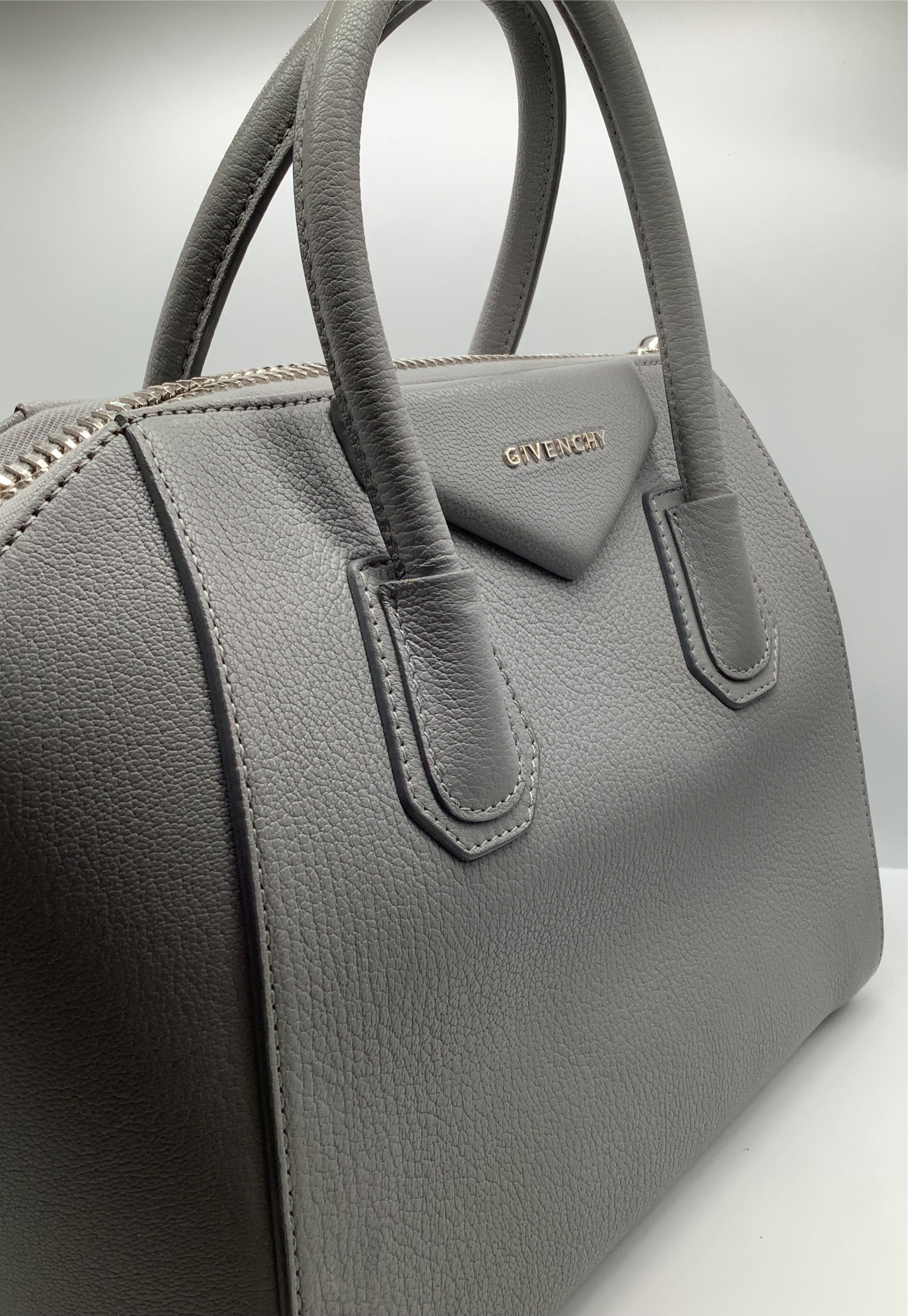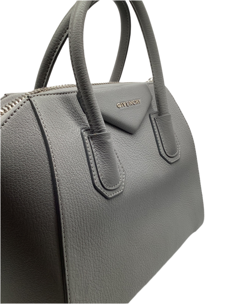 Small model Givenchy Antigona handbag in Grey Grained Goats Leather, hardware in silver metal, double handle in grey leather, one removable strap in grey leather allowing the bag to be worn in the hand or on the shoulder.