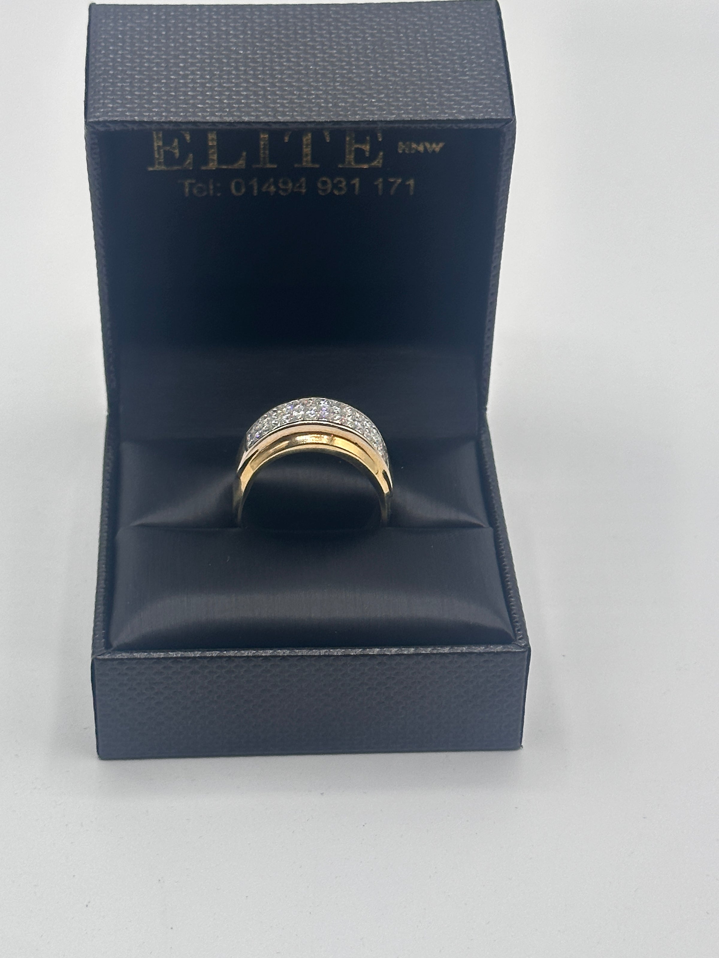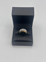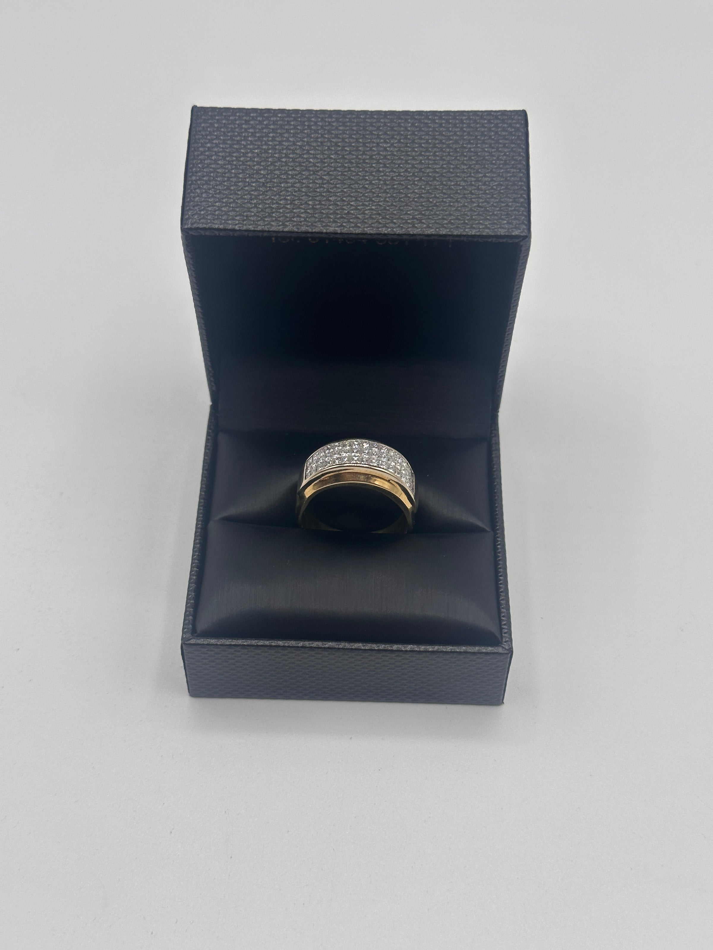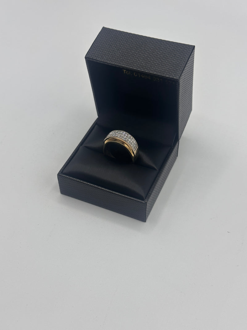 This stylish gents yellow gold and diamond ring comes with three rows of diamonds on a raised mount. There are 45 diamonds in total.